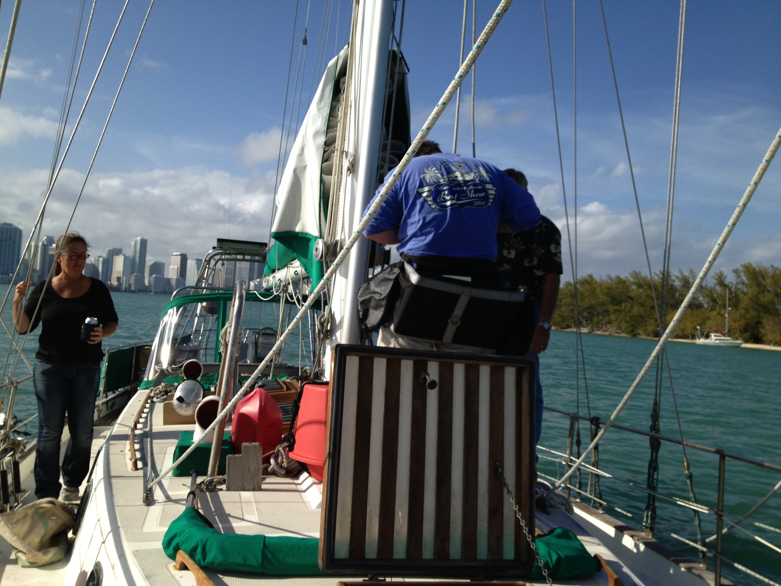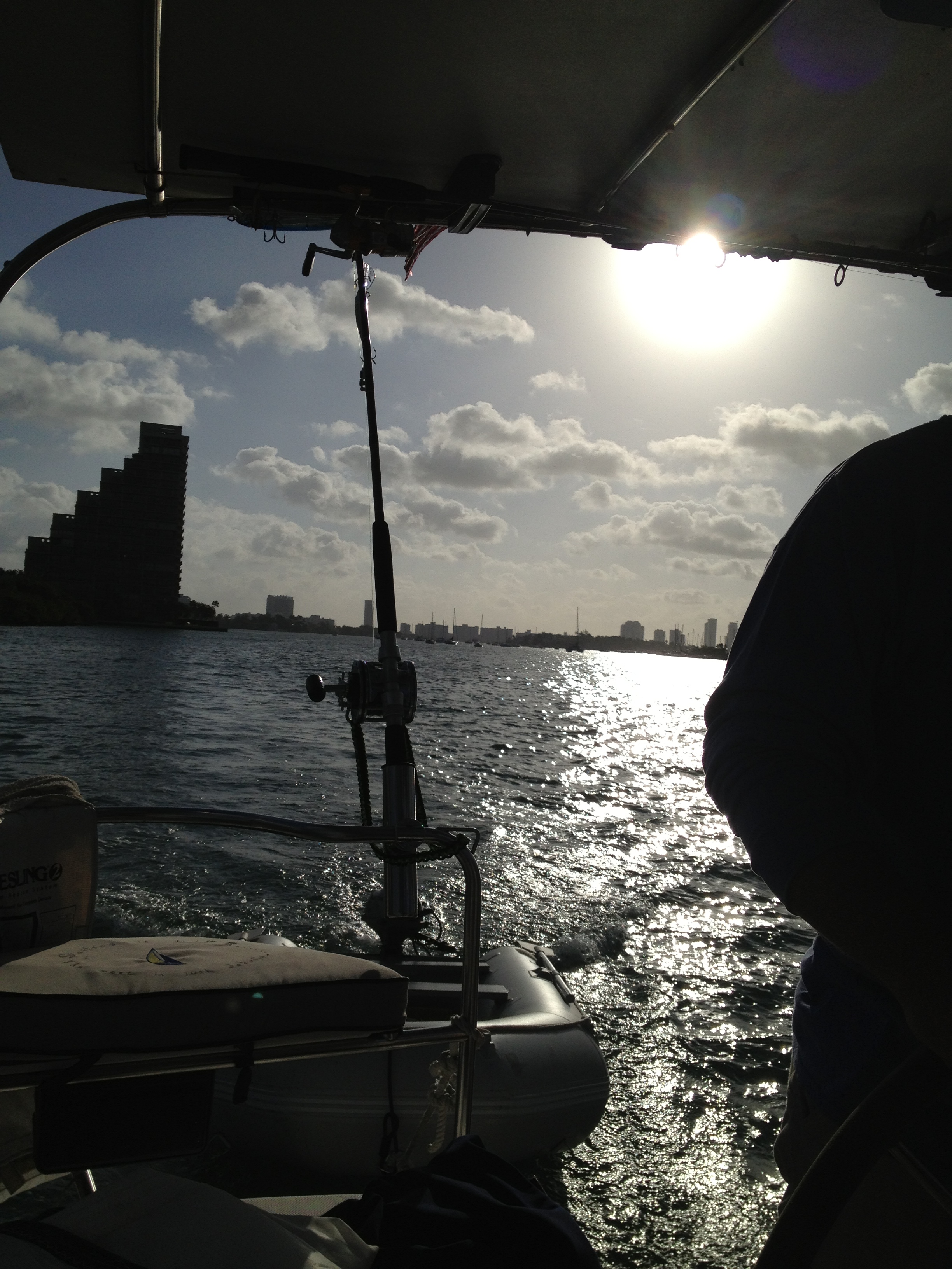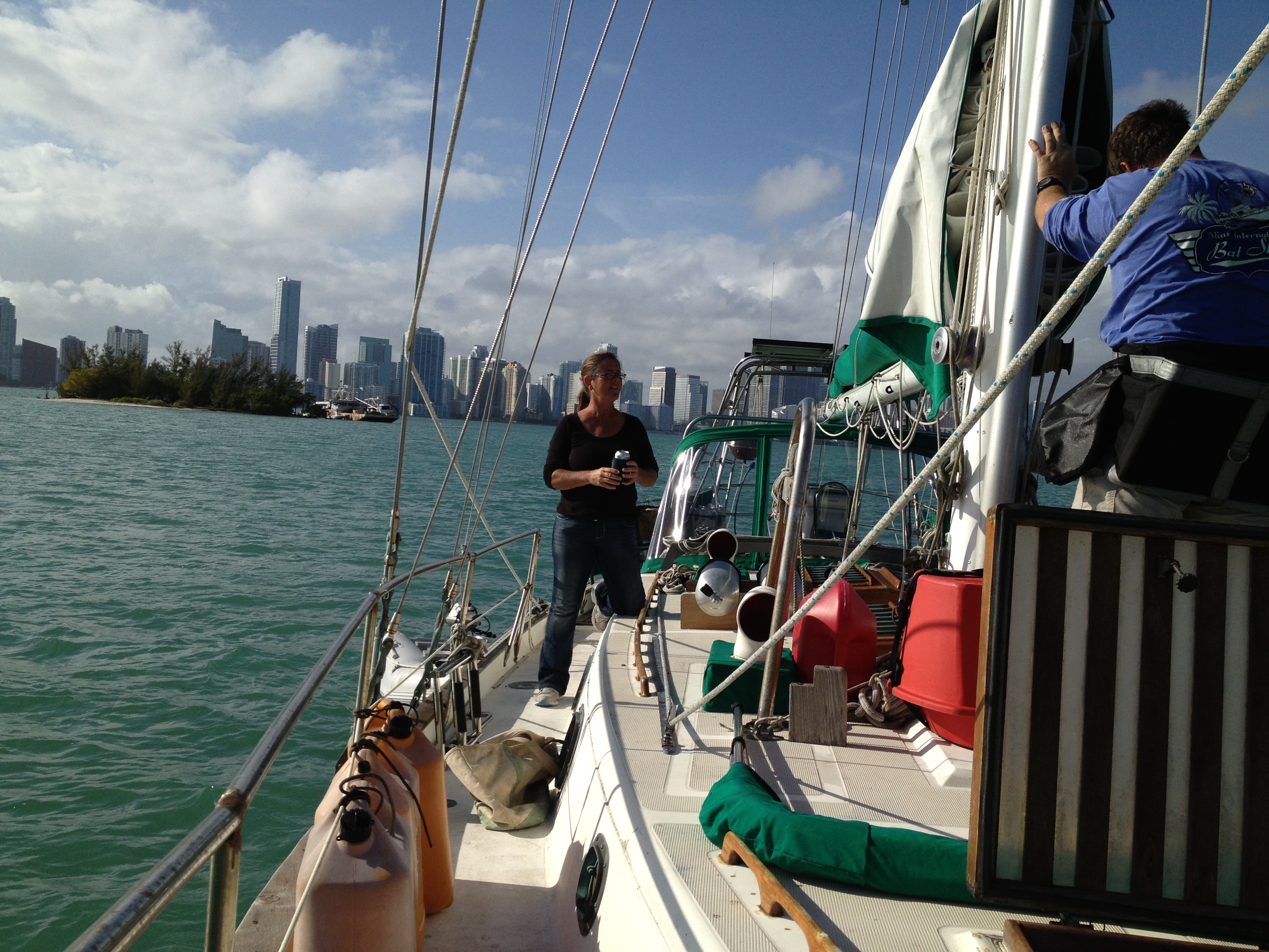 OK here we go, i put up some pictures of us in Miami and i hope everyone likes them. We are getting ready to leave for the Bahamas tomorrow sometime so i dont know if i can post in the Bahamas or not. We were told that you can buy a card for internet and cheap phones too. I have to have my phone cut off i have heard horror stories about Verizon , ATT and other phone companies charging unreal amounts for incoming calls and texts. So the phone is off until i get back. JJ is going to come by and pick us up later and take us to the store and bring us a package from home. Meanwhile we are going to get gas and water from the dock close to us. They charge a dollar a gallon for water at this joint. I can understand the keys due to fresh water storage but not Miami. Steve took off in the dinghy with Dan to get gas water etc. I dinghied over to see Ally for a few minutes.while they were gone. I dropped my water bottle in water and had to get in dinghy and go retrieve it. I later dropped a gallon jug in water but we took too long to find key for boat and it was too dark to retrieve it. JJ arrived around 4 and we took off for Wal Mart little did we know how far it was and how BAD traffic was going to be it took us about an hour to go 6 miles. We finally made it to Wally world and got our supplies and had to wait while the credit card company had to reset card due to the security that puts it on hold every time we go shopping almost. We called and notified them of our movements weeks ago but still have to call due to card being denied. I love the security but it can be frustrating at times. Back to the truck then a search for diesel to fill our tanks. JJ was a trooper and i hope he knows how much we really appreciated his help. I learned not to trust Siri with true distance, the distance she gives me is always wrong. Back to the boat with all our loot, we unloaded the truck in front of the gate to the marina and i found 2 buggies and the night man let me use them to take our stuff to the dinghy. We thanked JJ for all his help, he took us all over Miami and all he got was a lousy t-shirt. LOL You have to be without transportation before you appreciate it like we have learned to. After filling our boat with all our supplies it looked like an overstuffed pillow with stuffing hanging over the sides, with me sitting on top and Steve squeezed in at the back we took our time getting back to the boat. We had no choice we had so much weight on the dinghy the front end was flat on the water and water was trying to come over the front, but we were going so slow we stayed dry. Unloading and putting away took the rest of the night and we were exhausted by the time we were through. Which was about 1100 PM. Well goodnight everyone more tomorrow.