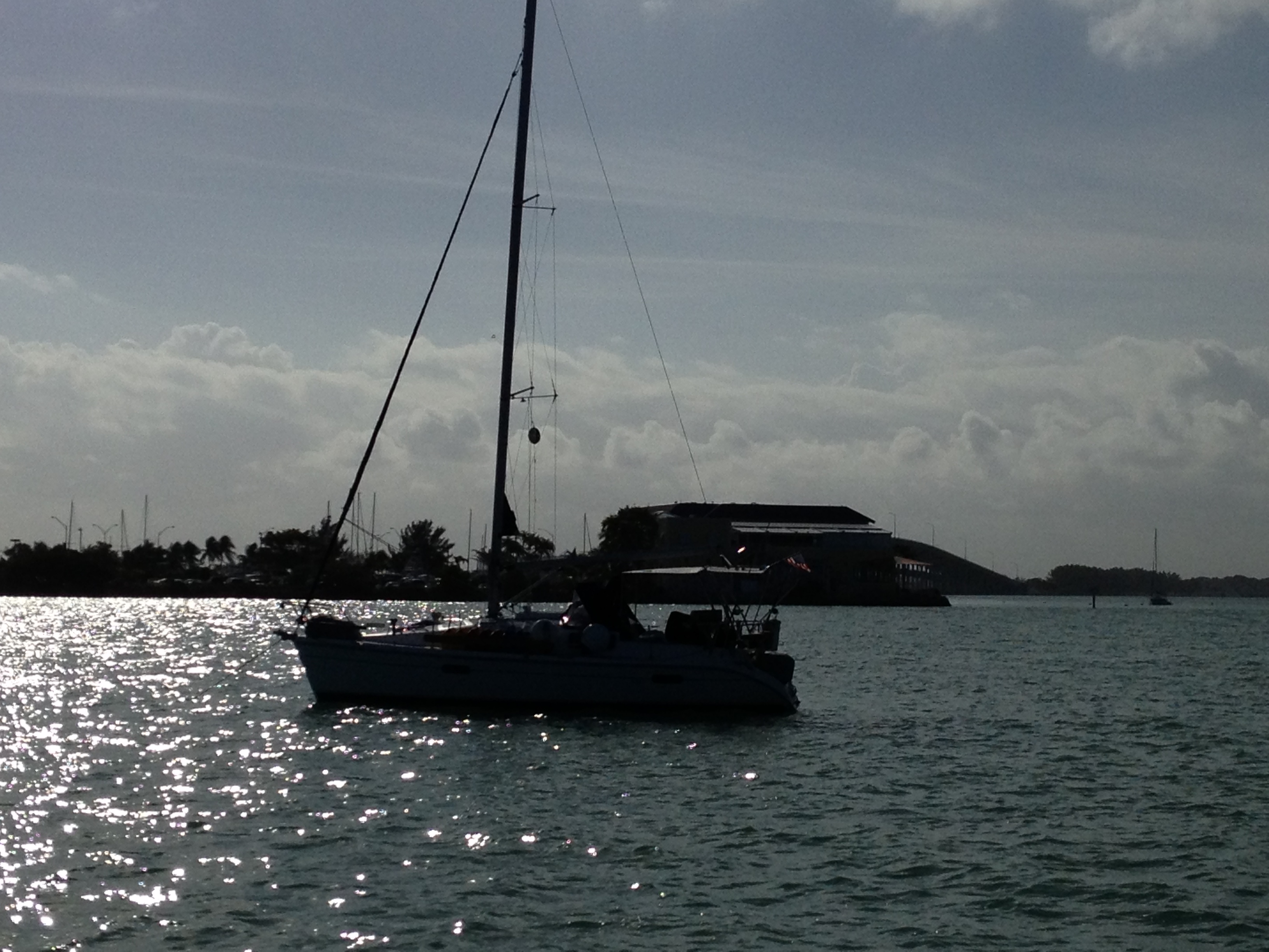 Night sail to the Bahamas.. We got out early pulled anchor and battoned down the hatches for our sail. It was nice weather and i was excited to see Miami go. Our sail was very good the stars were shining and we were excited to take off. We had dinner with Dan and Ally watched the “worlds fastest indian” movie and headed back to boat to take off. Steve let me sleep a bit and i came out to help him when he needed it because we had both sails out and the wind was pushing us to the islands :-). It was calm water and a great sail, i was happy i know that. The gulf stream can be a beast if you go at the wrong time. The water was so beautiful as we begin to make our way closer to the islands, we could see Gun Cay and Cat Cay(pronounced cat key). The breakwaters in the inlet rocked us like a ball rolling back and forth but once on the other side it was calm. I could see through the water all the way to the bottom. We motored the boat into CC and Steve and Dan went in to register us and make us legal in the Bahamas. Well Cat Cay is a private island and very very exclusive, they wanted 100 dollars just to tie up while we registered. We couldnt ride the dinghy in to register you had to sail boat in. NOT! We went to gun key and anchored out (the key next to CC), i dropped the anchor and Steve got ready to go to Bimini (about 8 miles away by dinghy). The dinghy is faster than the sailboat so it is easier to do that. I put on my bathing suit and got into the water (soooo clear), Steve threw me a snorkel and mask and I headed to the shore snorkeling all the way. It was about i guess 75-100 ft away and saw 2 barracuda and one pretty parrot fish. It watched me as i swam above him and turned to continue watching me as i swam, but the barracudas watched and one swam away and the other followed me for about 20 feet swimming behind and around me. Surprisingly i wasnt nervous, he was just curious and finally swam away. What i did not remember was to take off my shiny silver necklace which they like i guess he thought i was too big to fool with he was only 3-4 foot long. I took off all my jewelry when i got to the boat after Steve said, “maybe it was the big shiny necklace you had on”. I was told later that a nurse shark was there but i did not get to see it. They are very docile. It is the bull sharks that are here and they are aggressive. I got to the shore and did not believe the whole beach was covered in live conch (pronounced konk). They are eaten a lot here i will have to try it. I saw all kinds of snails living on rocks and the sand was lovely. I found an empty small conch shell and got ready to swim back to the boat. By this time Steve and Dan had been gone so i looked back over the water and hoped no sharks were near. 🙂 I swam/snorkeled back to the boat did not see any more fish just underwater conch, climbed back on to the boat and got dry. I am loving this! The clear water with the sun bouncing in beautiful glittery spots off the crystal clear azure blue sea green water. Steve cam back and we hung out on boat watching the water and just enjoying the view. It took 3 hours to get all our legal stuff taken care of. I cooked some tacos and we sat outside and enjoyed the view. Steve fell asleep due to the fact he had been awake all night, I did relieve him but only for about 3 hours and he lay beside the helm on the cushion in case he was needed. He is a great man and a great captain. Everyone we meet here loves to talk to us.We were going to have a bonfire on the beach but Steve was so exhausted i let him sleep he slept all night. Stay tuned for more tomorrow.