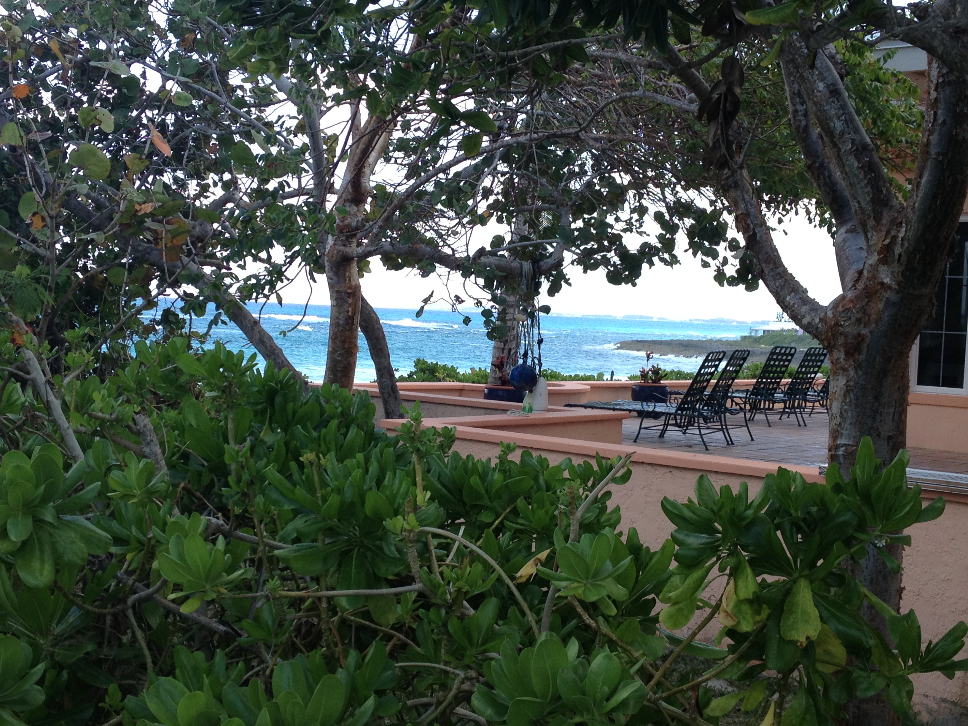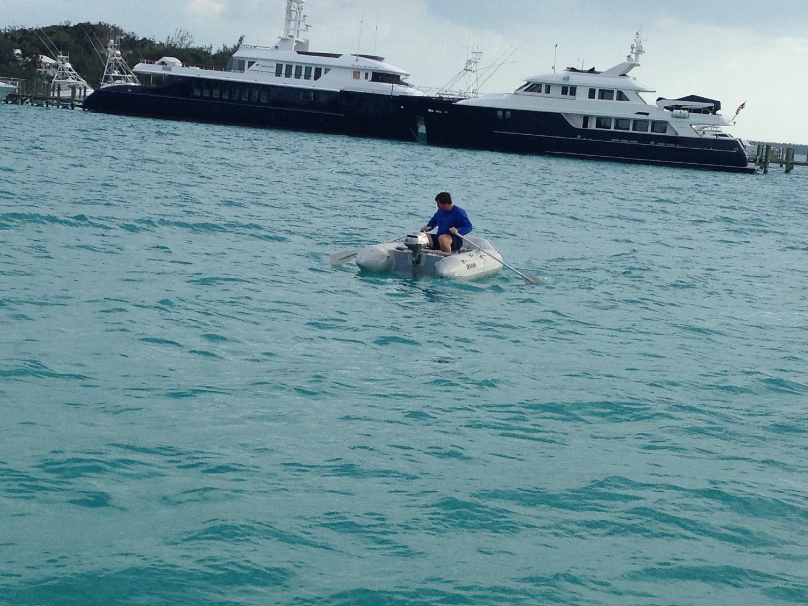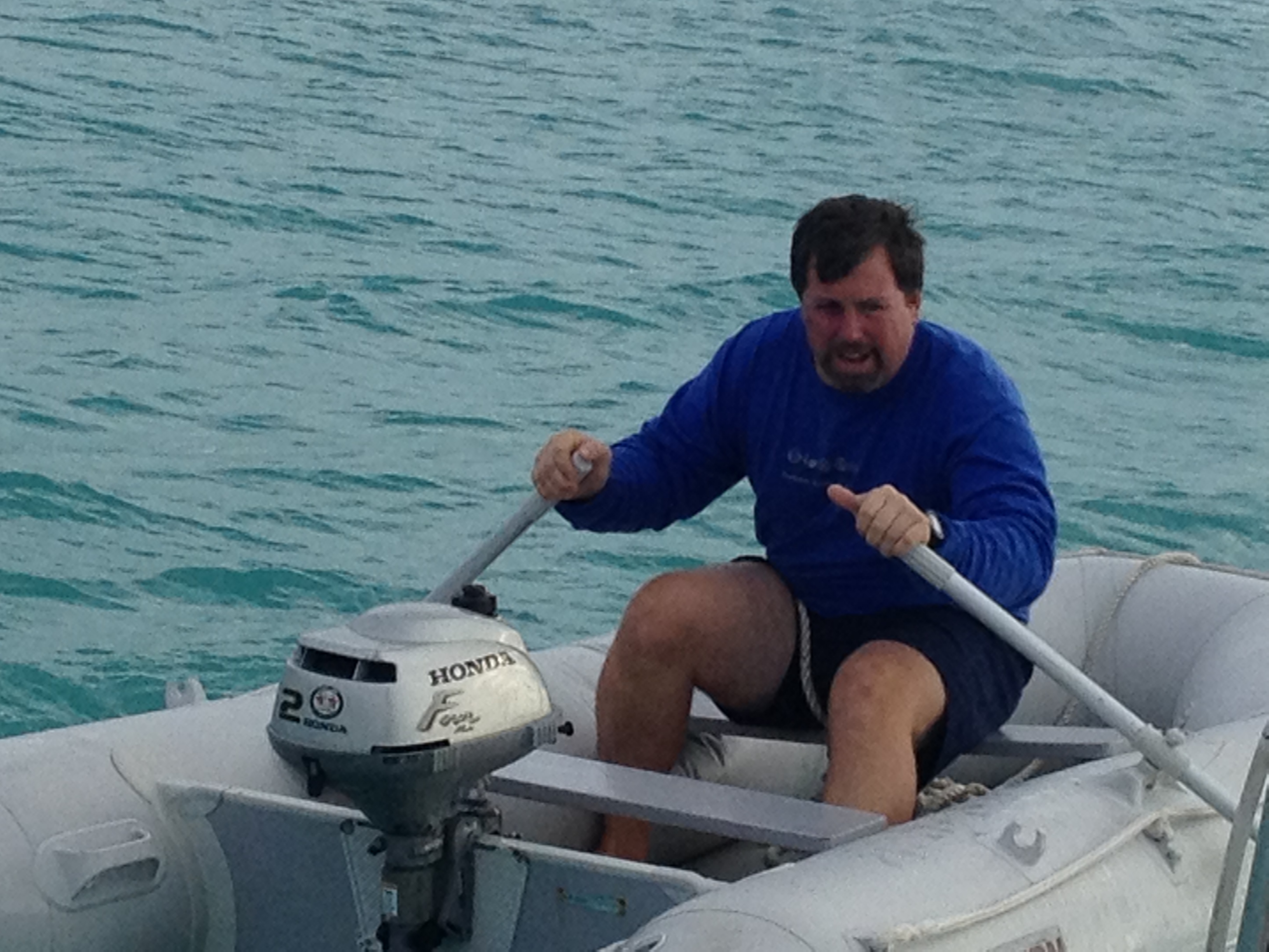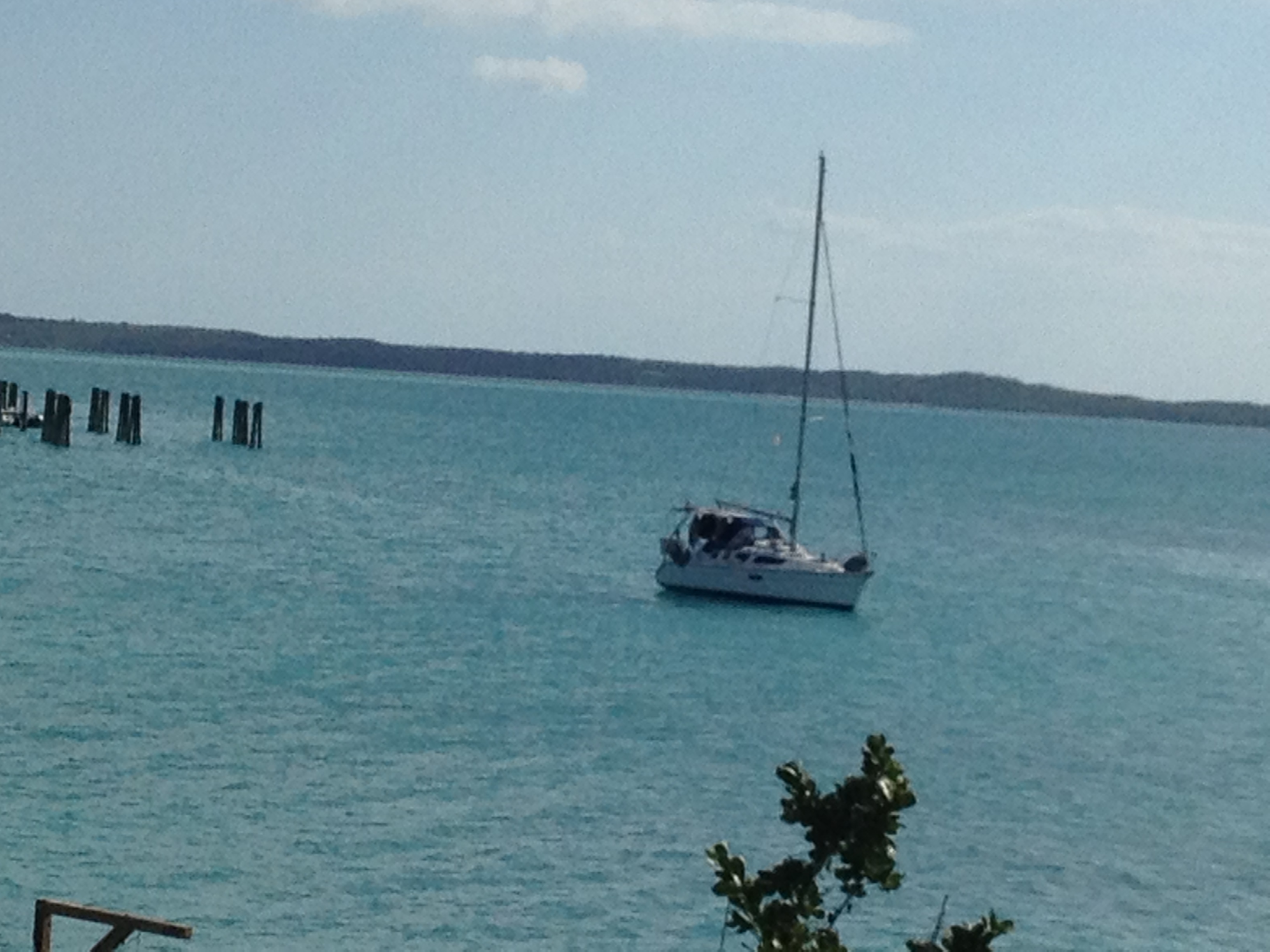 Ok had a wonderful meal last night of Conch Fritters and Conch Salad. We ate with David and Debbie at a little place by the water and watched a beautiful sunset. There several multi million dollar yachts here. This is a small island so I guess this is where some people come to get away from everything 🙂 Steve and I saw a few high end restaurants that cater to the rich and they have several resorts on the beach, the pink sand beach on the other side of the island. We are moving our boat again today so whew up with the anchors and across the baywhere the wind will be blowing much less. We will stay there and come back to bay close to town when the storm moves away. The other side of the bay is the place of three islands called the three sisters. Each island has a private resident on it. Behind those is the other side of Eleuthera ands Spanish Wells. So we have plenty of protection. Well we are anchored out and have found out that there are two lobsters living below us. And there are thousands of flies here! Yuk! So begins the massacre. Flies Beware! I sat on the stern and finished the para cord rope to pull up the swim platform with. After that we retired to bed to end another exciting day in the Bahamas!