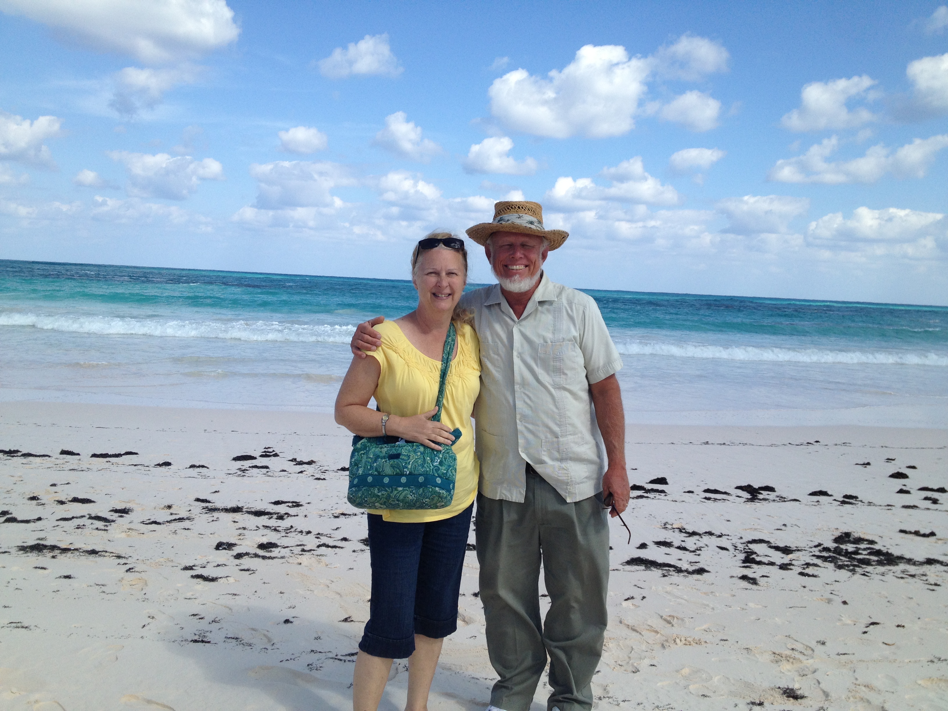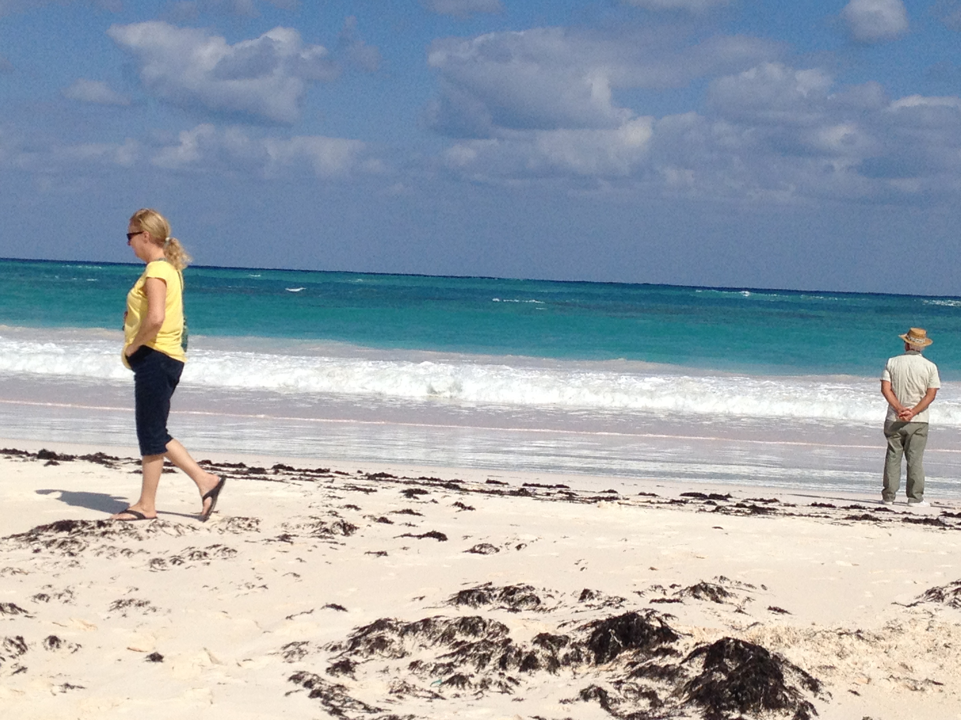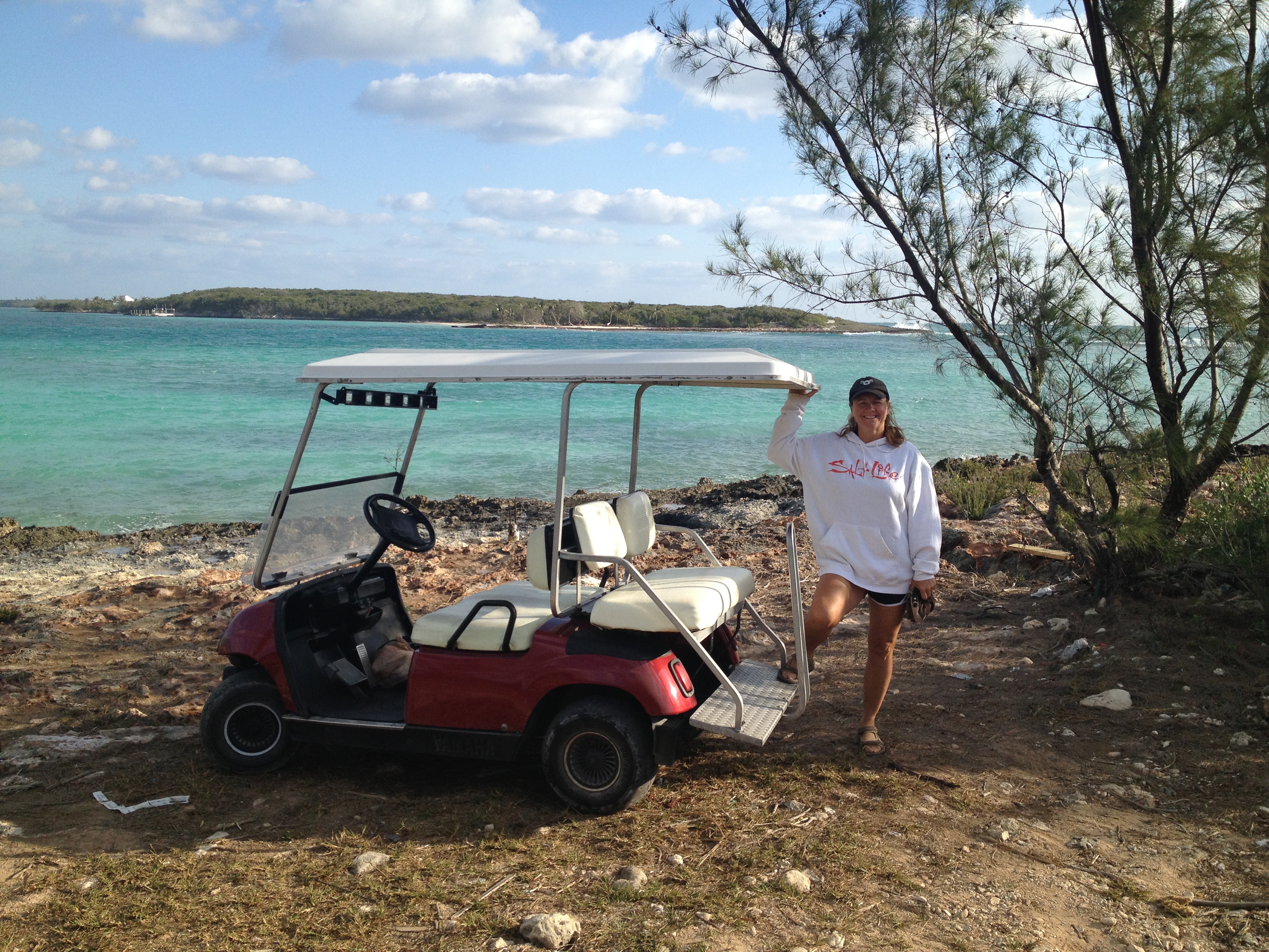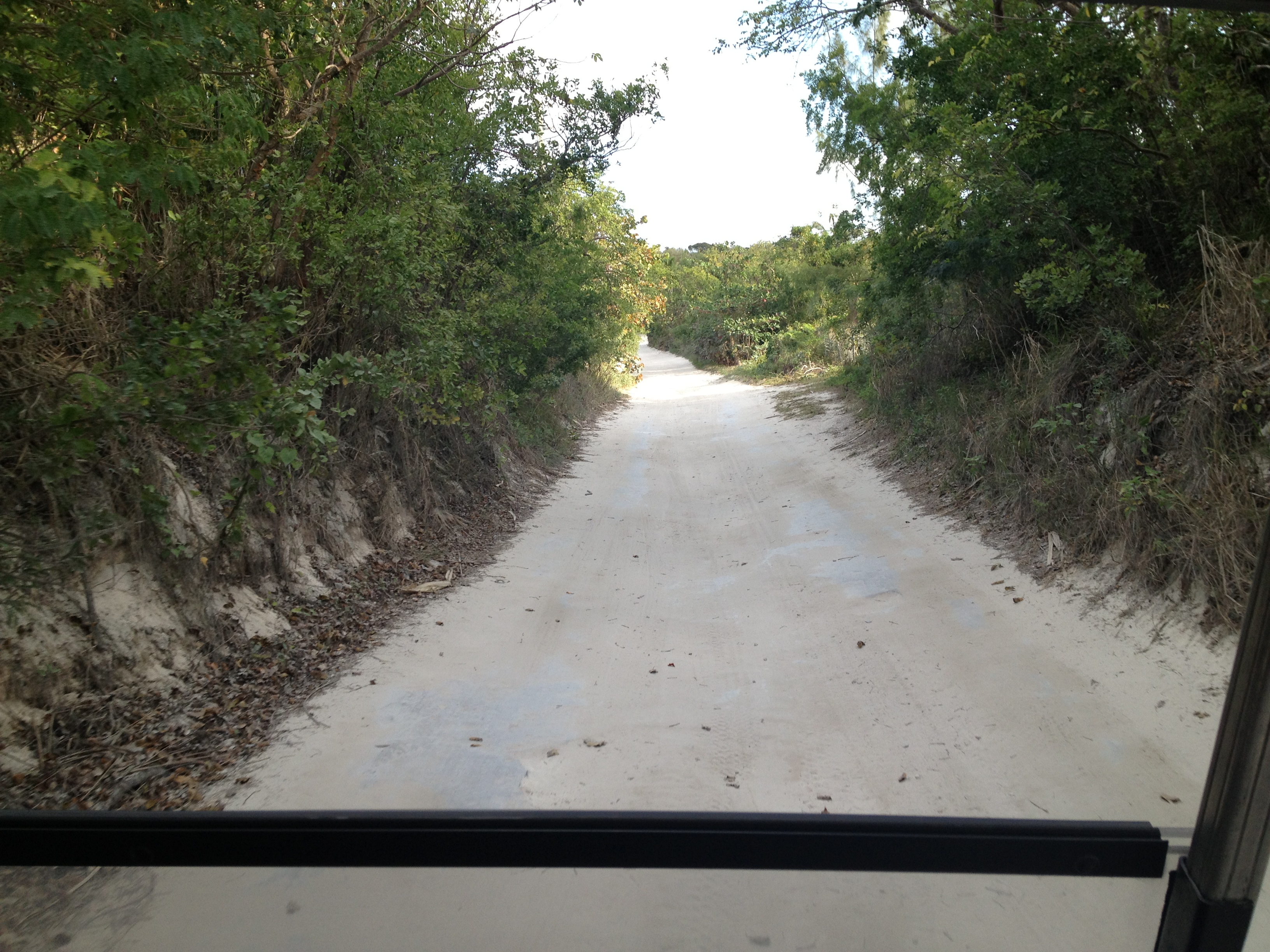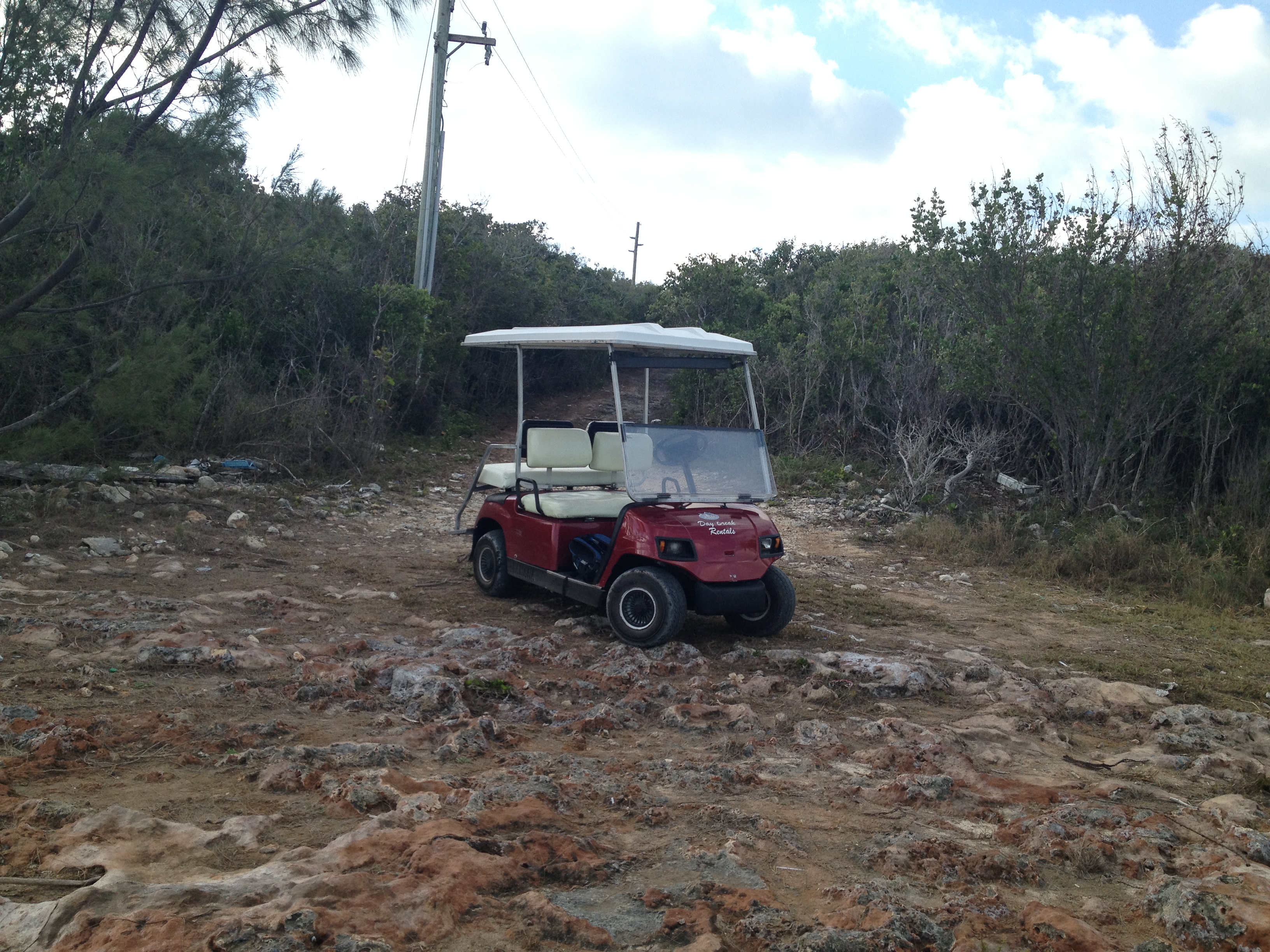 Going to go to the island to wash clothes and explore some more. Started to walk to laundromat and as we walked we came by a cart rental place and decided to rent a cart since we had 3 bags of laundry. I rode in the back seat with the laundry bag and steve had 2 up front. We arrived at the bright purple laundromat and i took the clothes in and started to load the big washer. They cost 2.25 but you are charged 9 dollars per load. It costs 2.25 for the dryers too and that is all they charge probably due to the fact it takes 6.75 to dry them(almost). I finally got through with the clothes, the owner was very nice and had been a world traveler. She was very educated and very nice. Steve did well waiting on the laundry and we finally were off again. with one wet back that didnt dry after three times in dryer and the rest, back to the dinghy, then wet took off on the cart and found the dirt roads(of course golf cart 4 wheeling).Down this dirt road we found the hidden houses of the rich. We went all the way to the end of it up and down hills and bouncing like a four wheeler to the edge of the island by the sea. That was a fun ride we found several different places to buy food and the dentist and another laundromat. After that we went to the boat. We got the clothes unloaded and took our friends David and Debbie back to shore to ride around the island on the golf cart. They were excited to get to see the town as “tourists” because they are usually working with the churches and dont get to see everything. We went back to the pink sand beach and i got a bottle of it to take home. We found a little straw purse stand a little back road and bought a straw purse and Debbie bought a hat and a necklace. We took them to the pizza place ordered a half veggie and half pepperoni and it was delicious. Junk food tastes so good when you cant have it all the time.