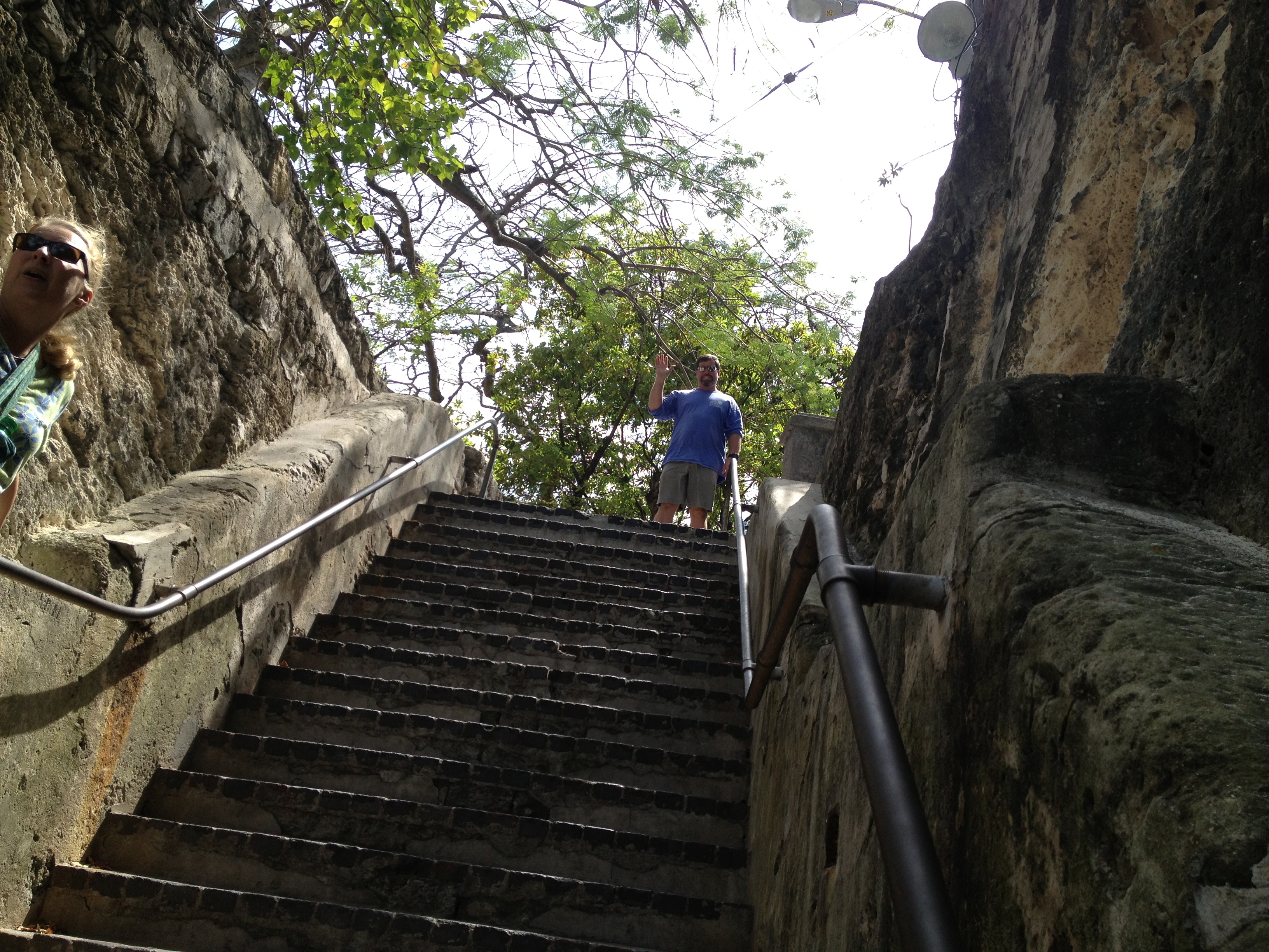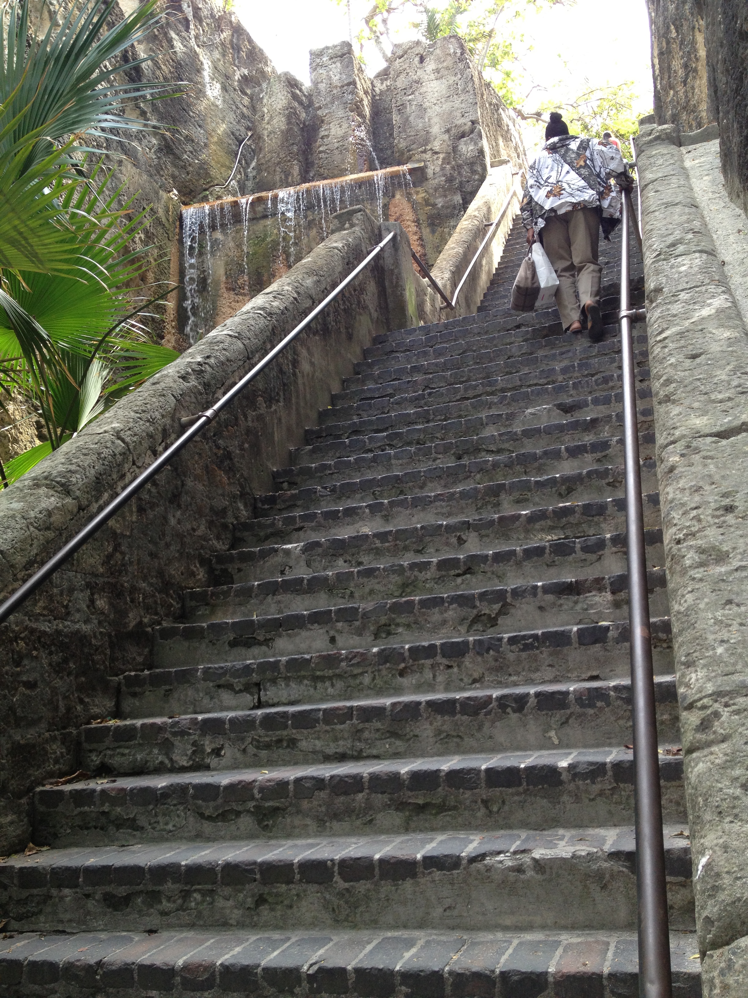Good Morning! Welcome to Nassau. We are headed to the streets today and the straw market to see what we can see. Ok we took the dinghy to a dock up by the cruise ship docks. Steve and Debbie and I disembarked and headed into town. We went to the Queen’s staircase looking like tourists lost in mid town with a map open between the three of us, lol. I put some pictures of the Queen’s staircase they are on Day 127. We left there after checking out the vendors with home made and imported items, then on to the market place by the cruise ship docks. They have a neat store there where we could pick up grocery items, and the straw market which is like a huge flea market. The items are pretty expensive. I bought a hand carved turtle and we had a wonderful lunch there at the flea market upstairs of BBQ ribs chicken and baked chicken with potato salad and rice/black peas. We wondered thru the rest of the market went to the Bahamian Bank and to the grocery store. Bought way too much and i felt like a weight lifter on the way back home. lol. We made it back to t he dinghy ( after we passed the Burger King). And Senior Frogs. We dropped of Debbie and unpacked groceries.