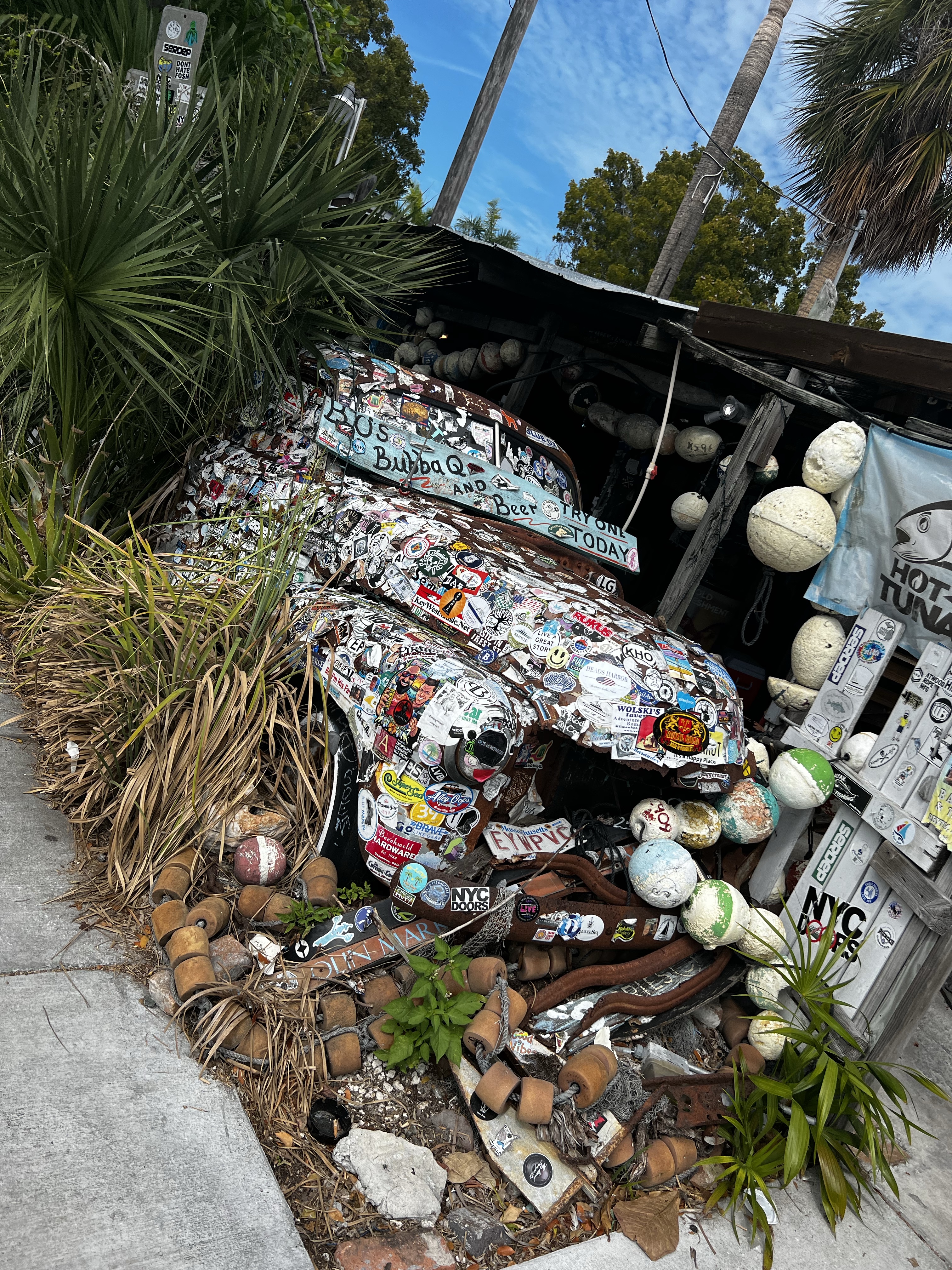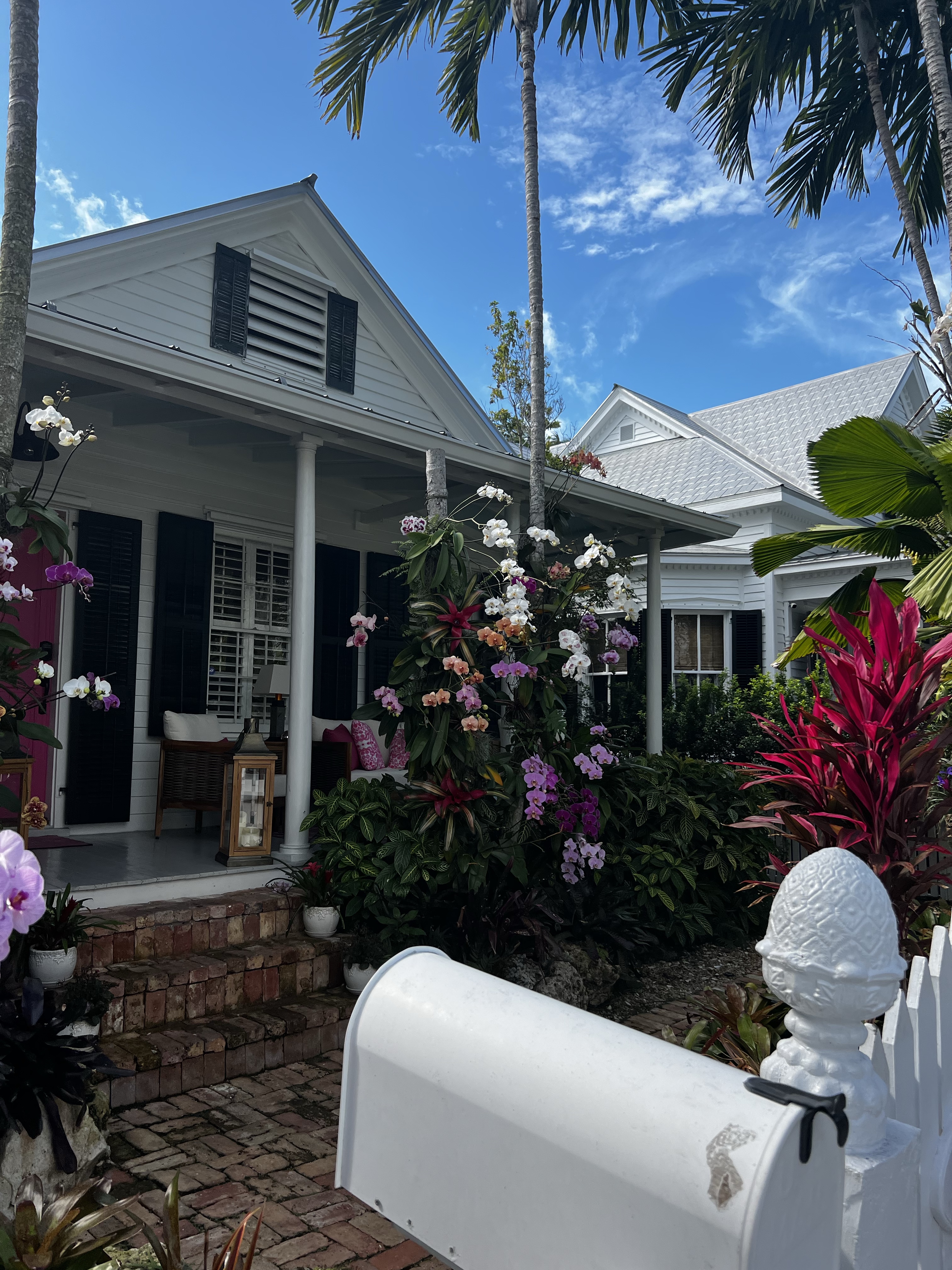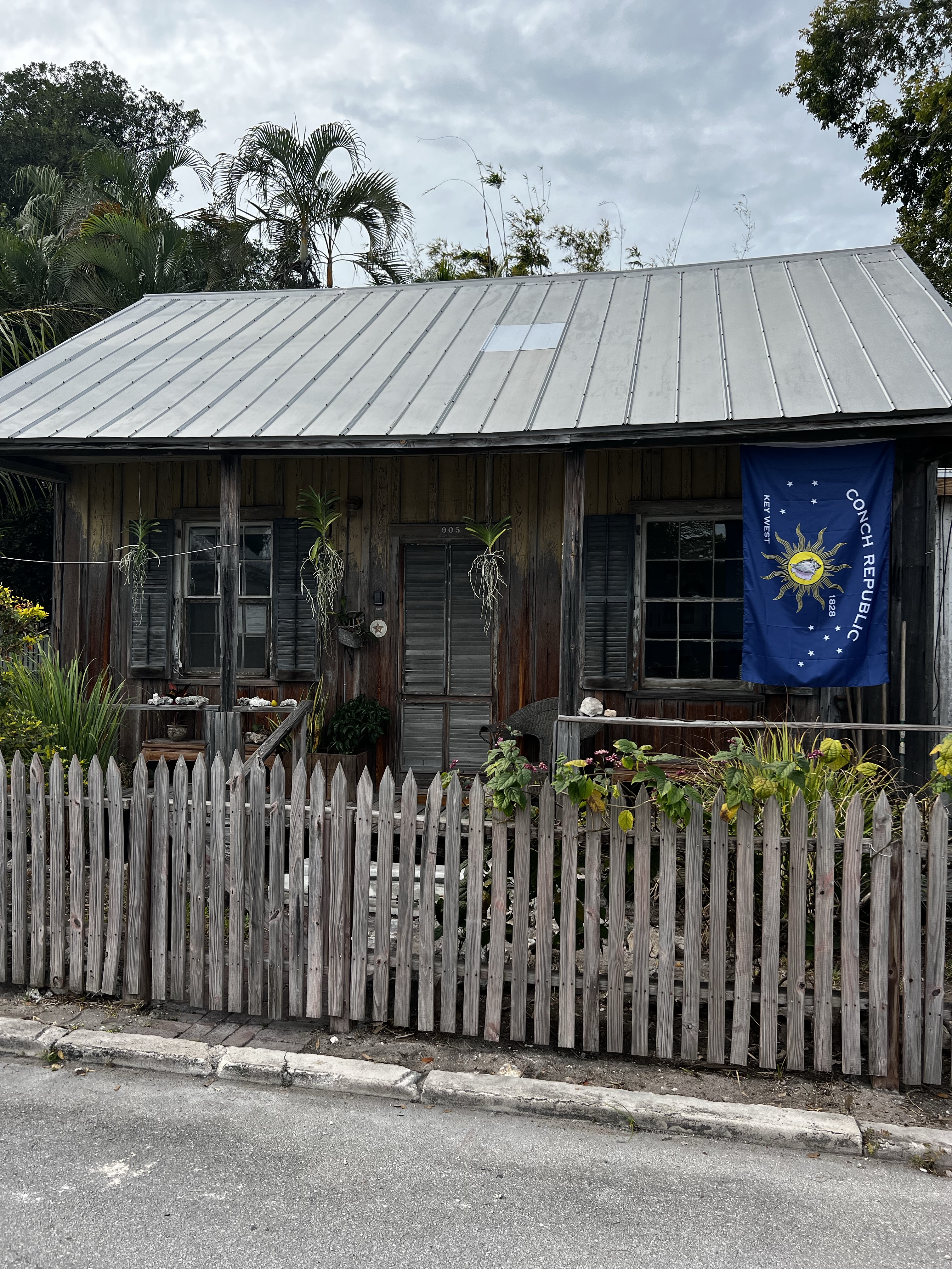 Feb11 Friday we got ready and dropped the dinghy and headed in to town. I had already scoped out the fabric store in Key West when I was in marathon.Hehehe😁 We ate at the boat house at the turtle kraal right beside the dinghy dock. Briggs and Tess were walking past us on the dock with their gorgeous Rottie , Nymeria! After we spoke for a while they continued on their Key West exploration. I left Steve to hang out while I walked the 15-20 minutes down the street past the beautiful orchids, quaint gorgeous houses and past the cemetery to Truman street. Talk about a beautimous fabric store…..I fell in love. They have everything from outdoor fabric, phifertex, knitting crocheting, and all kinds of notions. Beautiful fabrics of all kinds! Check out the pics,oh and a place (waiting area)with drinks and snacks for waiting husbands! I spent an hour or two there then headed back down the quaint streets the lovely island houses picked up Steve and headed back to boat with my backpack FULL of treasures! Aargh.😂