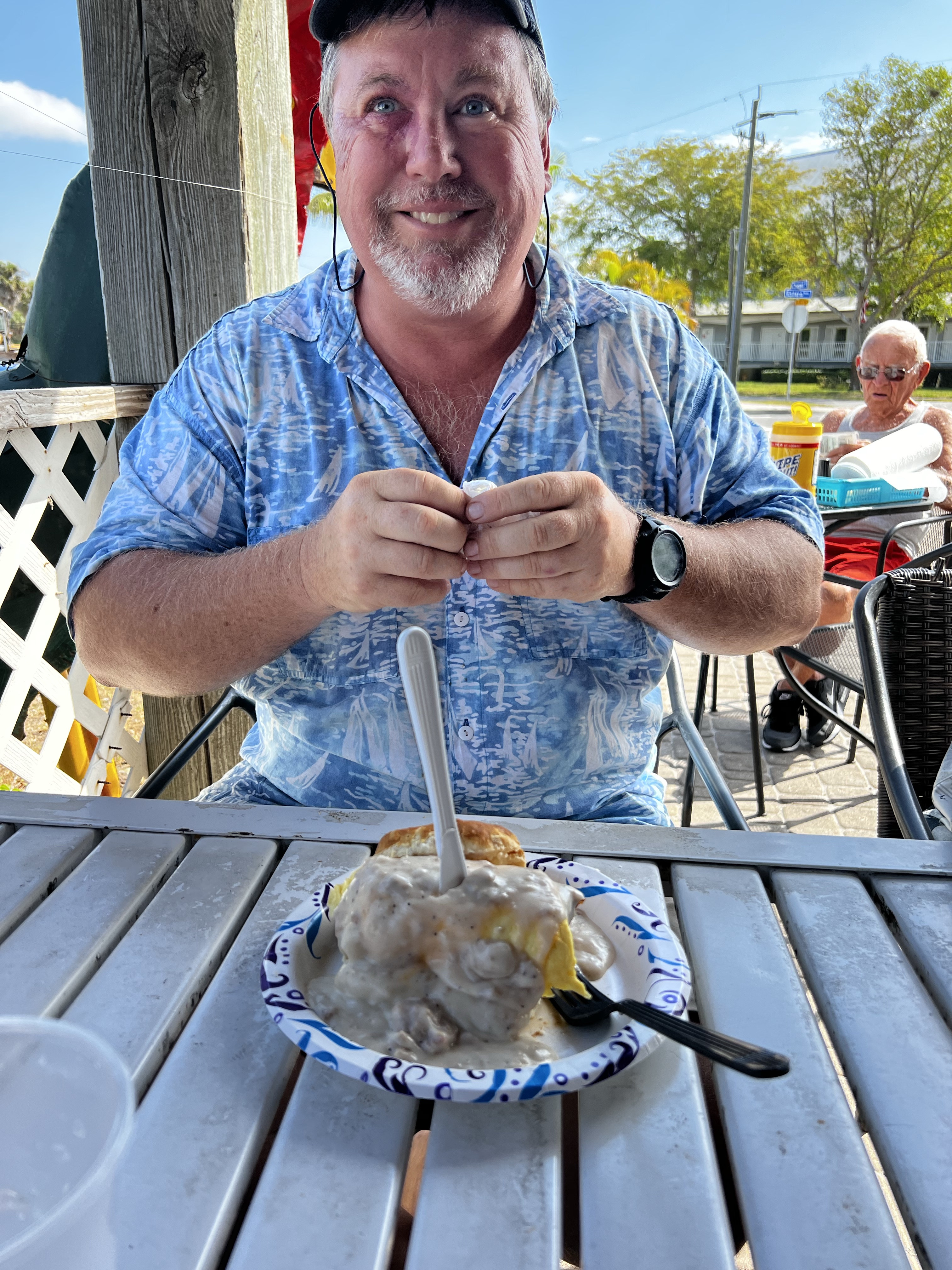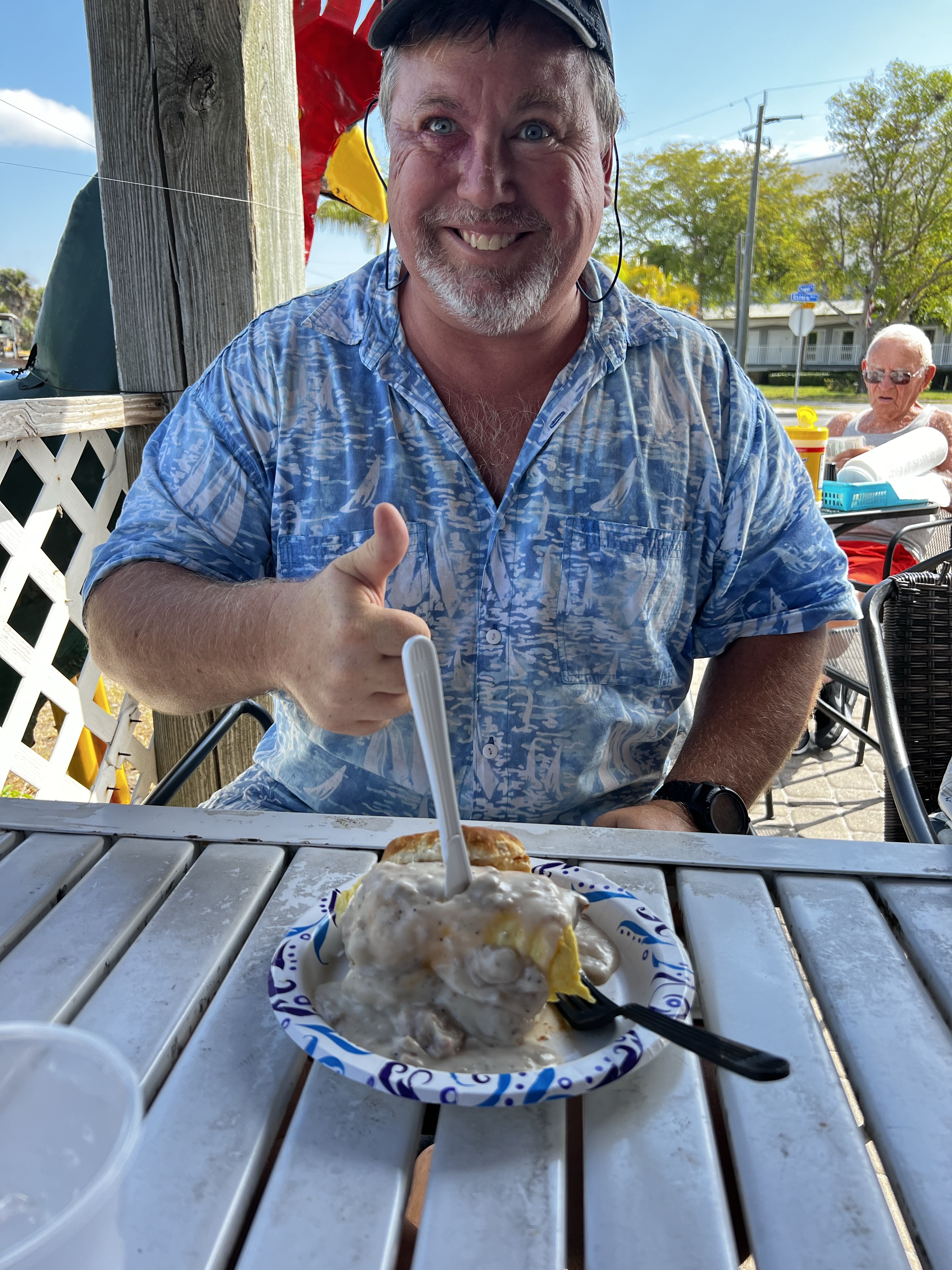 Woke up and decided to eat breakfast at MOMs, it is a restaurant started in Atlanta by a lady and she sold it to regroup in Florida(a much safer area). She had the best breakfast we have eaten in a long long time! So try MOMS when you are in ft Myers Florida. Afterwards we rode around just looking and found a little craft fair with some cool stuff, and a neat place for shirts called Tuna something. Went over the main bridge that connects ft myers to ft myers beach, in search of a mariners trading post (was mainly new stuff when we got there). BUT right next to it was an alterations shop and they let me see them work with some of my favorite vintage singers and juki as well as Pfaff. I was in heaven of course! We traveled a really cool thrift store and bought another laundry bag for my towels when i have to go to laundromat. Stopped at the seven eleven for an icee and onto the gift shop. Prices were too high for junk clothes so no sale lol. After traversing the several miles we went and Steve having to push his dead electric bike up the bridge we locked them up at the dock and went to the Matanzas Restaurant for dinner. It started to rain and our waitress already had a table inside for us. So while we were outside a pair of doves flew under a table and the lady sitting there fell backwards trying to shoo them away! Steve and i helped her up and she was so grateful she bought us a drink when we all went inside. Good people good people. Well another day gone so i am out. Good night!