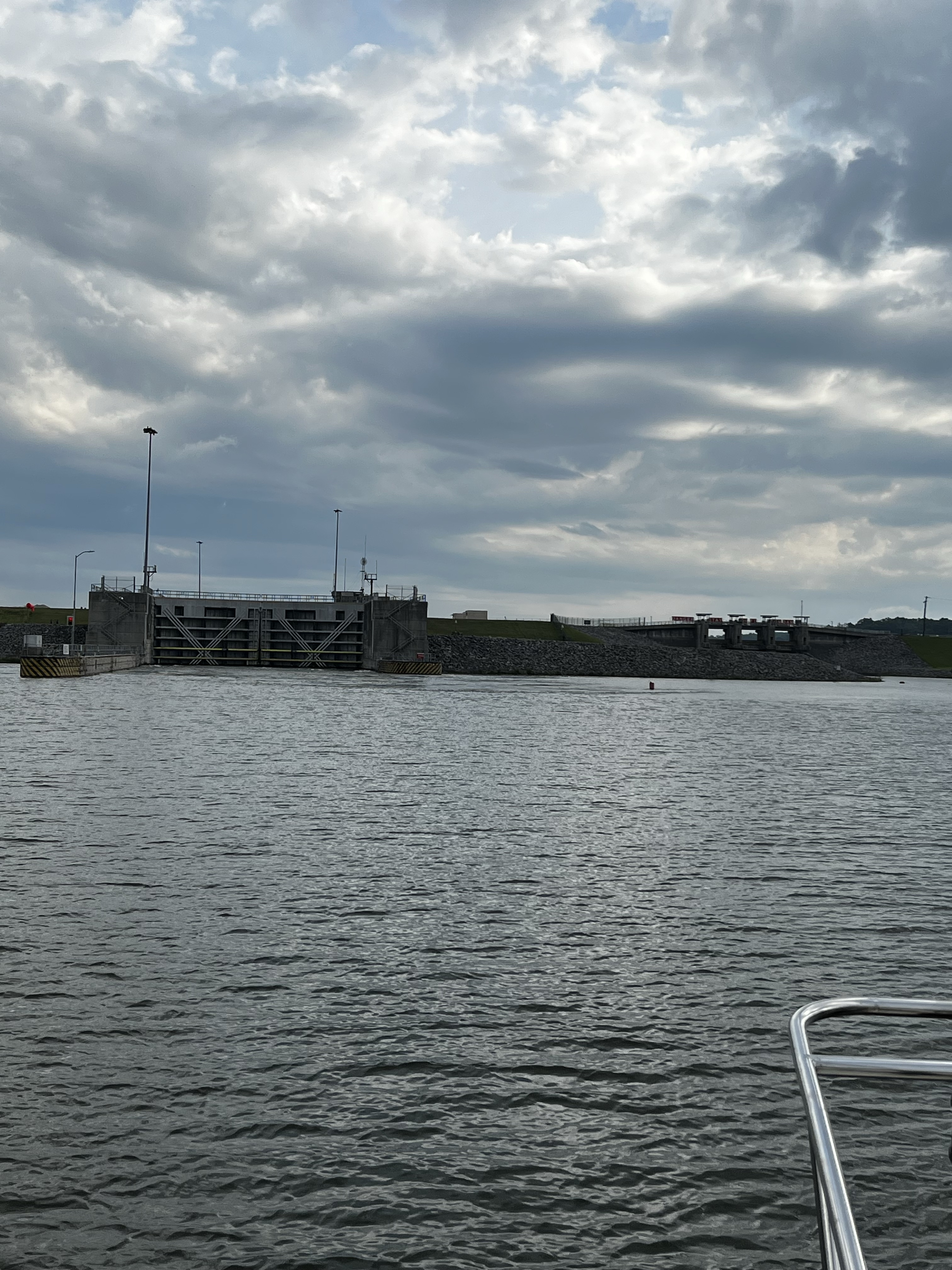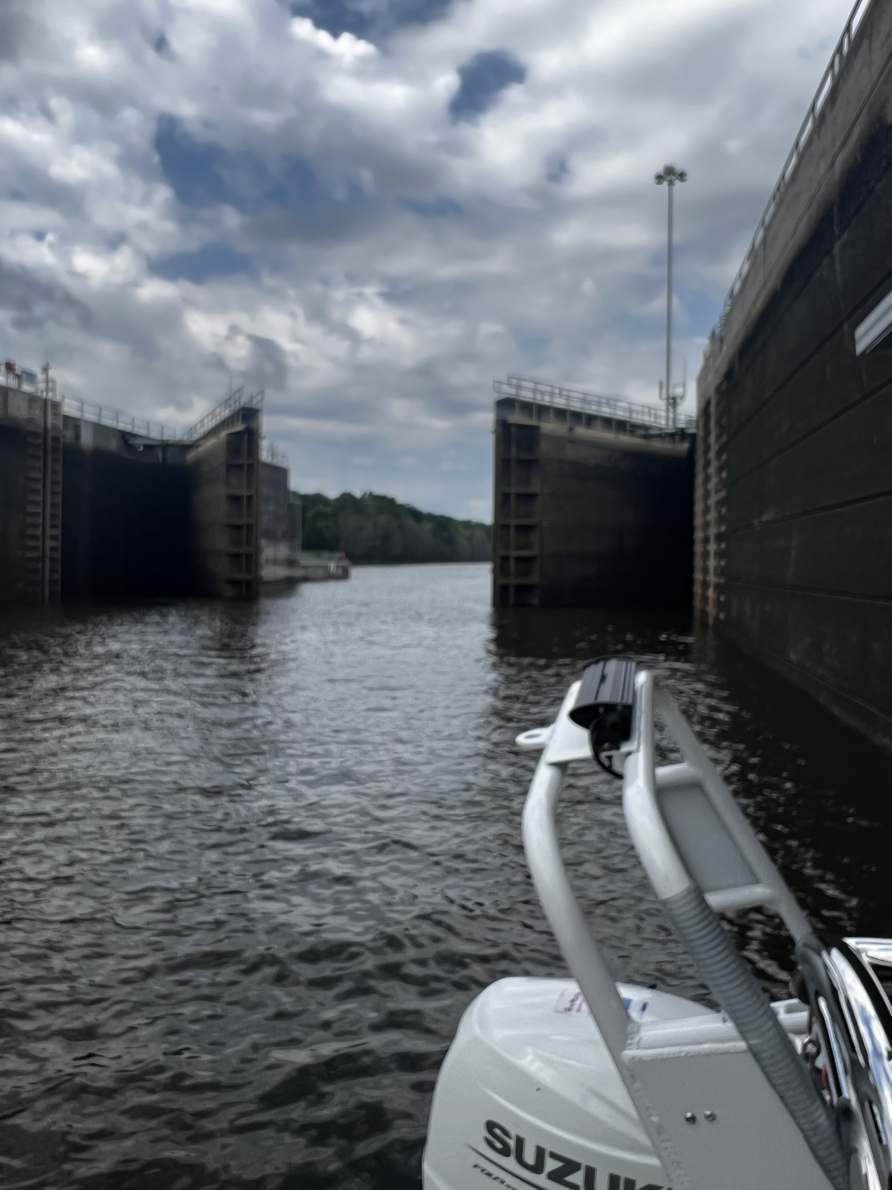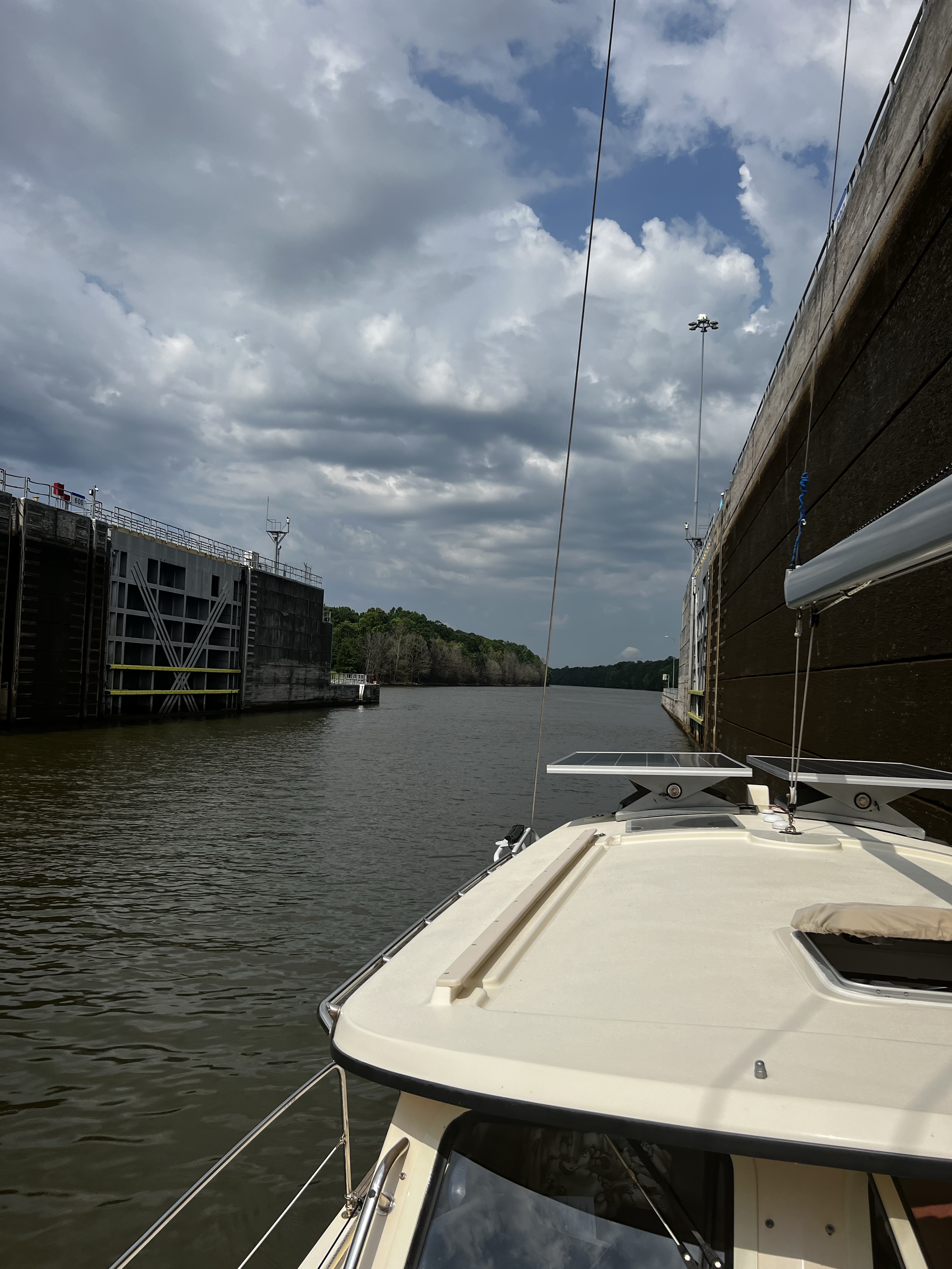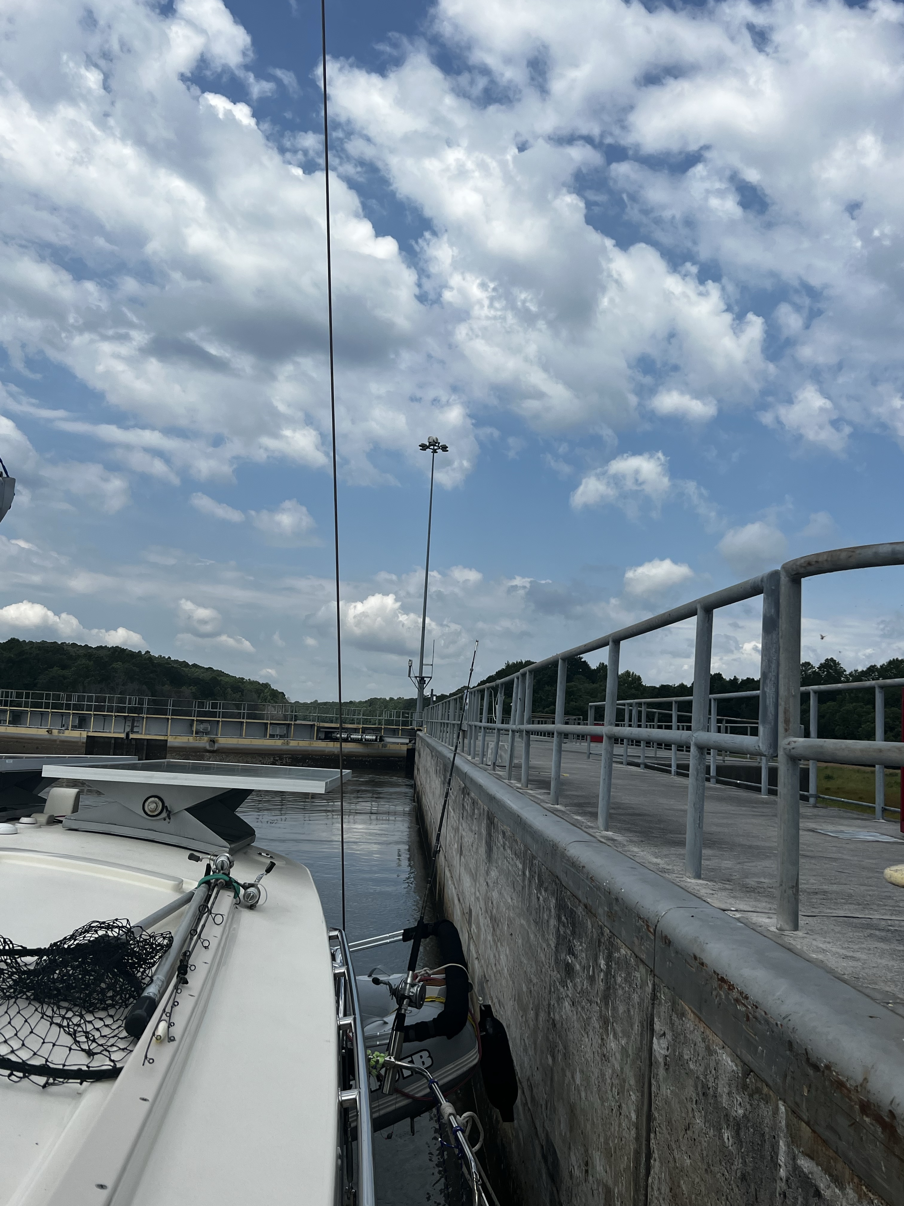 Woke to a beautiful morning at Midway Marina. Headed toward Fulton Lock to start our day of locking through some locks today! Fulton lock is 391.1 MM on the TTB and 4 more to go on the tenn tom! While waiting on the lock to open (after the fulton lock), Andrea decided to blow some bubbles from the bow of her boat lol. They are so pretty catching the sun and shimmering until they touch the muddy dark waters of the TTB and disappearing forever. We met some other boaters on the way up the TTB headed toward Pickwick lake. One sailboat and several other motorboats. Most boaters are courteous and nice others not so much(esp the motor boaters when they see a sailboat). Not sure why.