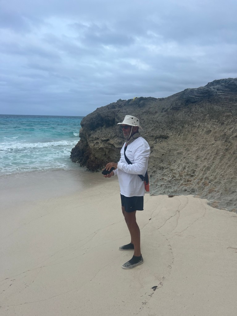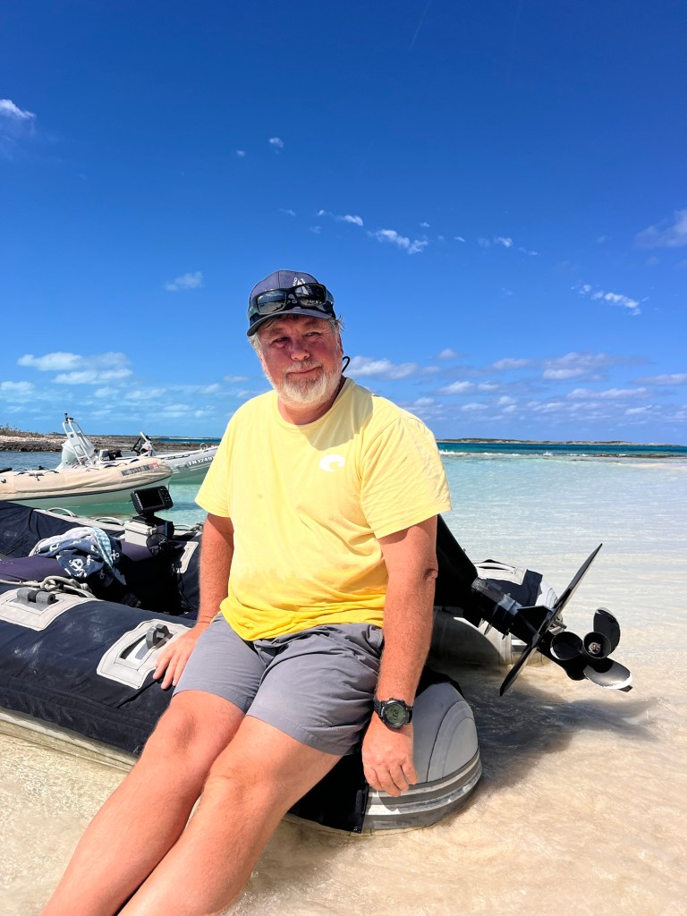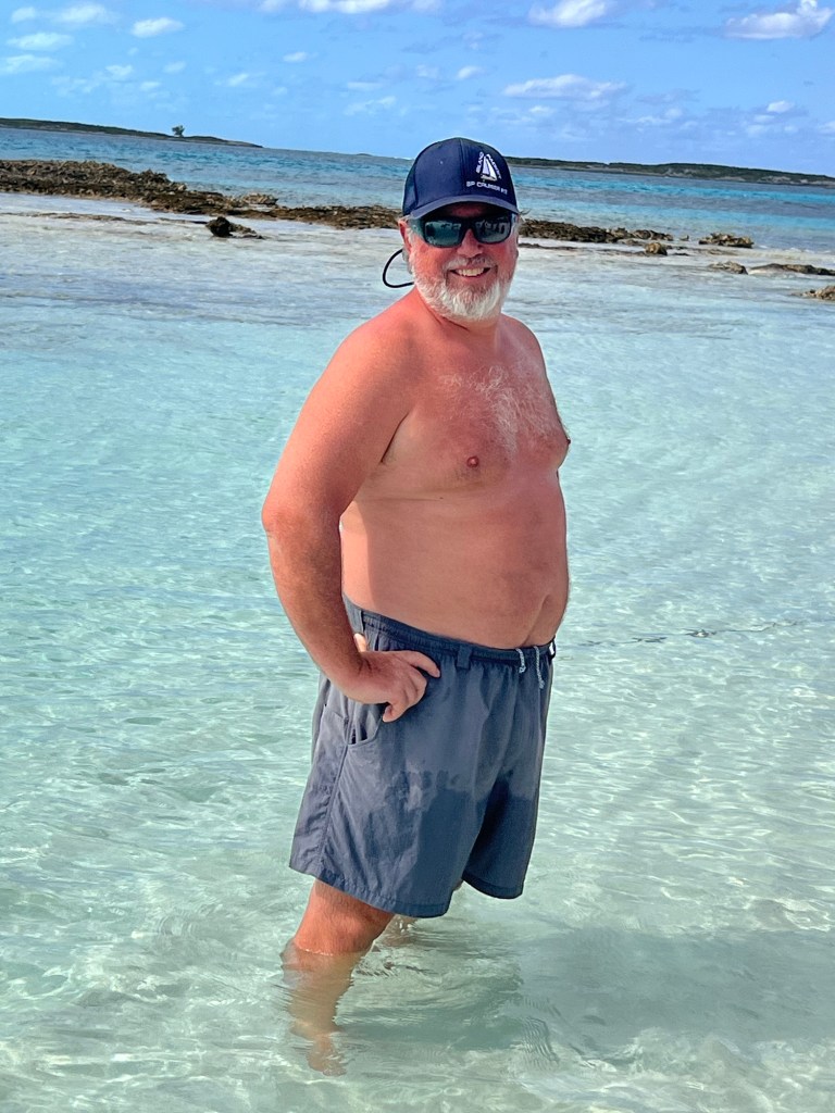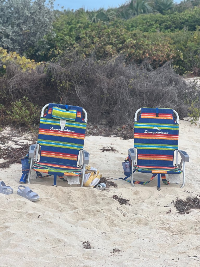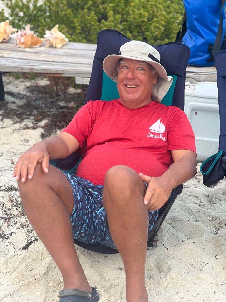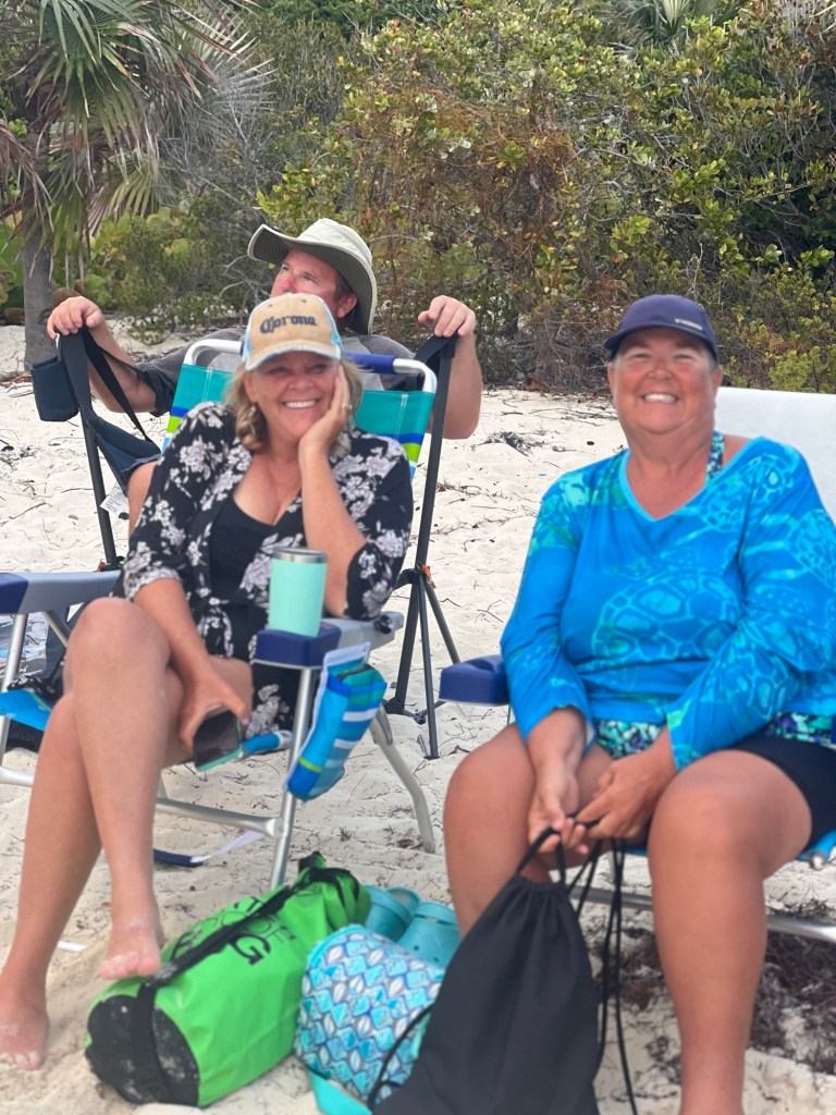 So we came into Rudder Cay last night and here we are at Rudder Cay. This island 🏝️ is owned by David Copperfield ( a famous magician in the 80s I think). The islands say no trespassing but you can sit on the beaches up to the high waterline. No one can own the water. He put a mermaid statue and piano made of stainless steel about 20 ft underwater. You can touch it at low tide if you’re snorkeling dive down and touch the piano or mermaid. So cool!! He also has one huge area made up of 11 small islands together to create one resort area. If you have a couple hundred thousand you can stay at his places for a week! We would head over to a protected cove beach anchored out about 20 ft from the beach and stepped off the dinghy into the shallow water. Walked to the beach and set up what I called my tinker toy chair. You have to put the tubes together then add the rip stop seat cover on it. I love it! Good times great friends!