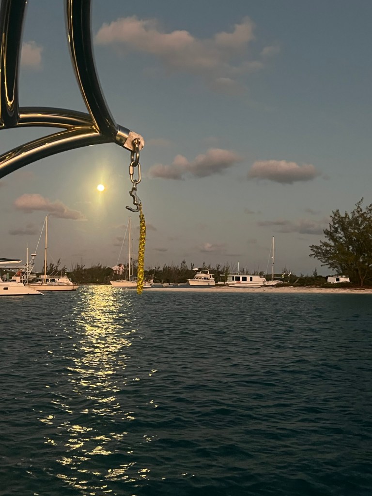 Farmers Cay anchorages has some funky currents and you may be sitting on your anchor or it may be laying beside your boat. And you turn in different directions from other boats too.