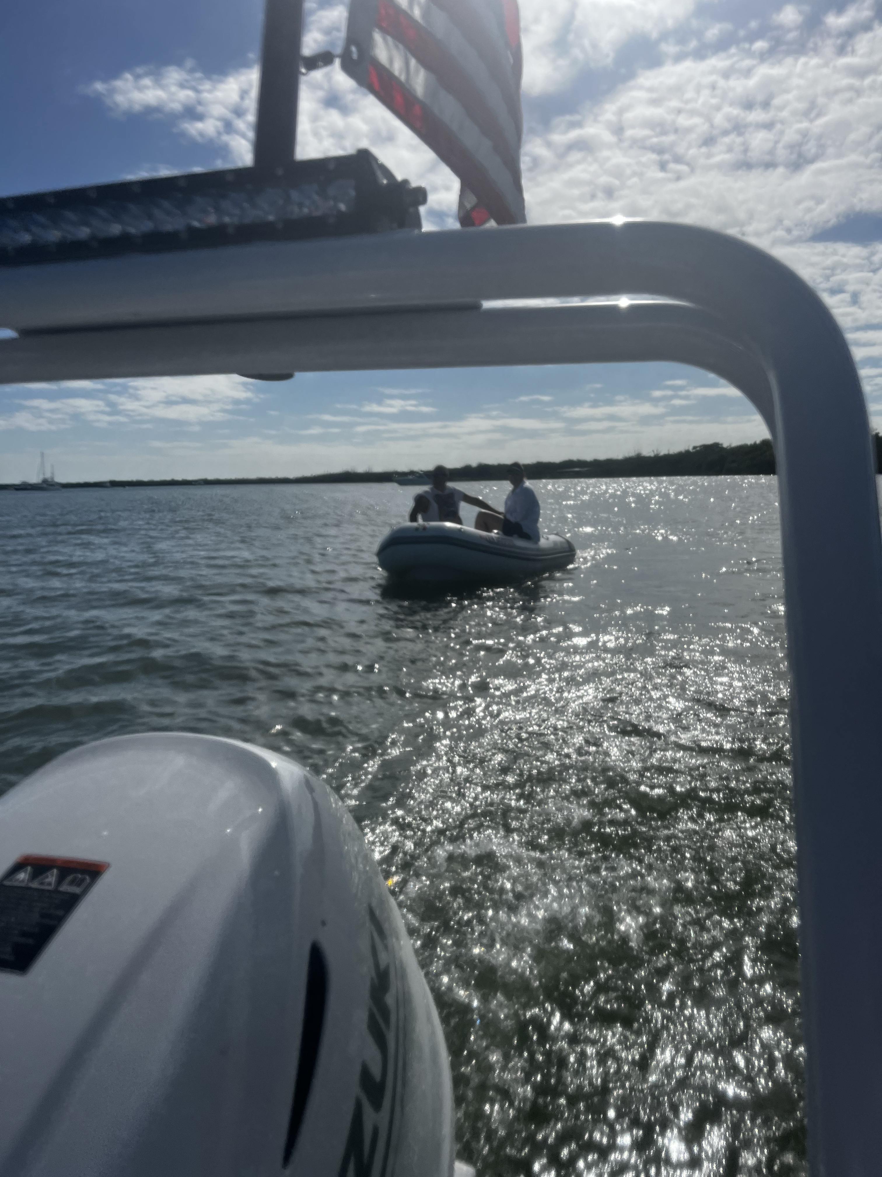 We pulled anchor around 7 and headed off to Long Key anchorage near Fiesta Key, actually right next door to Fiesta Key. The weather was a little bumpy but nothing really uncomfortable. The morning sky was beautiful with storm clouds in the distance. We ran from the storm but it moved around and in front of us but we never got in any rain. It was a good sailing day and we anchored out next to the highway on Long Key and dropped anchor and lowered our dinghys into some fiesty water to go eat at a cool little tiki hut restaurant that belonged to an RV Park it was good food. We hopped in our little dinghys after eating and rode the wild waves back to the boat put the dinghy back on its davits fighting the rocking of the boat as we worked frantically to lock the chains in place. Finally got it hooked up very well and secure and went to bed with the rock and roll of the Big Moose. Fair winds fellow sailors and followers