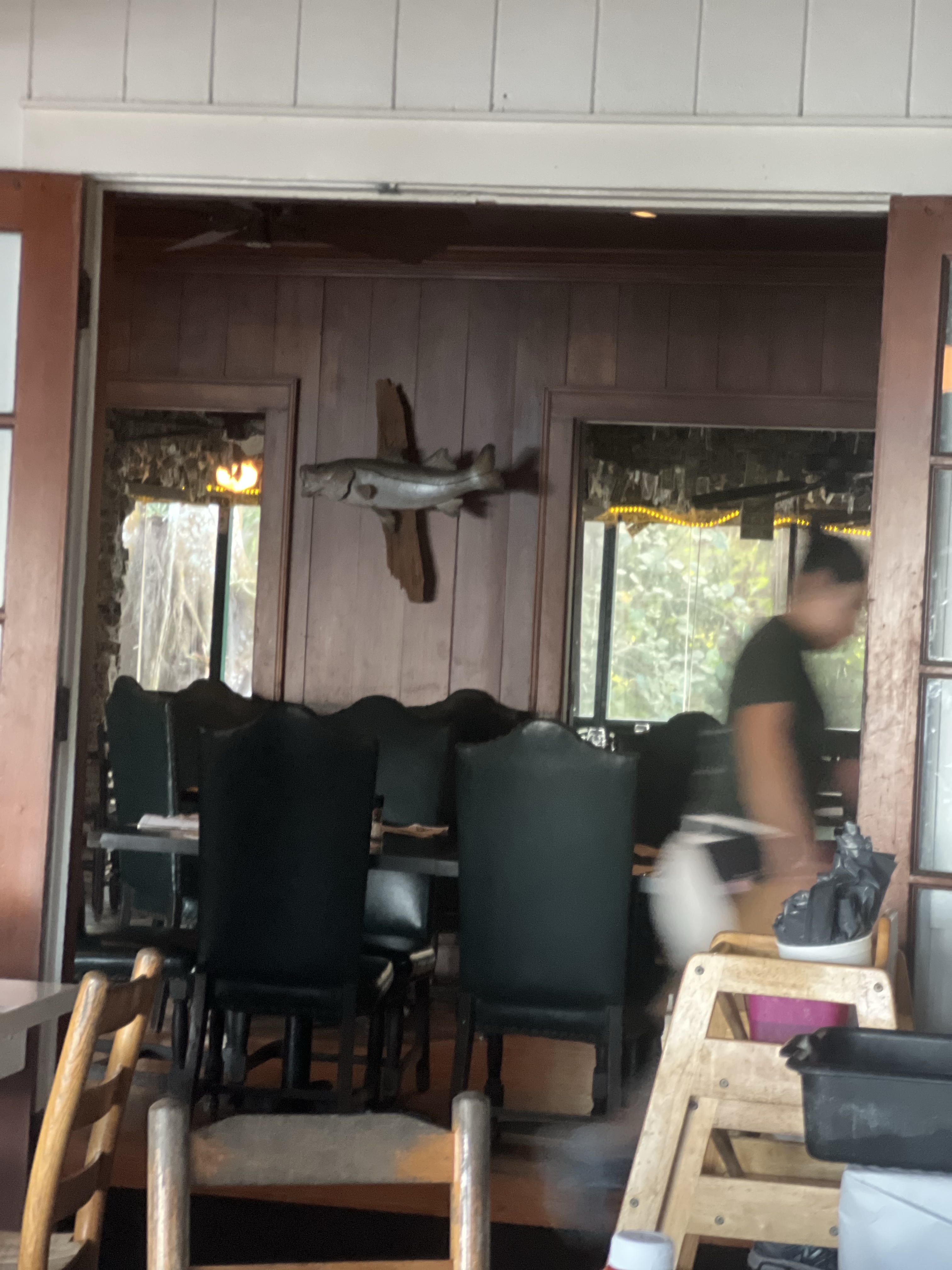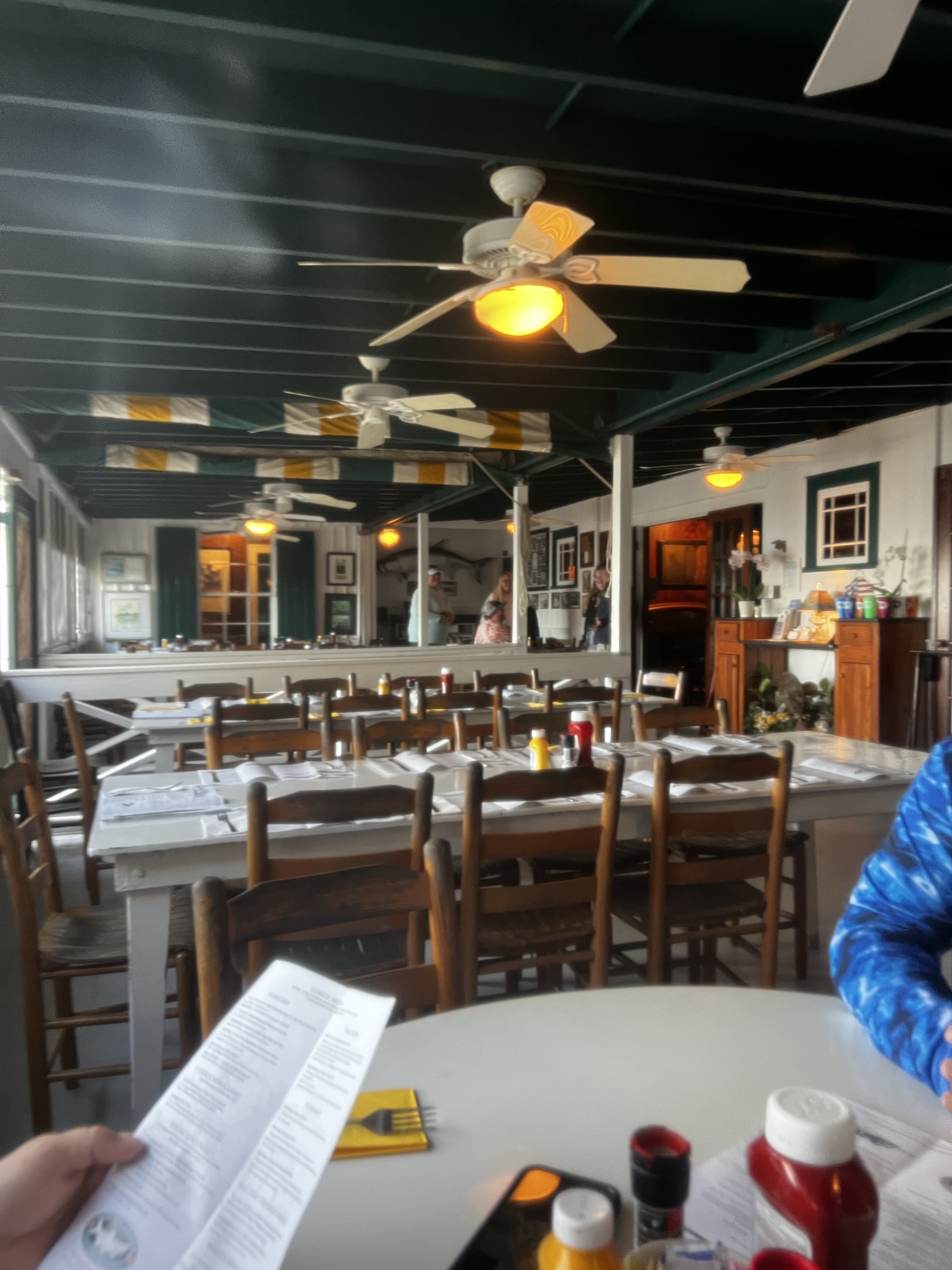 The next day we took the dinghies the long way over to the Fish House restaurant. We had to go under a really low bridge and have to get under it at the right tide. Well the ride took us out under the highway and into the rough waves and right into the dock at the Fish House. We pulled into the dock area and tied up asking a fisherman if we could dock there. He said it would be fine but the pelican on the dock did not want to move off of his spot on the dock so we walked around him.and went in the back door to the restaurant. THe fish house was cool because it had a helicopter landing pad out front and windows that could be opened to the outside all the way down the wall.And another entrance for the helicopter guests.