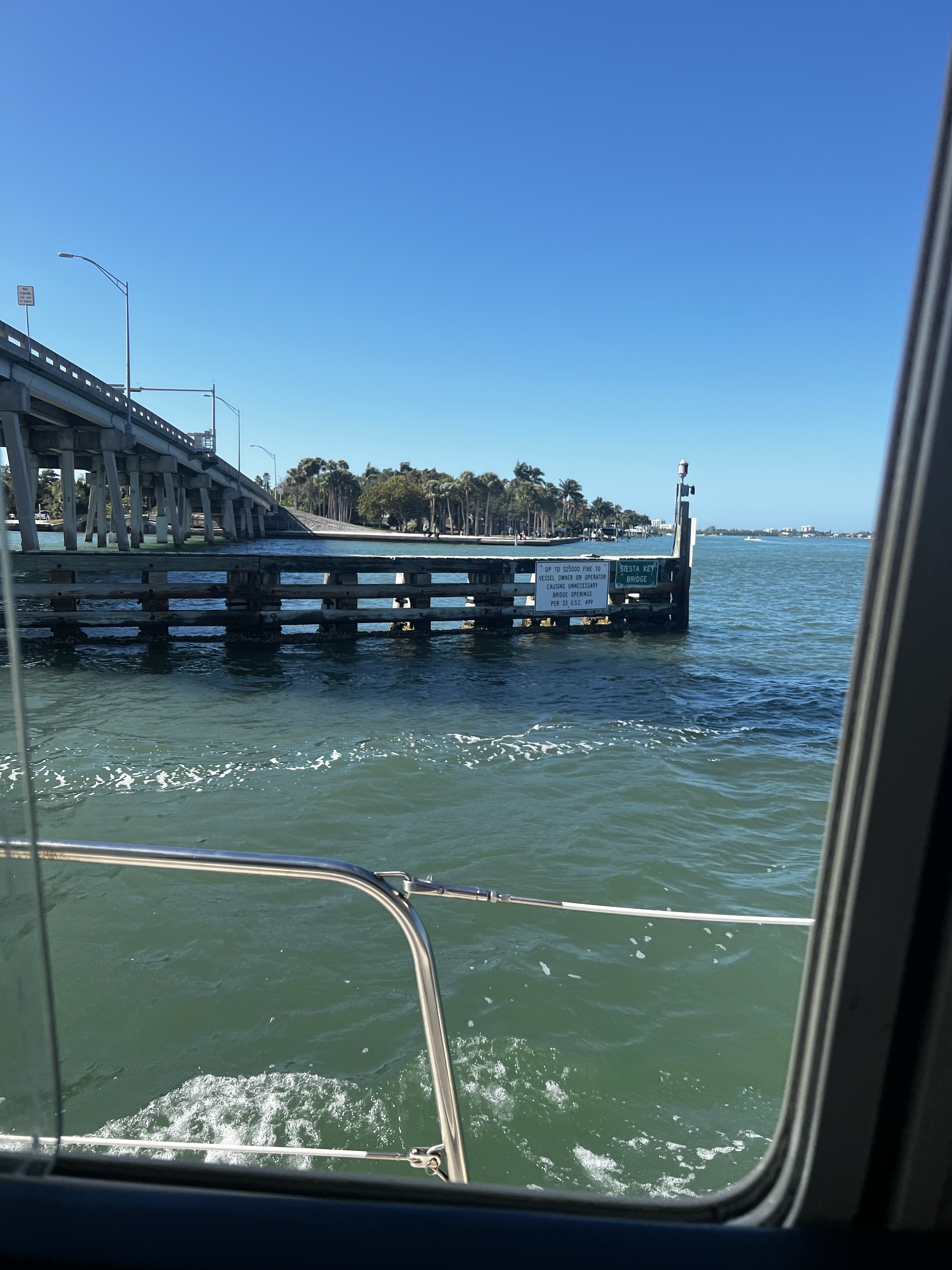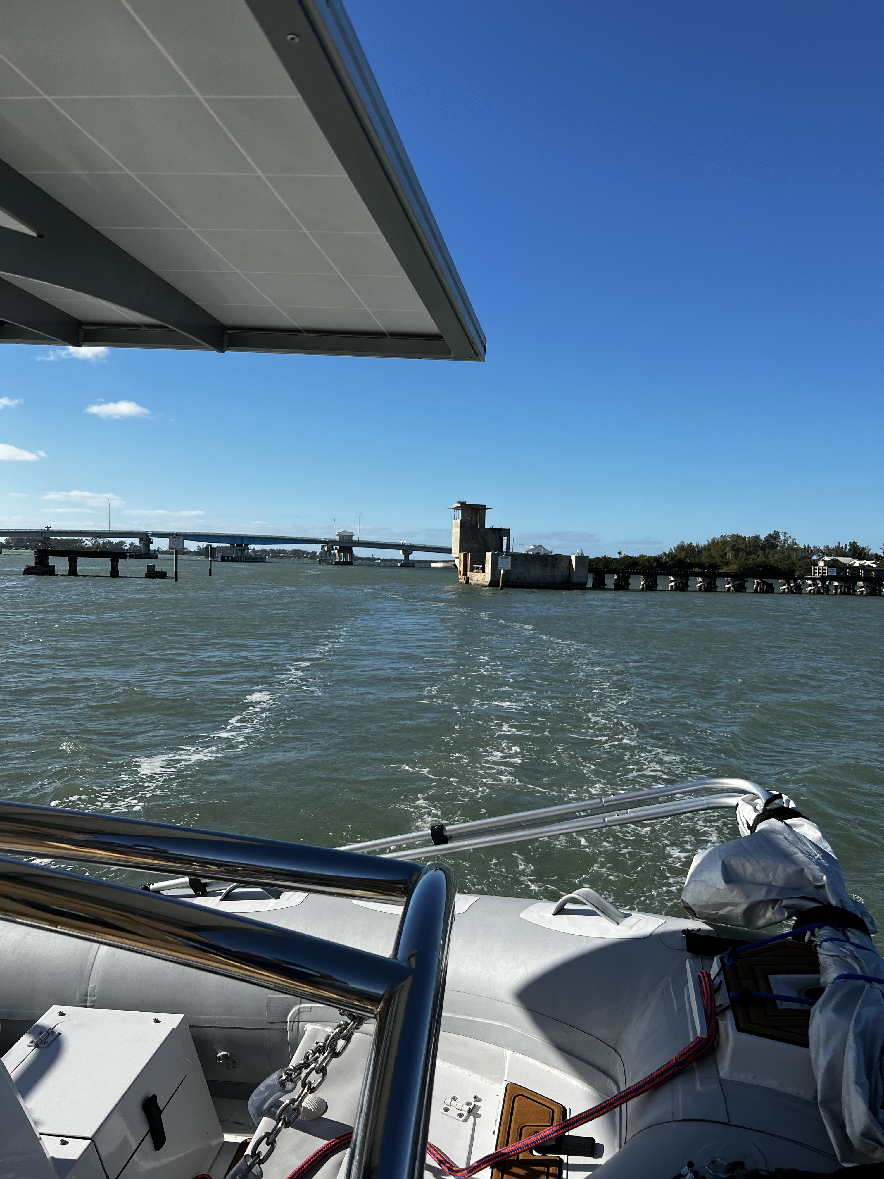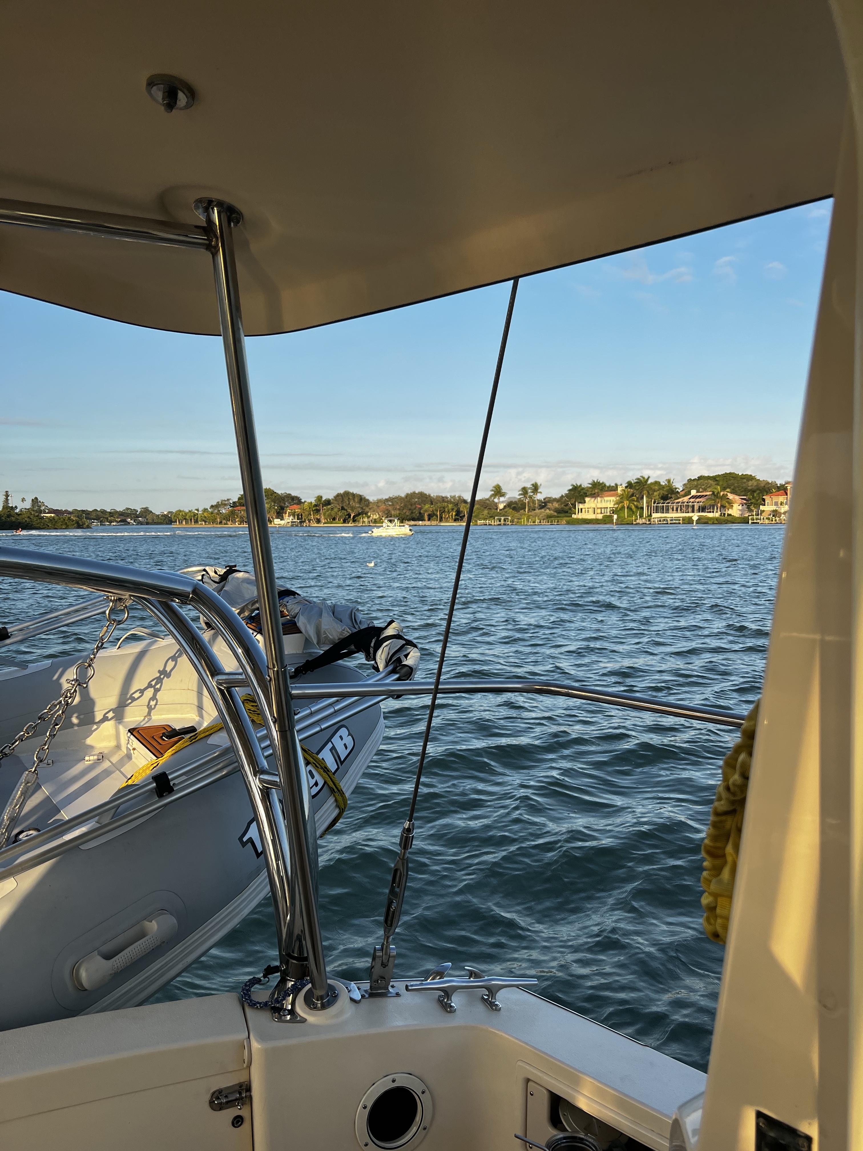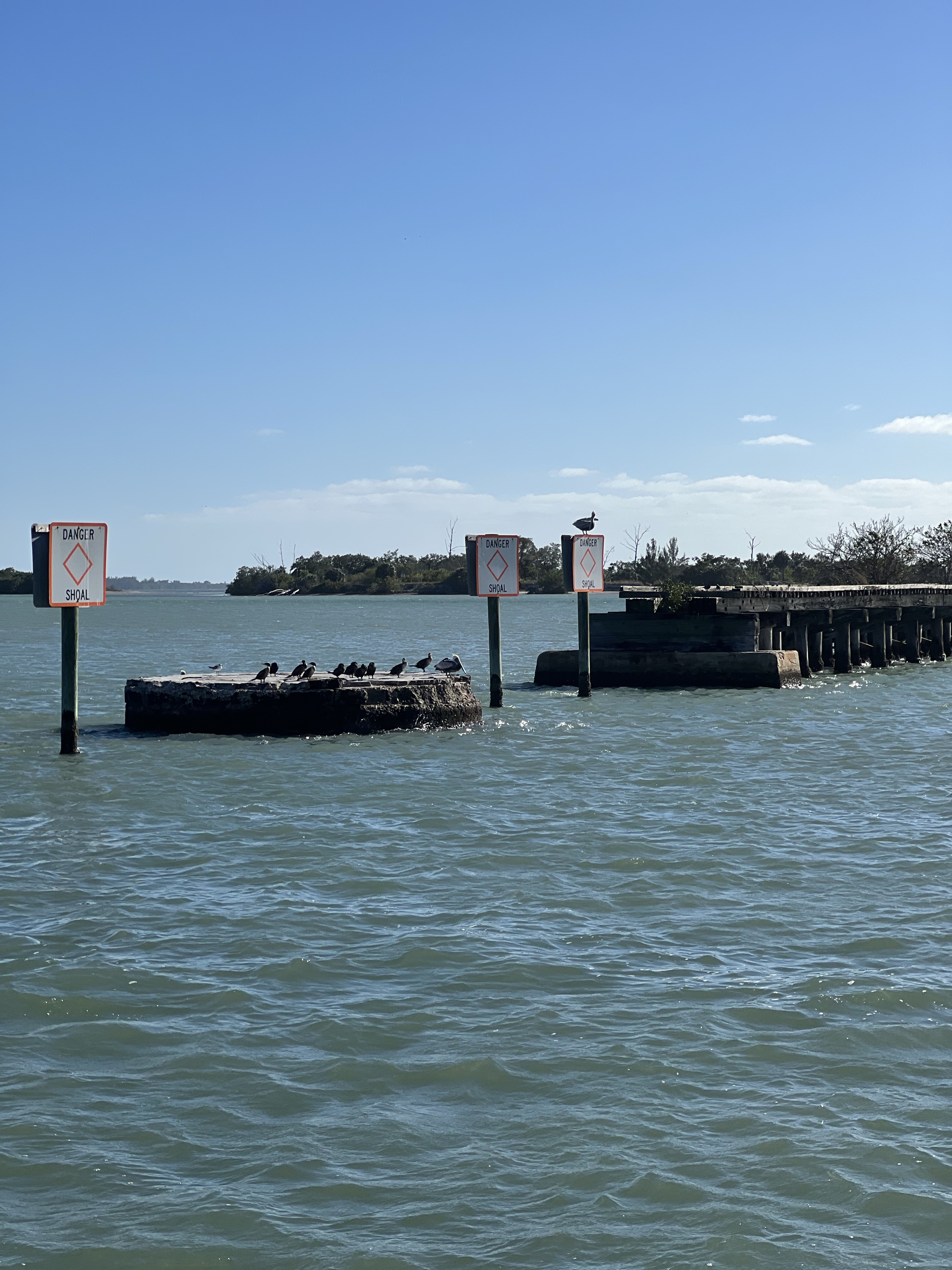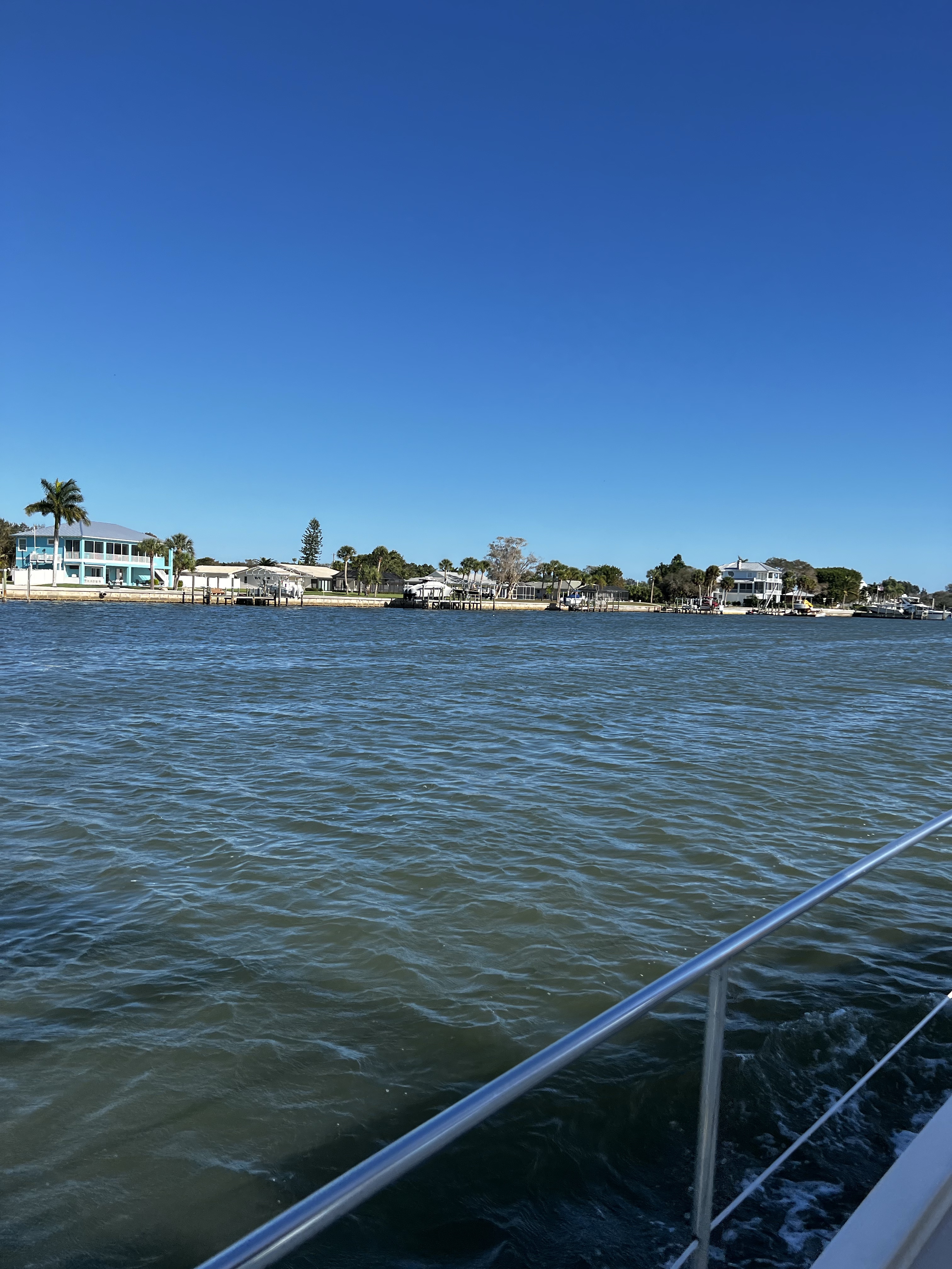 On the ICW headed to somewhere nice to anchor. Traveling down this area is hazardous to any boaters health. There is absolutely no regard for any other boaters health or safety. So we made our way as best we could down the racetrack that is the southern ICW. Saw an old wreck protruding from the water with birds sitting on the old rusted parts sticking out of the water as we made our way toward a huge bridge with lets say plenty of clearance. The day is dreary and foggy with decent visibility that gives away to sunshine in the afternoon. The race increases as we boat along. I have posted pictures of the inconsiderate geniuses that actually have a boat. Racing through minimal wake zones at full speed. Finally getting out of the race, we found ourselves and anchorage in Longboat Key in front of a restaurant called the shore and another smaller restaurant right beside it. Got a shot of some cool dolphins after we anchored. We got anchored out(which took a minute because of the crowded area we were in with the derelict sailboats rotting away on the hook), and decided to hit the restaurant that had the tables on the beach. Found a place to tie our boats up to the dock for that restaurant. We decided to walk around while waiting for our table and look at the houses around the circle by the restaurant. Checked out some jumping fish off of a private pier across from a huge house that was for sale. Found a really cute house with blue yellow and pink paint that reminded me of a place in the islands. We walked back to the restaurant and took some cool pics under the awning as you went in to the restaurant. Since we dinghy up to most places to eat at the dock we dont always see the front of the restaurant we eat at. It was a cool place with all the tables open to the beach and plastic walls to be dropped if needed. We met some fellow sailors while waiting that were anchored out close to us that told us a cool story. He had been on his way to eat here in his sailboat with his family when traversing an inlet that was pretty rough! Story short he had to cut his dinghy off because it was sinking and couldnt be saved. So he got a new dinghy and repeated the trip and there he was! Love the cool sailing stories. Also met a man who we couldn’t figure out nice but assholio at the same time. So…we waited for about an hour but the food was worth it. We sat at a table right on the beach and a crane hung out with us the whole time we were there. He had shrimp for dinner as we ate our shrimp hahaha! It was a wonderful night with our friends and the crane! Hope your days are as much fun as ours. Stay tuned for more adventures. Admiral Loretta out.