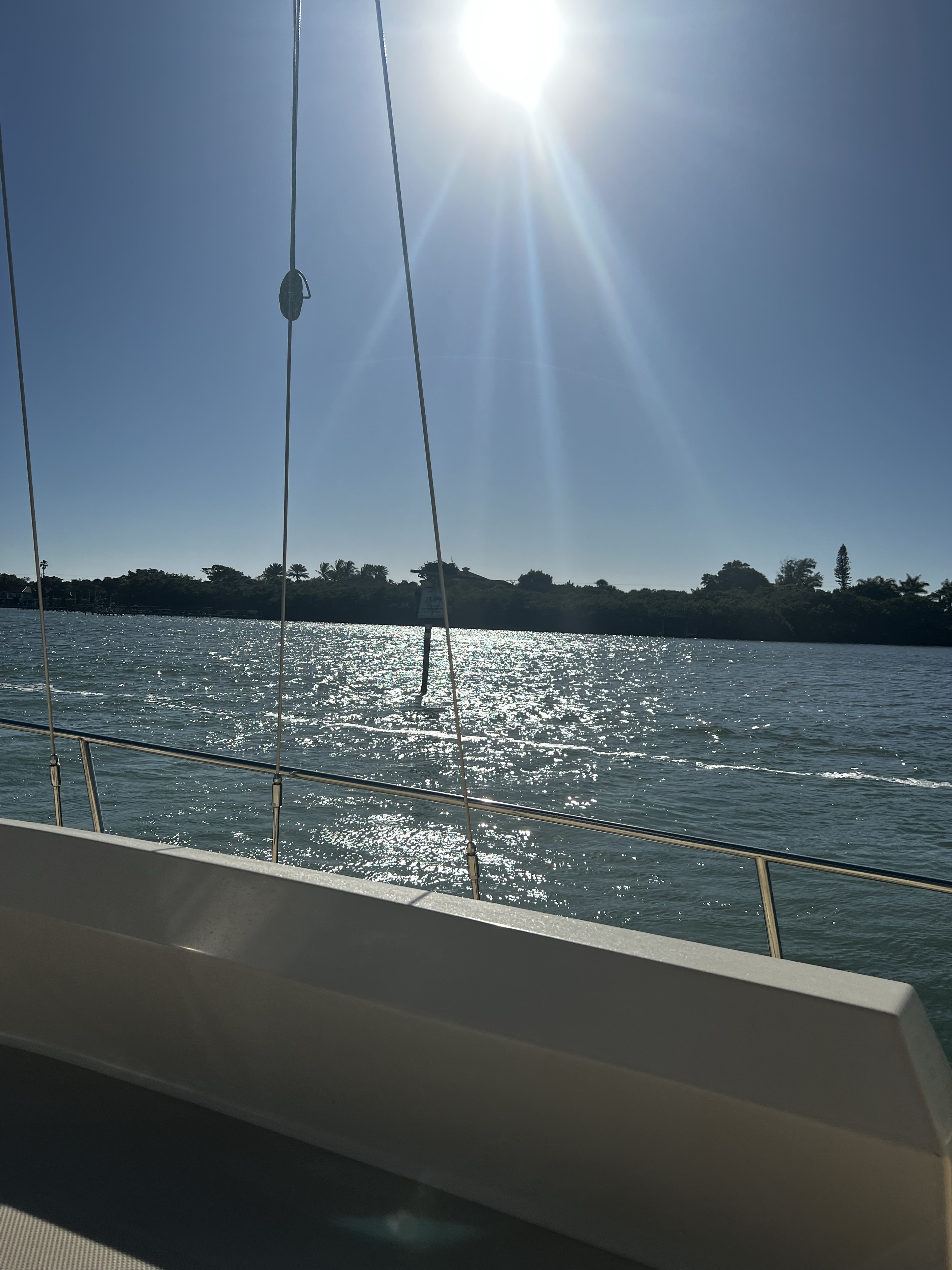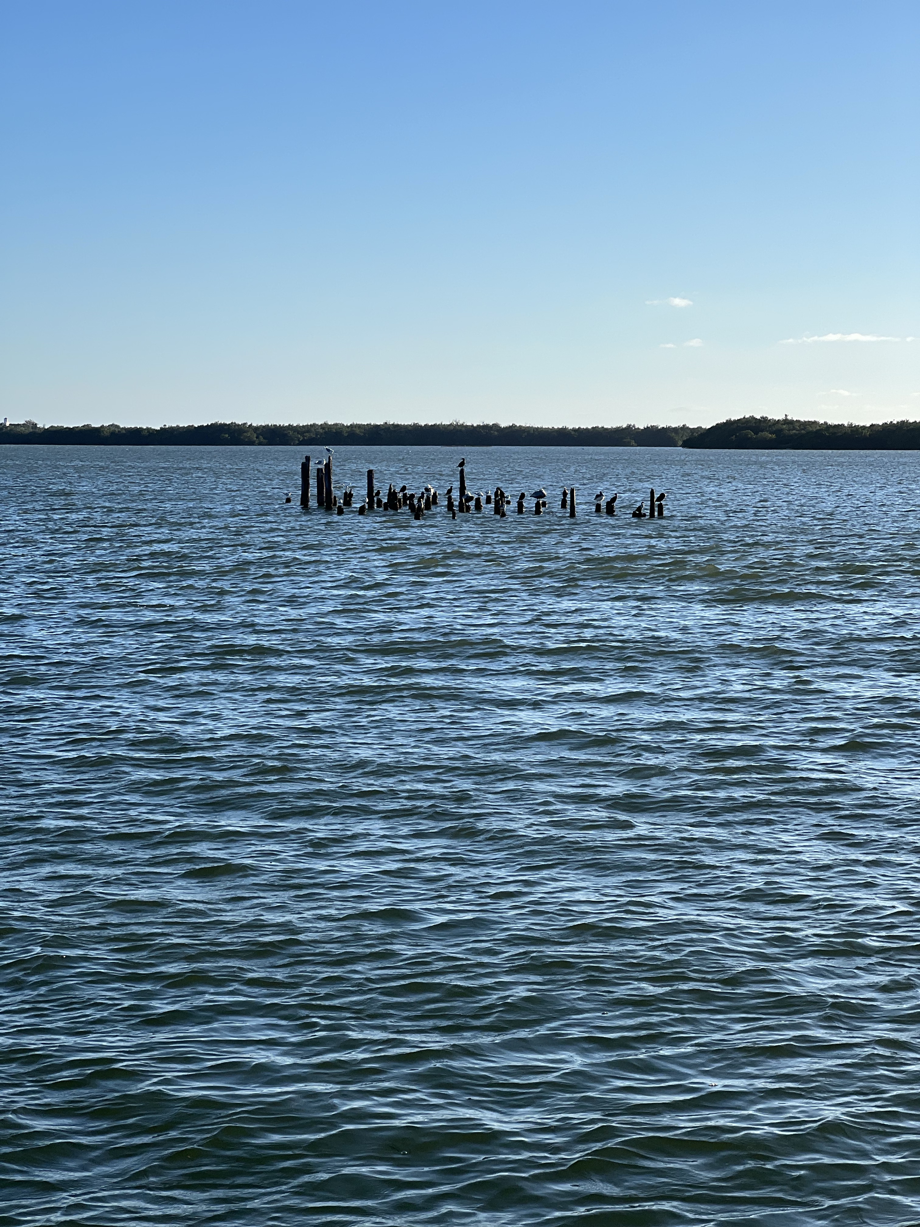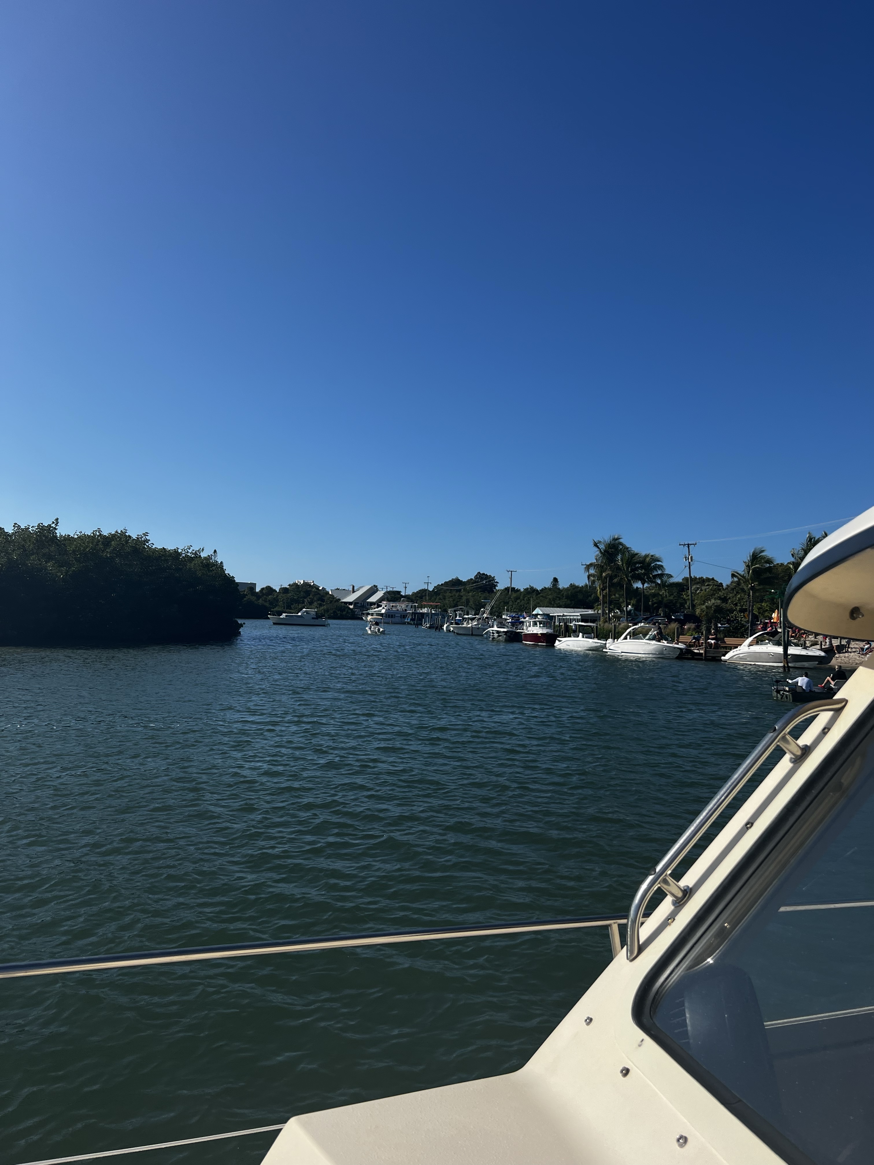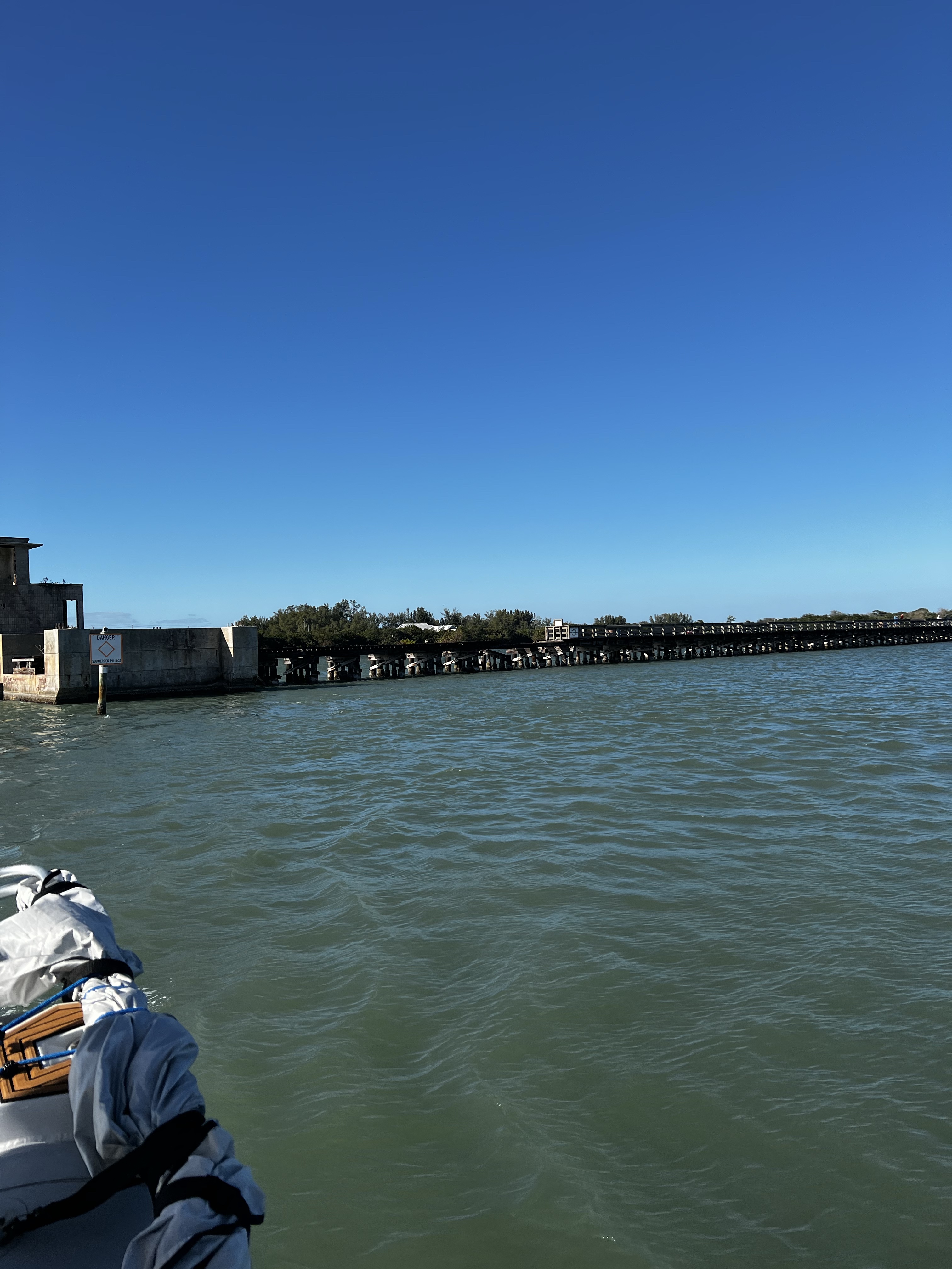On the ICW headed to somewhere nice to anchor. Traveling down this area is hazardous to any boaters health. There is absolutely no regard for any other boaters health or safety. So we made our way as best we could down the racetrack that is the southern ICW. Saw an old wreck protruding from the water with birds sitting on the old rusted parts sticking out of the water as we made our way toward a huge bridge with lets say plenty of clearance. The day is dreary and foggy with decent visibility that gives away to sunshine in the afternoon. The race increases as we boat along. I have posted pictures of the inconsiderate geniuses that actually have a boat. Racing through minimal wake zones at full speed. Finally getting out of the race, we found ourselves and anchorage in Longboat Key in front of a restaurant called the shore and another smaller restaurant right beside it. Got a shot of some cool dolphins after we anchored. We got anchored out(which took a minute because of the crowded area we were in with the derelict sailboats rotting away on the hook), and decided to hit the restaurant that had the tables on the beach. Found a place to tie our boats up to the dock for that restaurant. We decided to walk around while waiting for our table and look at the houses around the circle by the restaurant. Checked out some jumping fish off of a private pier across from a huge house that was for sale. Found a really cute house with blue yellow and pink paint that reminded me of a place in the islands. We walked back to the restaurant and took some cool pics under the awning as you went in to the restaurant. Since we dinghy up to most places to eat at the dock we dont always see the front of the restaurant we eat at. It was a cool place with all the tables open to the beach and plastic walls to be dropped if needed. We met some fellow sailors while waiting that were anchored out close to us that told us a cool story. He had been on his way to eat here in his sailboat with his family when traversing an inlet that was pretty rough! Story short he had to cut his dinghy off because it was sinking and couldnt be saved. So he got a new dinghy and repeated the trip and there he was! Love the cool sailing stories. Also met a man who we couldn’t figure out nice but assholio at the same time. So…we waited for about an hour but the food was worth it. We sat at a table right on the beach and a crane hung out with us the whole time we were there. He had shrimp for dinner as we ate our shrimp hahaha! It was a wonderful night with our friends and the crane! Hope your days are as much fun as ours. Stay tuned for more adventures. Admiral Loretta out.