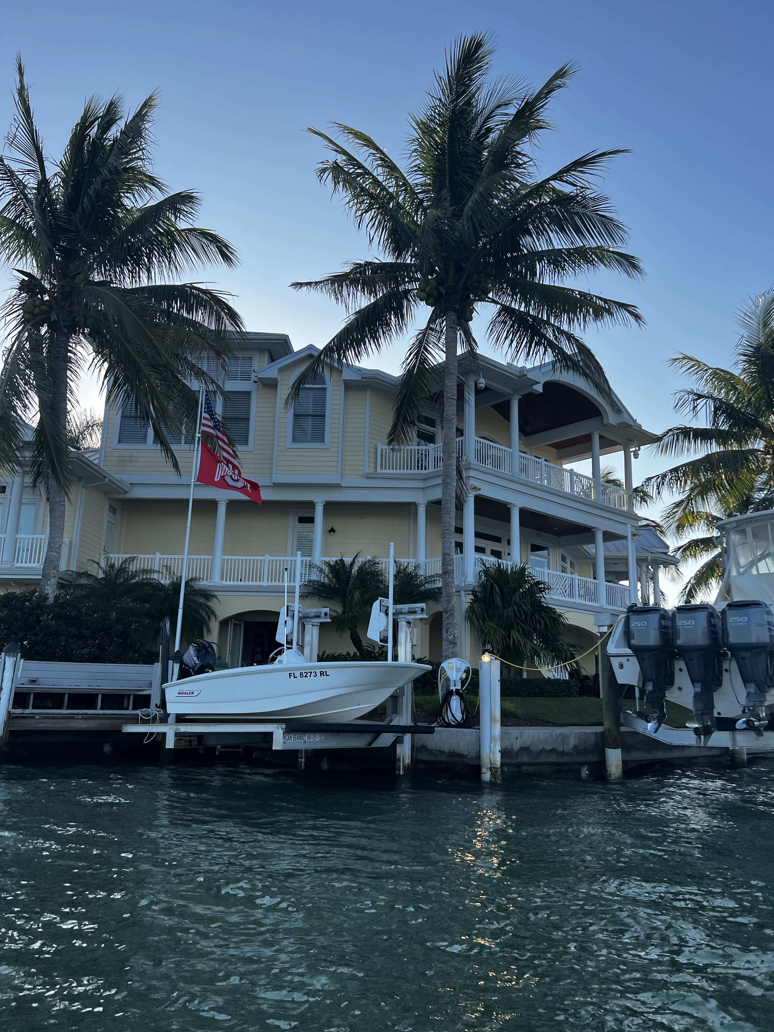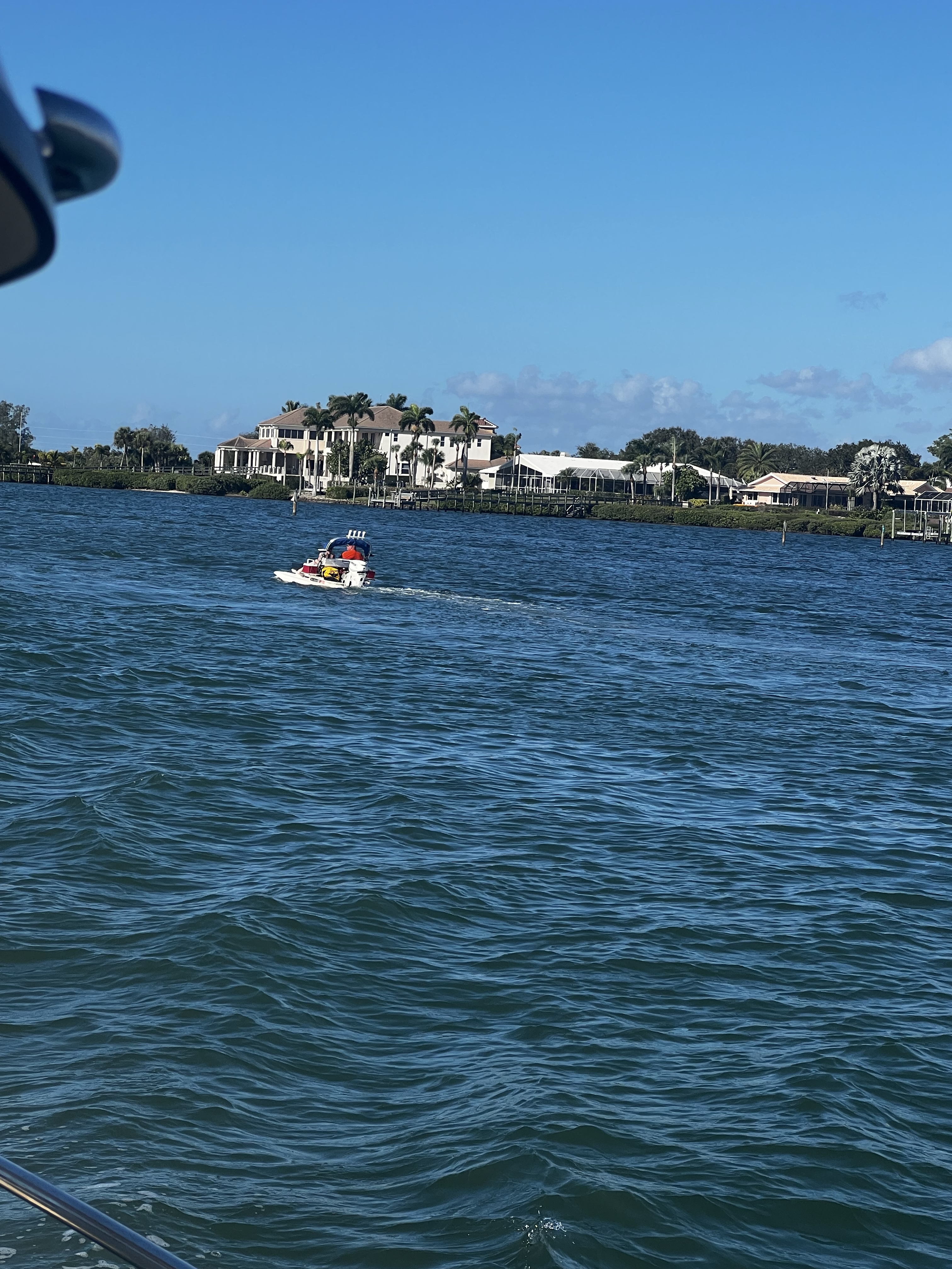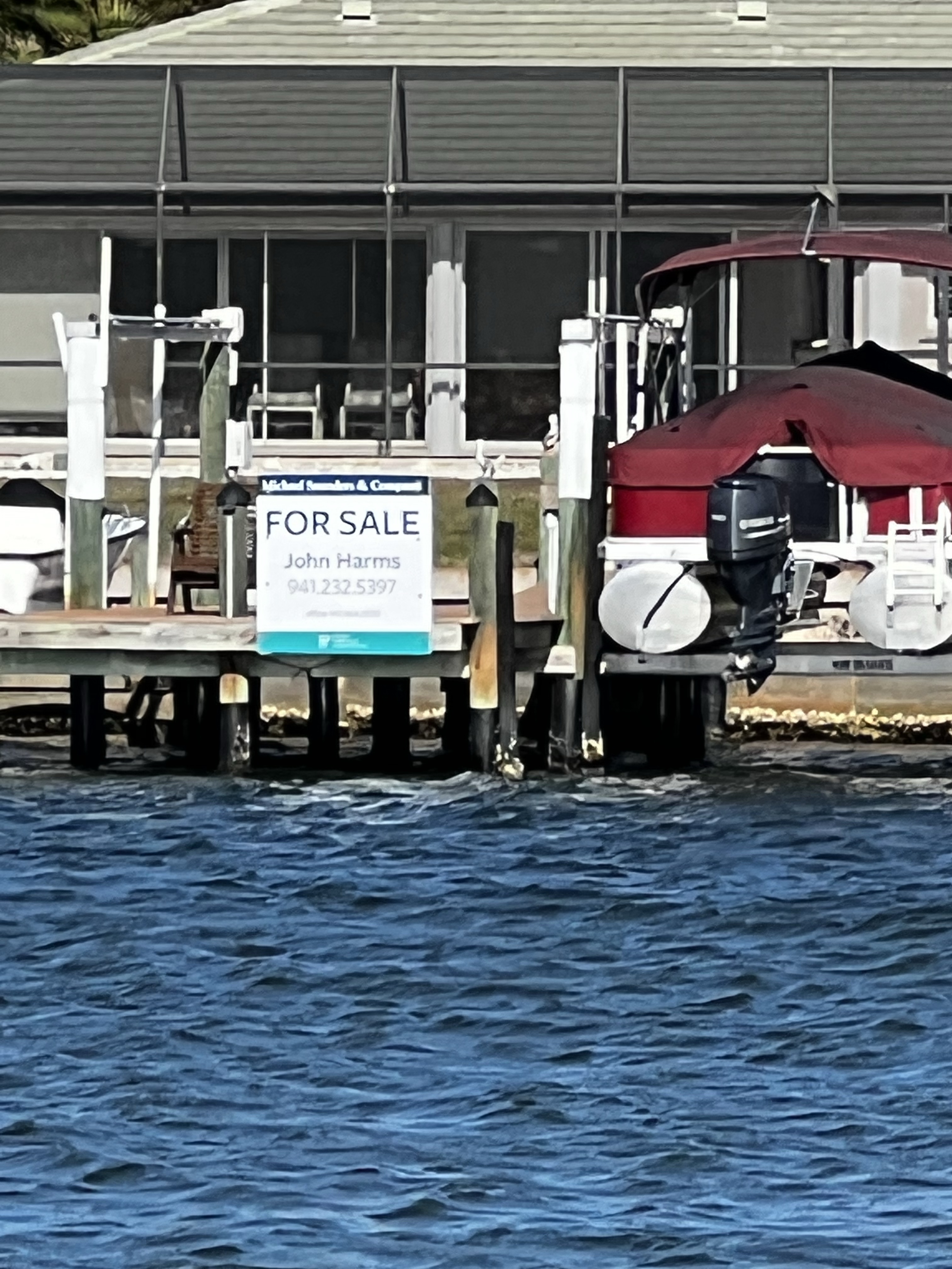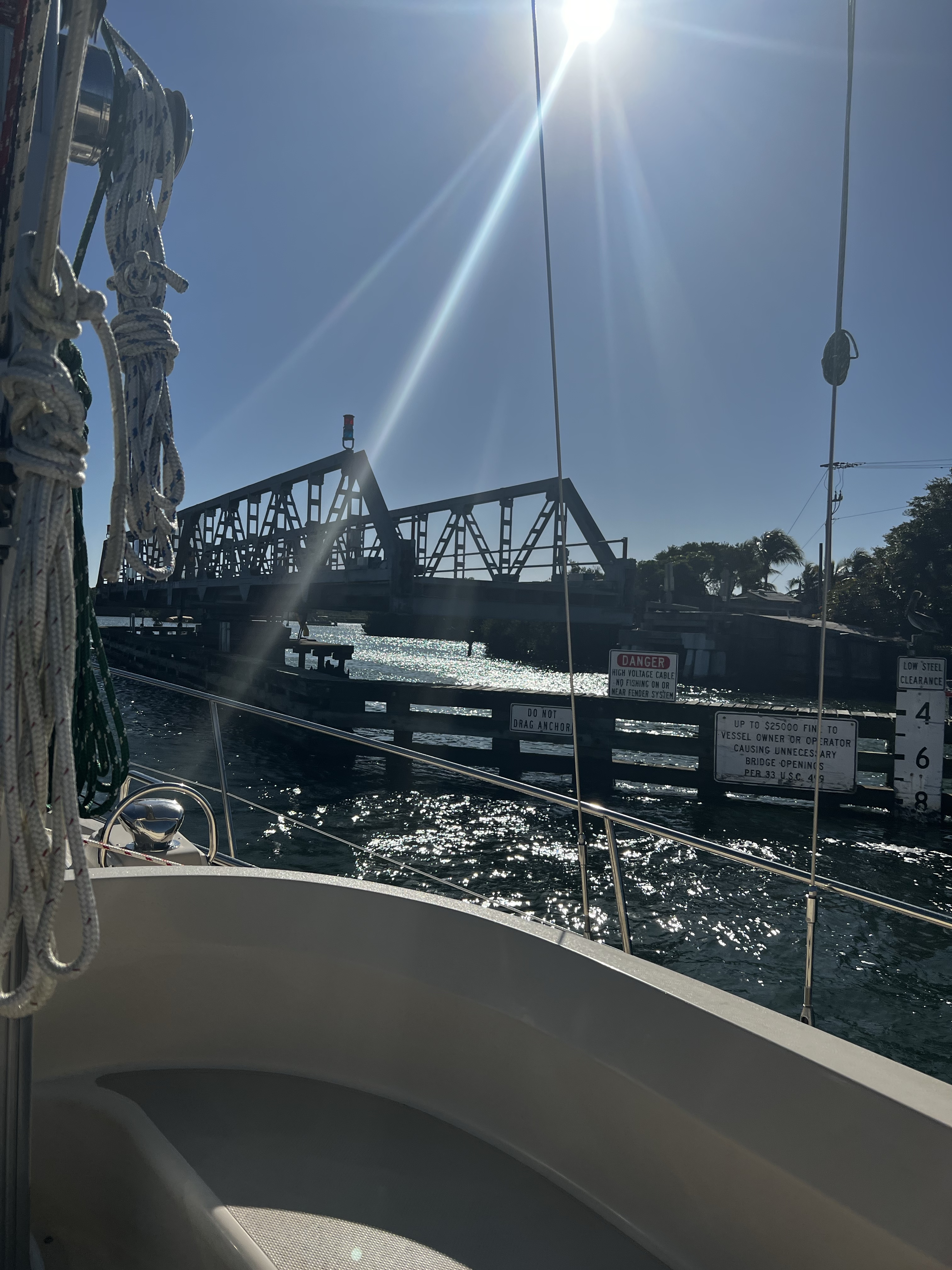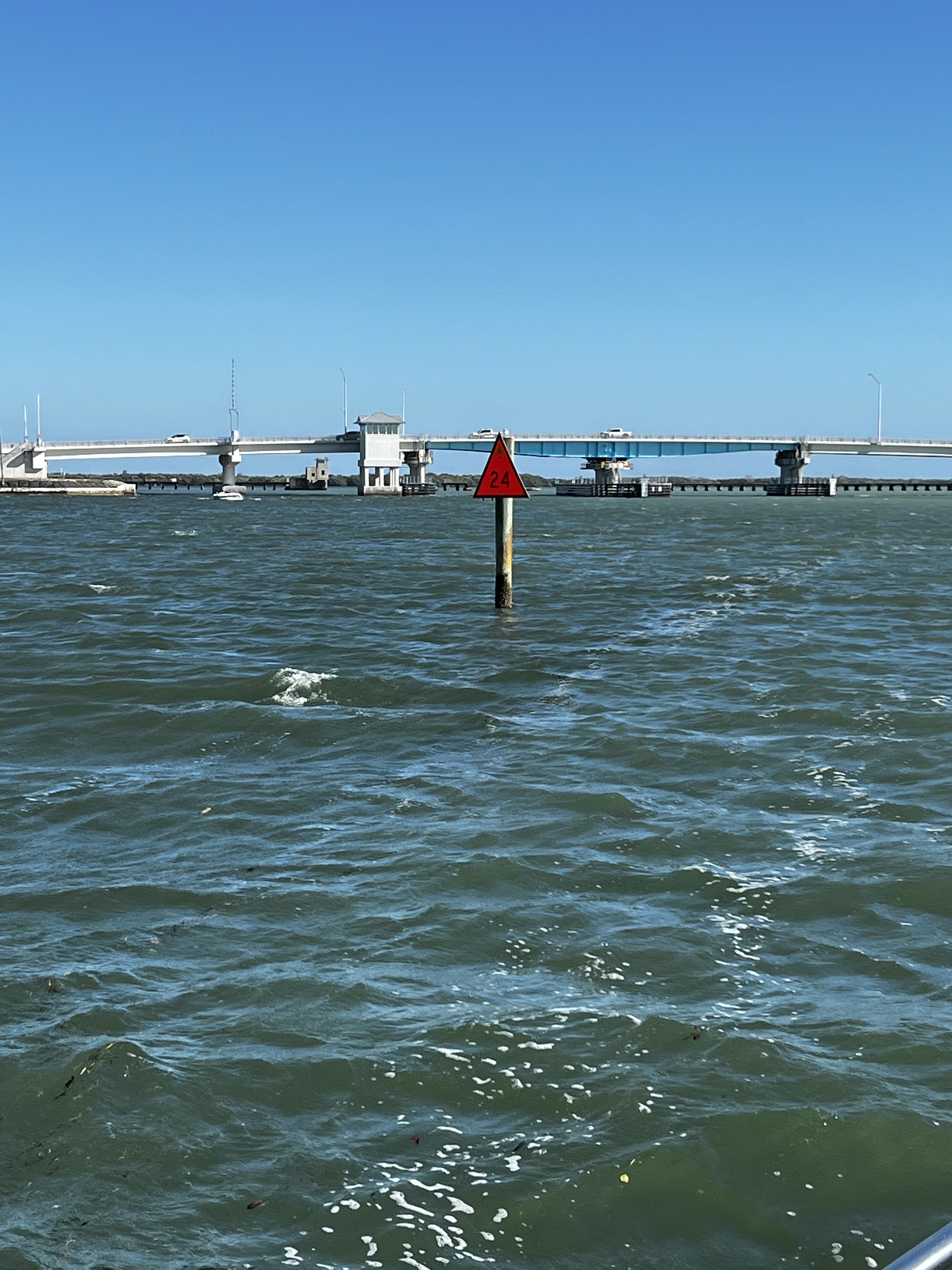 On the ICW headed to somewhere nice to anchor. Traveling down this area is hazardous to any boaters health. There is absolutely no regard for any other boaters health or safety. So we made our way as best we could down the racetrack that is the southern ICW. Saw an old wreck protruding from the water with birds sitting on the old rusted parts sticking out of the water as we made our way toward a huge bridge with lets say plenty of clearance. The day is dreary and foggy with decent visibility that gives away to sunshine in the afternoon. The race increases as we boat along. I have posted pictures of the inconsiderate geniuses that actually have a boat. Racing through minimal wake zones at full speed. Finally getting out of the race, we found ourselves and anchorage in Longboat Key in front of a restaurant called the shore and another smaller restaurant right beside it. Got a shot of some cool dolphins after we anchored. We got anchored out(which took a minute because of the crowded area we were in with the derelict sailboats rotting away on the hook), and decided to hit the restaurant that had the tables on the beach. Found a place to tie our boats up to the dock for that restaurant. We decided to walk around while waiting for our table and look at the houses around the circle by the restaurant. Checked out some jumping fish off of a private pier across from a huge house that was for sale. Found a really cute house with blue yellow and pink paint that reminded me of a place in the islands. We walked back to the restaurant and took some cool pics under the awning as you went in to the restaurant. Since we dinghy up to most places to eat at the dock we dont always see the front of the restaurant we eat at. It was a cool place with all the tables open to the beach and plastic walls to be dropped if needed. We met some fellow sailors while waiting that were anchored out close to us that told us a cool story. He had been on his way to eat here in his sailboat with his family when traversing an inlet that was pretty rough! Story short he had to cut his dinghy off because it was sinking and couldnt be saved. So he got a new dinghy and repeated the trip and there he was! Love the cool sailing stories. Also met a man who we couldn’t figure out nice but assholio at the same time. So…we waited for about an hour but the food was worth it. We sat at a table right on the beach and a crane hung out with us the whole time we were there. He had shrimp for dinner as we ate our shrimp hahaha! It was a wonderful night with our friends and the crane! Hope your days are as much fun as ours. Stay tuned for more adventures. Admiral Loretta out.