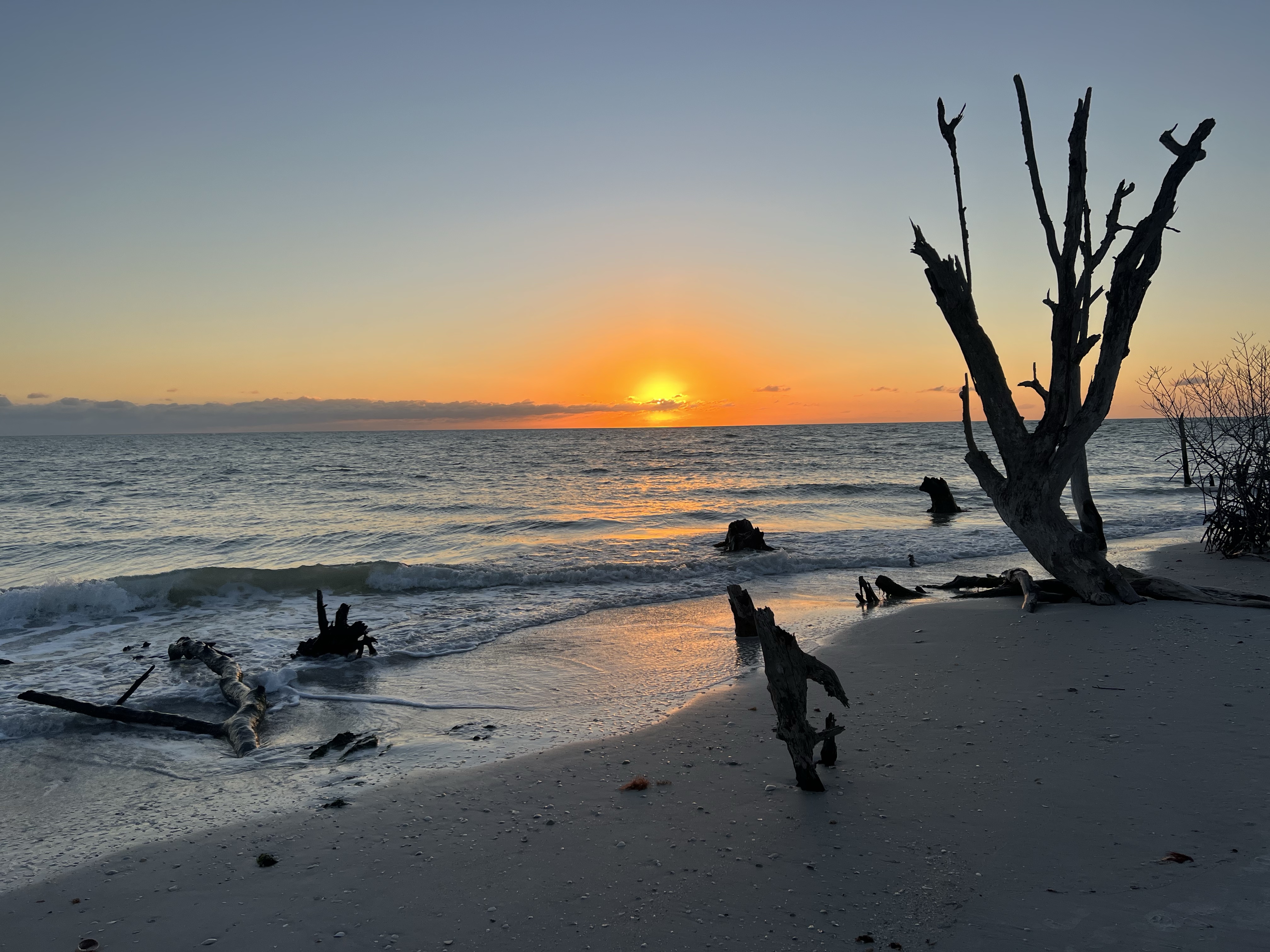 Headed down to the Cayo Costa Park to anchor out and enjoy the beautiful beaches covered in shells and gorgeous sunsets. Travelling down the ICW we saw some gorgeous homes and islands. Seeing several kestrels and a lot of birds. It was a great day boating and we just enjoyed the serenity of the trip. NOT a racetrac today very calm traffic and very few boats! We sailed into parrot key into a very nice anchorage very safe and sheltered. We got out into the dinghy and headed to the little beach area which as we found was the place to hang out at for the locals and tourists. There were a lot of boats in that area and it was an absolutely gorgeous sunny day. We walked along the little beaches and found some cool shells and very nice scenery. I had to find a little wildlife path through the sharp grass and bushes from beach to beach. Andrea being the good sport she is followed me without complaint as I can take off through questionable trails when exploring new places. It was a cool place and we stayed for a while until we took off to the boats again because we couldn’t go to the restaurant due to the waves being a little grouchy today. BUT we shall try again tomorrow to go to the restaurant. My son sent me pictures of him and my grandson snow sledding down a hill. Enjoy the pics and I am out….
