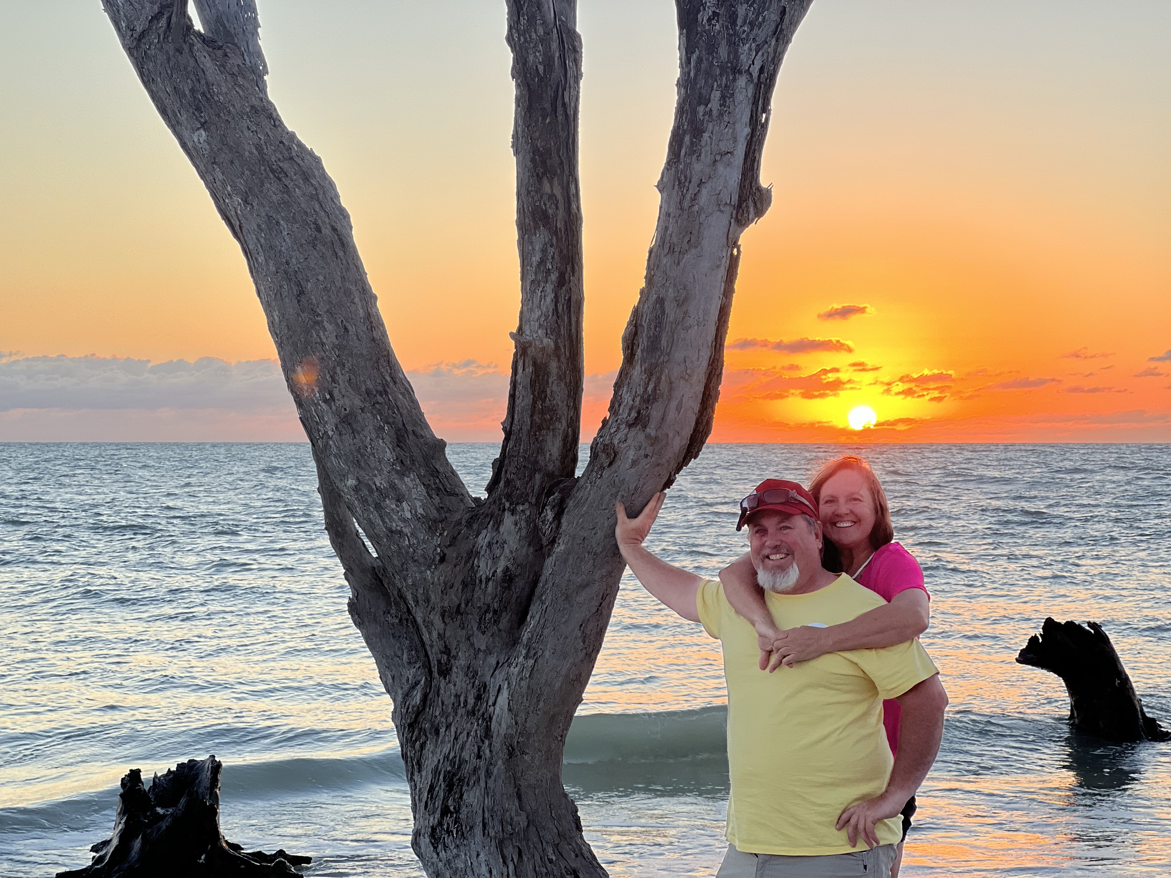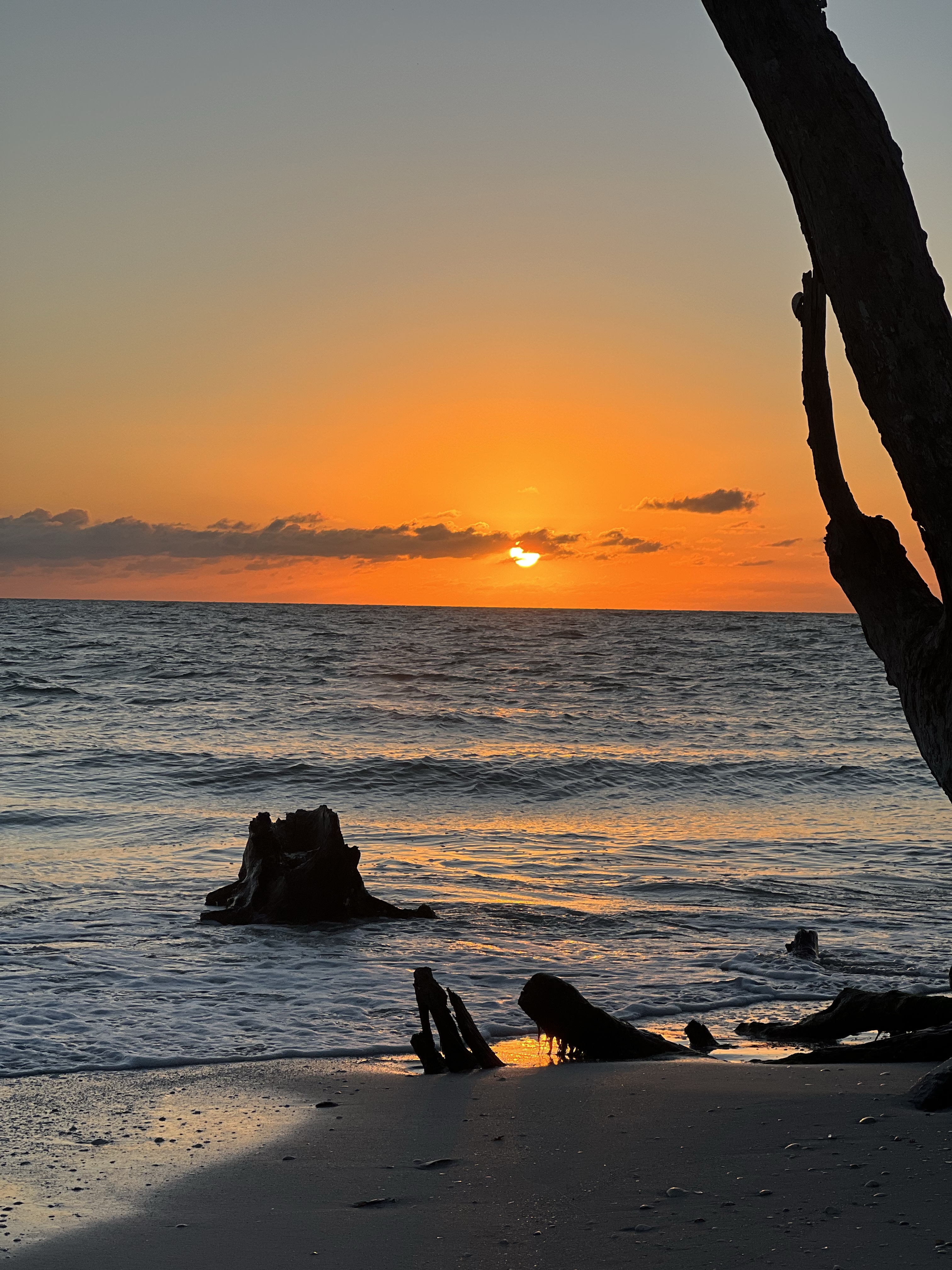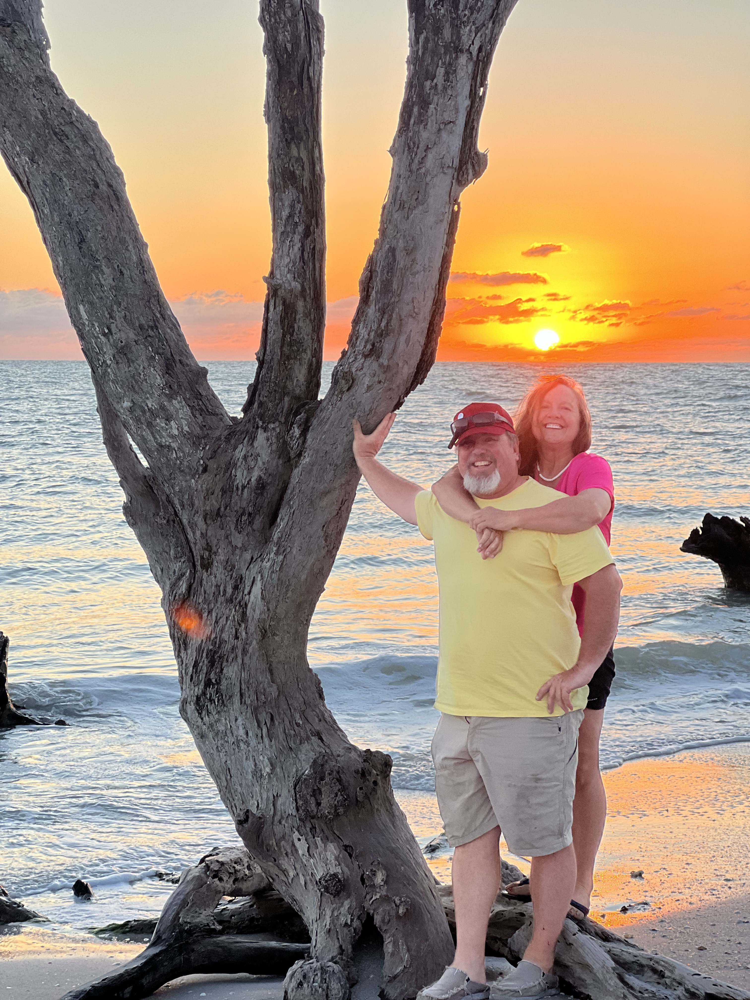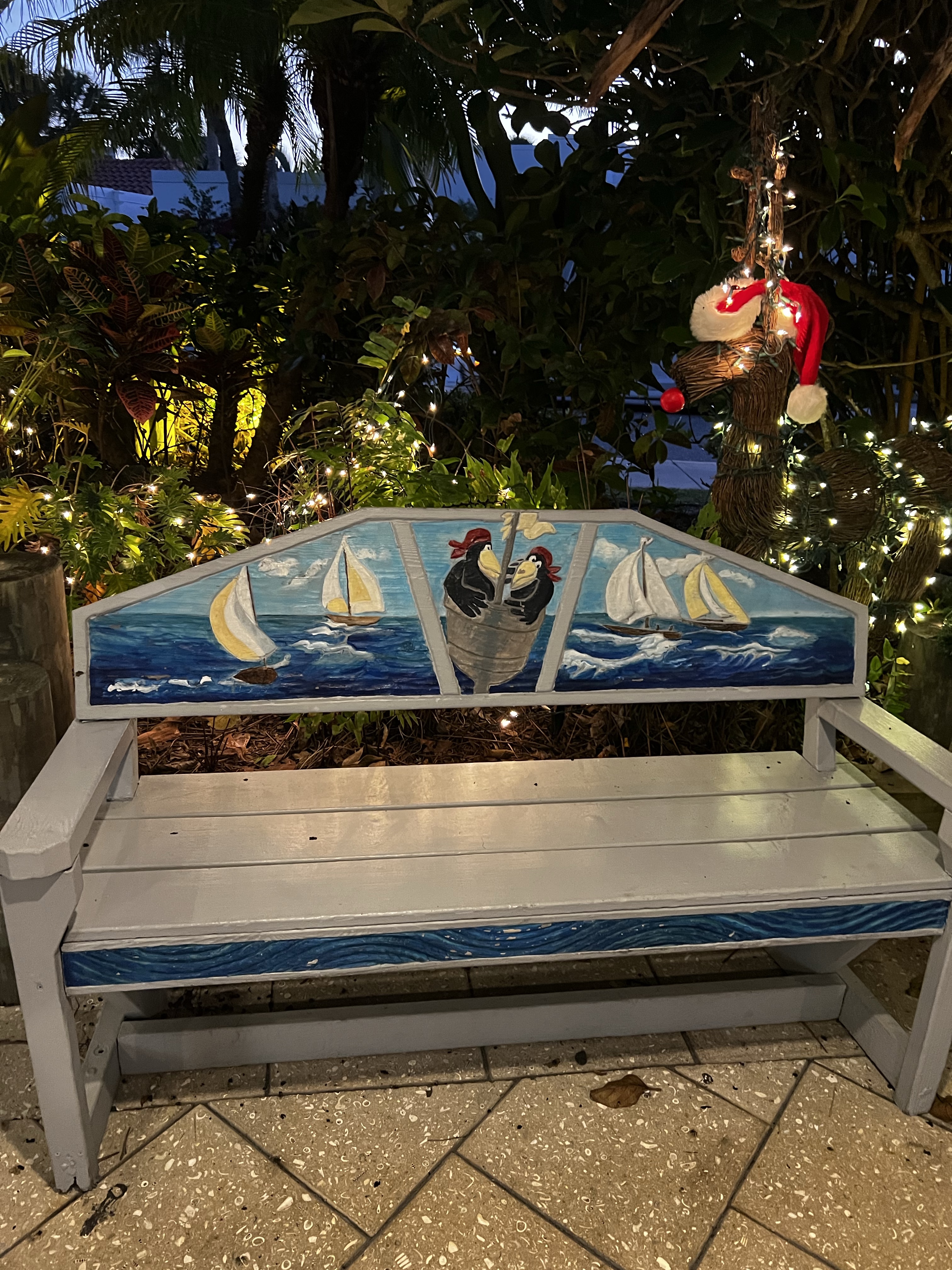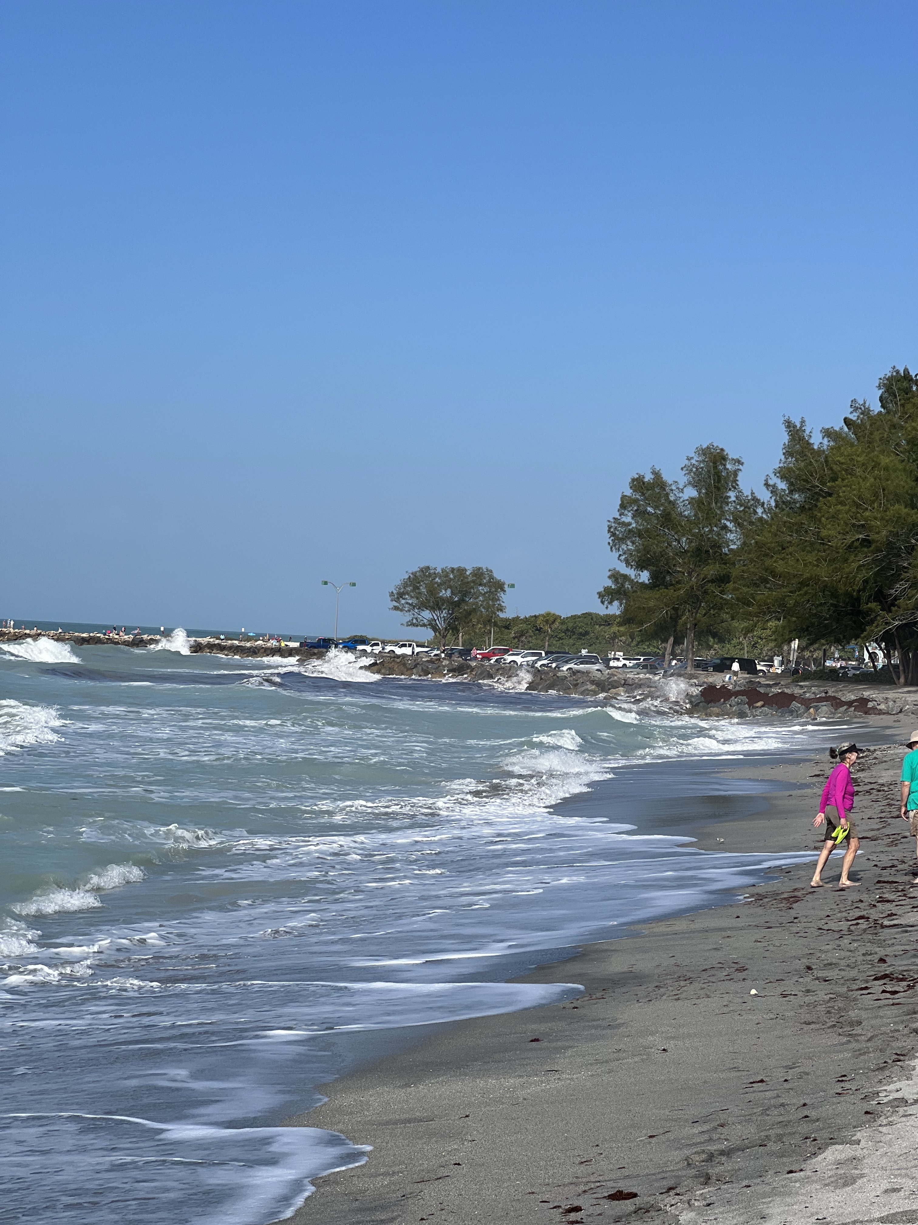 Today we shall explore the Venice beach and look for shark teeth!The winds are still very strong and the waves are high. So Steve Barry and I took off to the beach. Andrea was not feeling 100 percent and stayed behind. I was looking for the dolphin statue that used to stand in the middle of the parking lot but it wasnt there, I was sad. Anyway walking through the sand to the beach through a cute place in the trees with a bench and a neat pathway to the beach. We had a ball looking for the sharks teeth I found one and was so excited. We kept looking and looking buy never found another one. The ocean was rough and it was hard to keep digging through the sand and waves. After several hours on the beach we decided to dinghy back and get Andrea to see the sunset. It was a beautiful sunset and we found 4 chairs already on the beach so we sat and watched the gorgeous sunset. Leaving there we found some really cool shell pictures created by someone who loved to create obviously! We had a great night and are going to get ready for more adventures tomorrow. Enjoy the pics. Signing off for tonight!