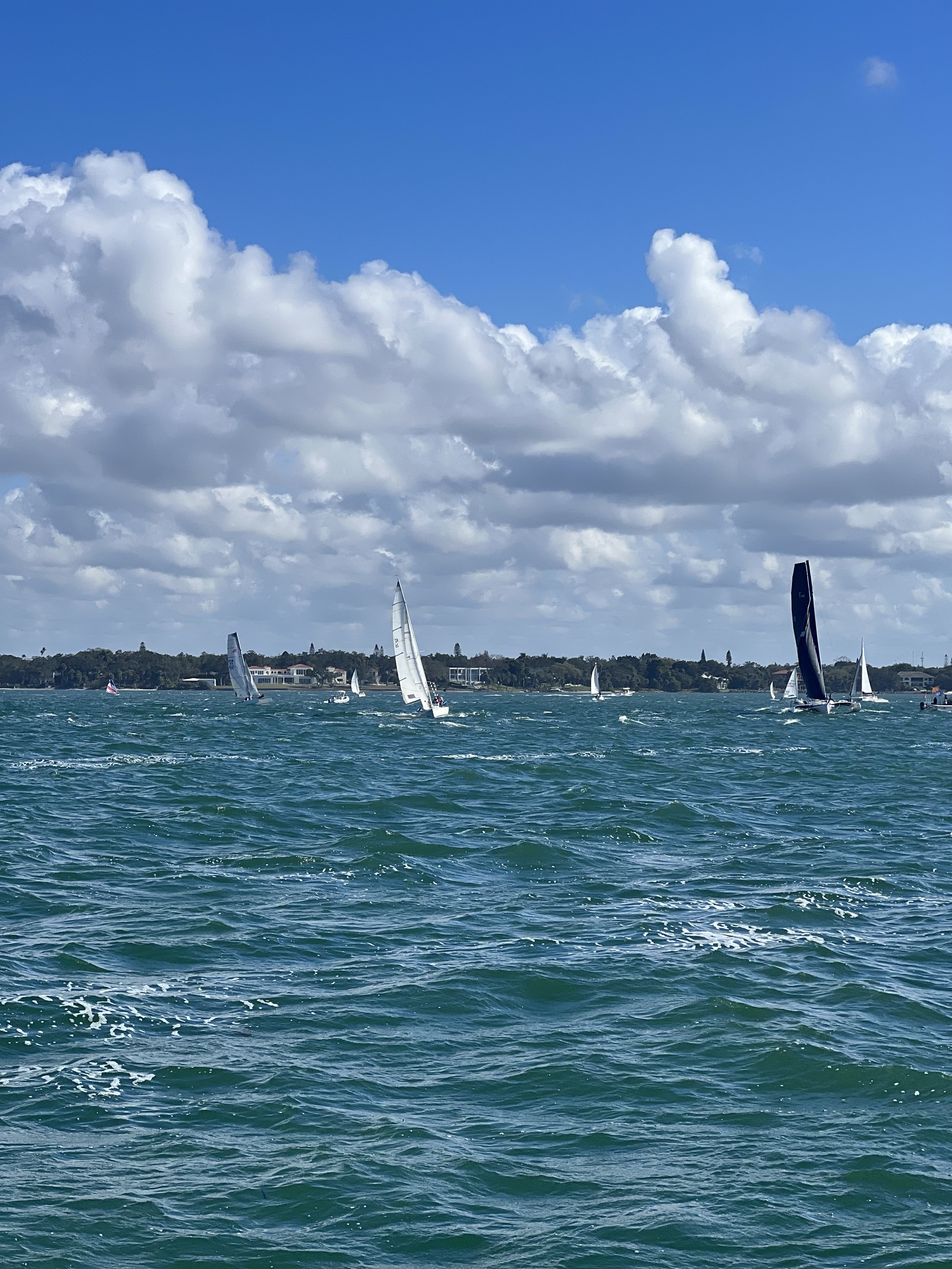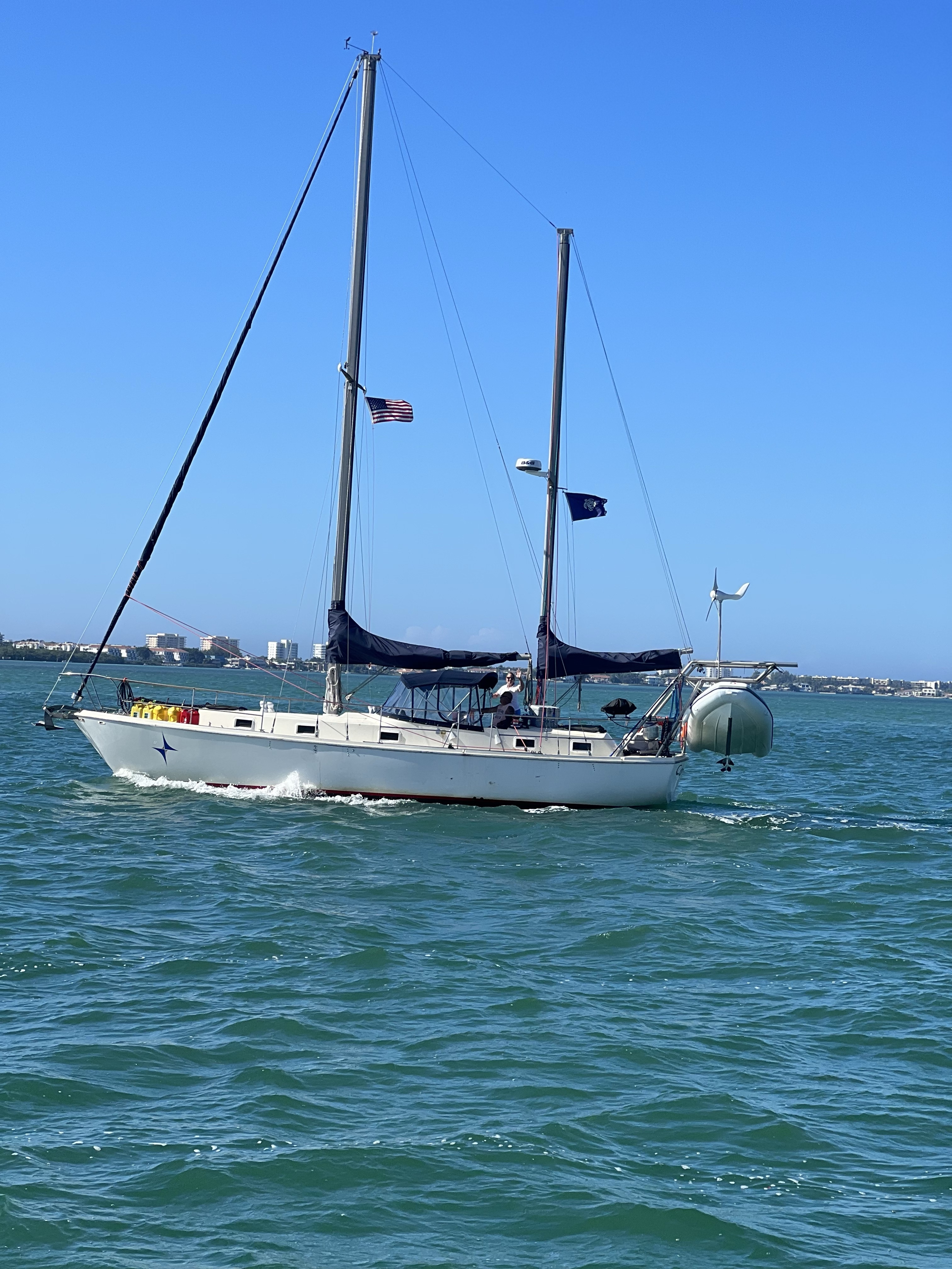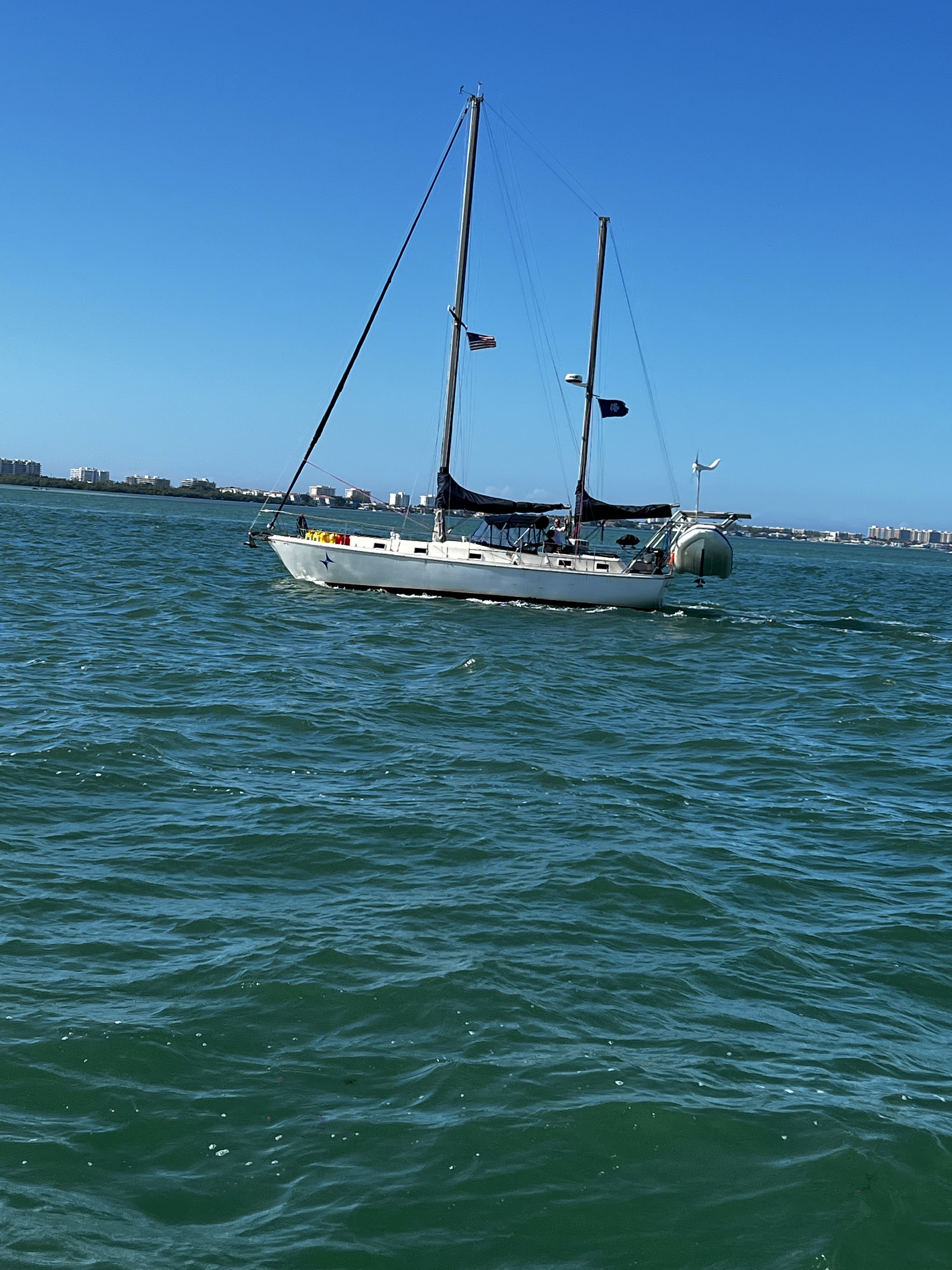 Started on our journey to Clearwater Florida today. It will be an overnight sail into the 17 so that we can leave for home on the 19th for Christmas. The day started out foggy and rough with no chance to stop on the way if conditions worsened. We put out the sails and as the saying goes “keep calm and sail on”. As the trip continued conditions lessened and was very pleasant overnight. We braved the rough waters and fog and had a great cruise to Clearwater. Arriving on the morning of the 17th we came into the narrow channel with the shallow water on either side and found a place to anchor in the anchorage close to the Clearwater Municipal Marina where we stayed before. They had no transient room for us due to increased boat travel since Covid was released. Caretta also found a place to anchor and we took some time to nap and then on to Clearwater. We went to the marina and made arrangements to dock our boats in two unused permanent slips that were available. They would not let us use the shower rooms until we were actually in the slips but later on they gave us the codes.(we had already paid for the slips). They were very nice. We walked down to Frenchys on the beach for some great food. It was really great to see all the places we were when we where there ten years ago. Taking the dinghy and just motoring around to find all the places we use to go. The dolphin aquarium, with other rescued animals there also. I think it is like an animal hospital. Anyway we came back to the anchorages where there are too many derelict boats,i think the homeless live in a few of them. Good idea really. If you ever meet me ask me this “three went out two came back”. It is a very good story. Signing off stay tuned.