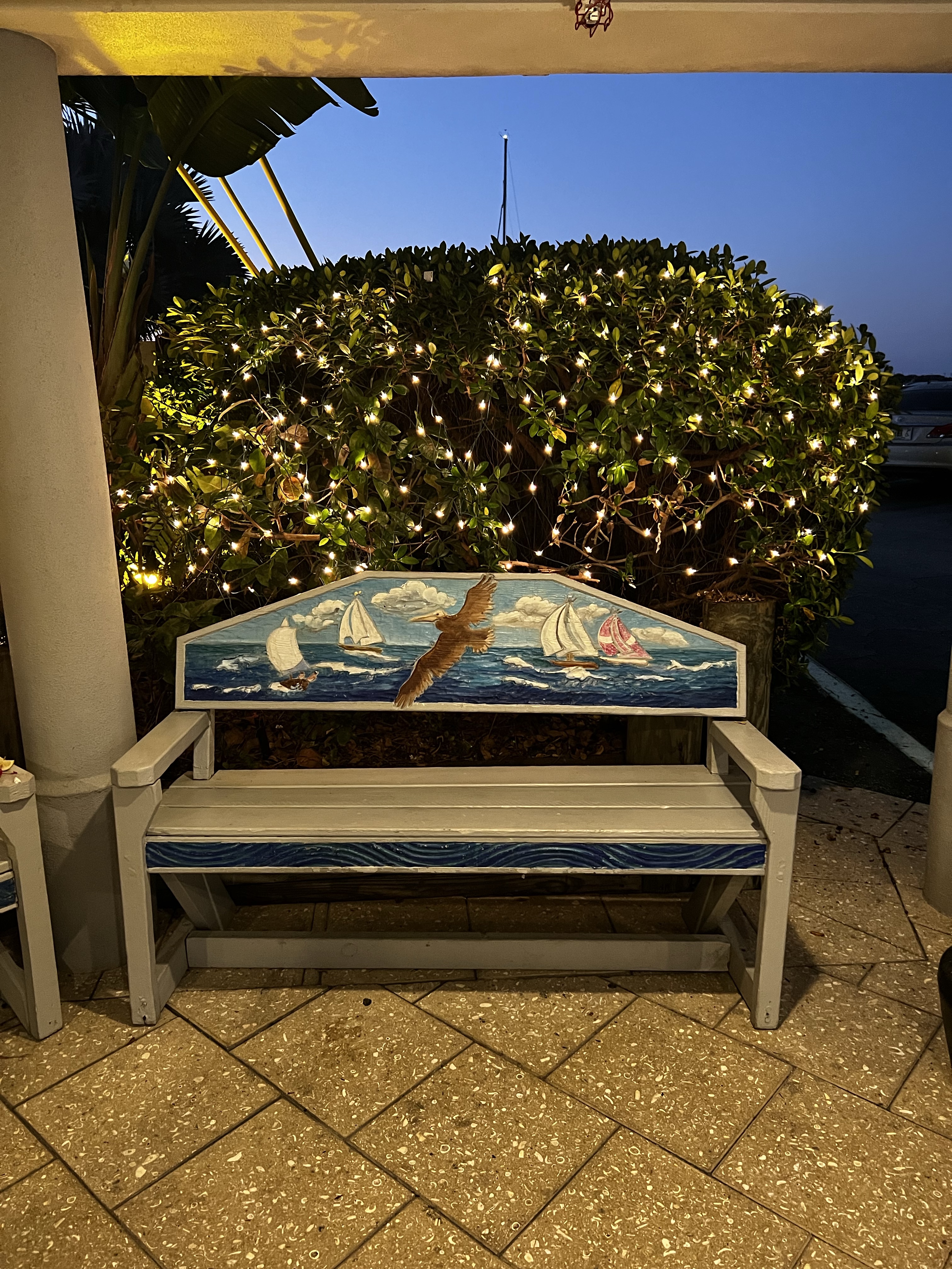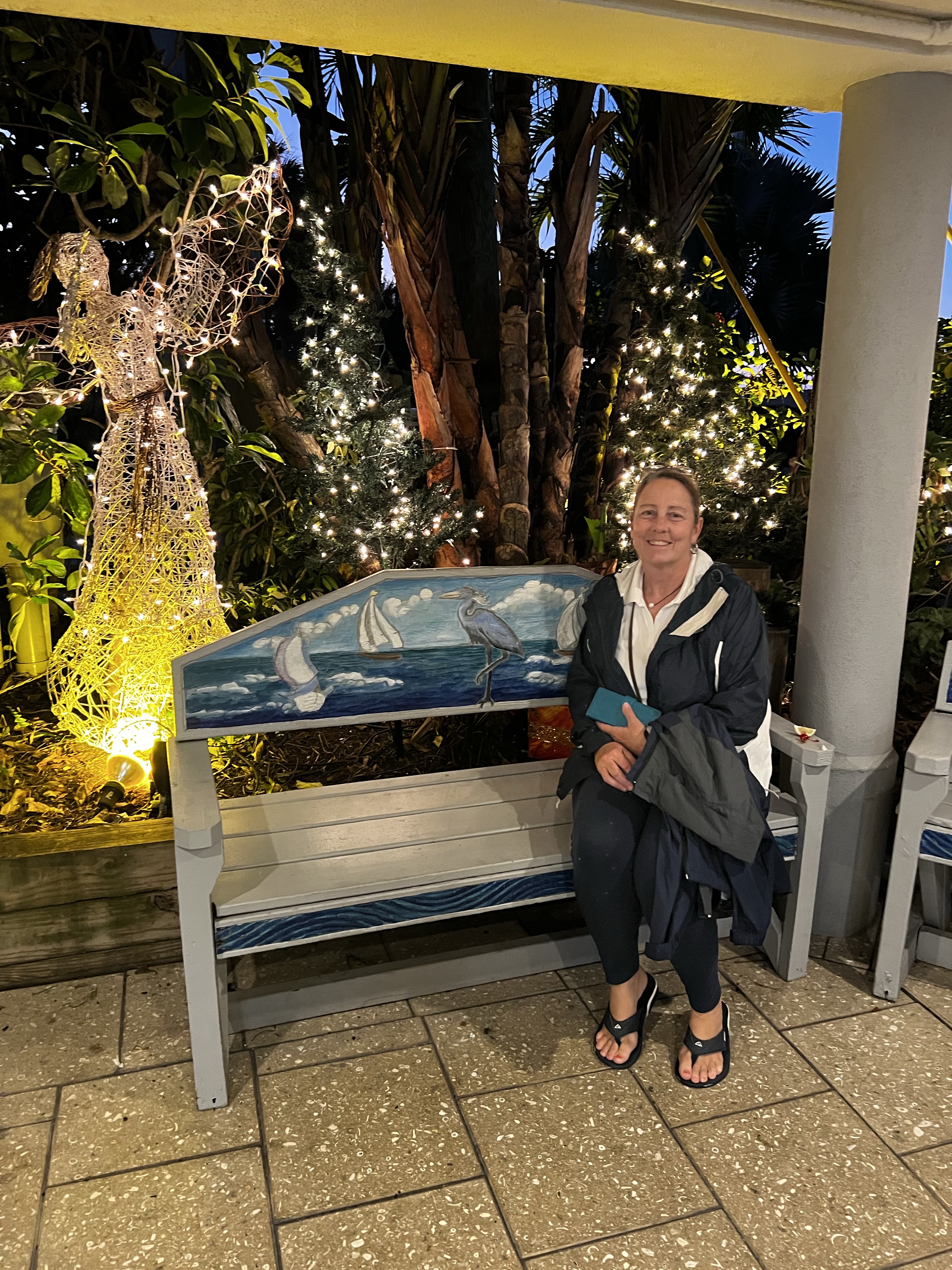 Quickly we realized that the anchorages were the same ones we anchored at in 2012 that left us on the hard ground and where we came to a sudden stop when leaving when our keel slammed into something very hard. SO we found a place that would stay deep enough where our boat would still be floating when the tide went out. Very hard to find a place to take dinghy until we ran into the yacht club member that let us know that the very end of the boat pier close to the road was empty and to dock there. He even gave us the code to the bathrooms and the shower(even though we didnt use them). SO we took off into the town of Venice toward a cool restaurant on the water. It only took a few minutes to get there walking down the sidewalk. There are a lot of condos in this town that are so cool. We went into the restaurant and it had some great food as well as some neat benches and decorations. IT also had the showers and washer/dryers in the bottom area close to the parking garage. They were actually the nicest showers and we had access to them because the marina was closed to boats due to the storm coming in couldnt take us so they gave us access to the amenities! We walked back to the dinghy then back to the boats to get a good nights sleep. More adventures tomorrow! Good night everyone.