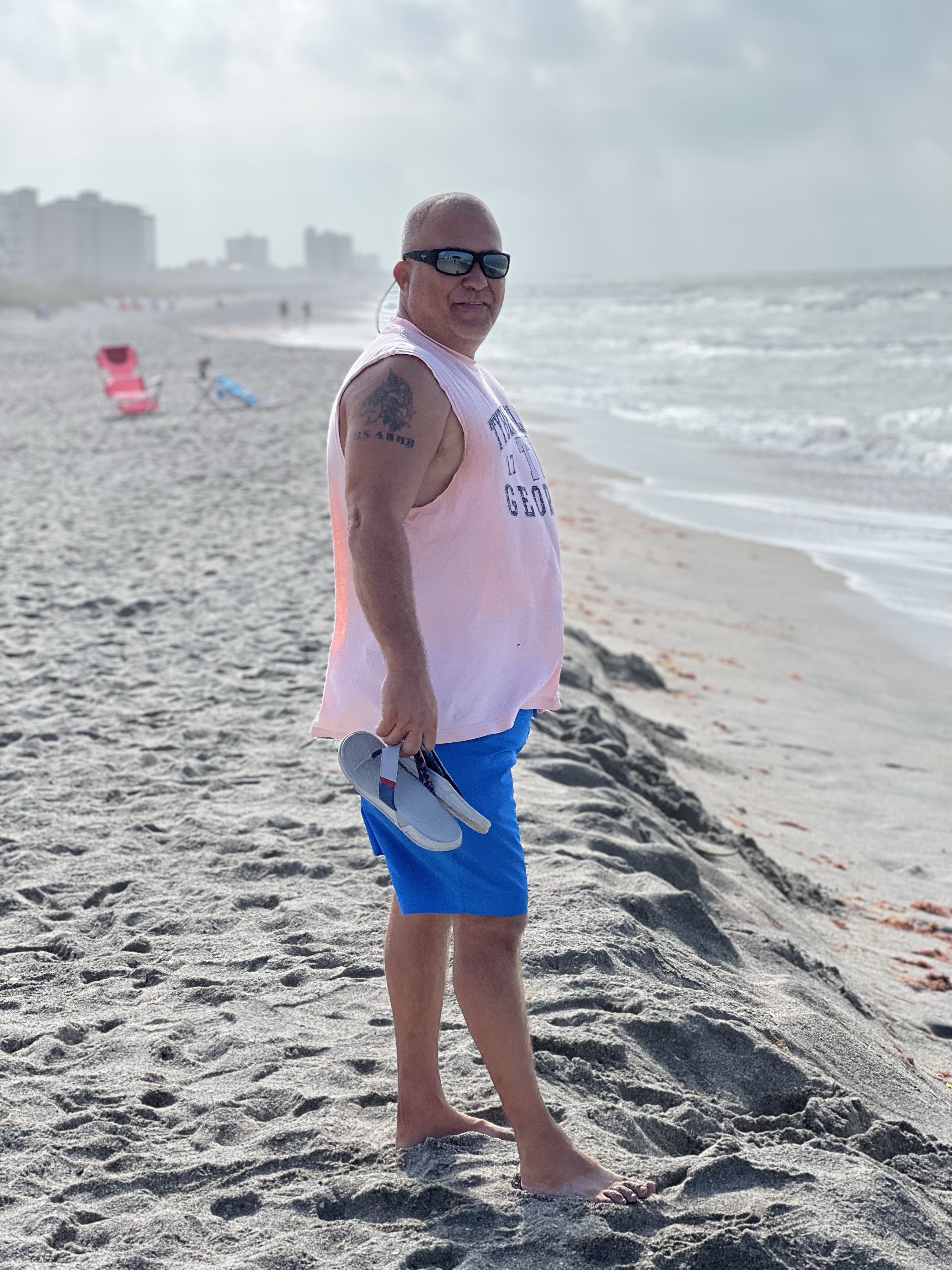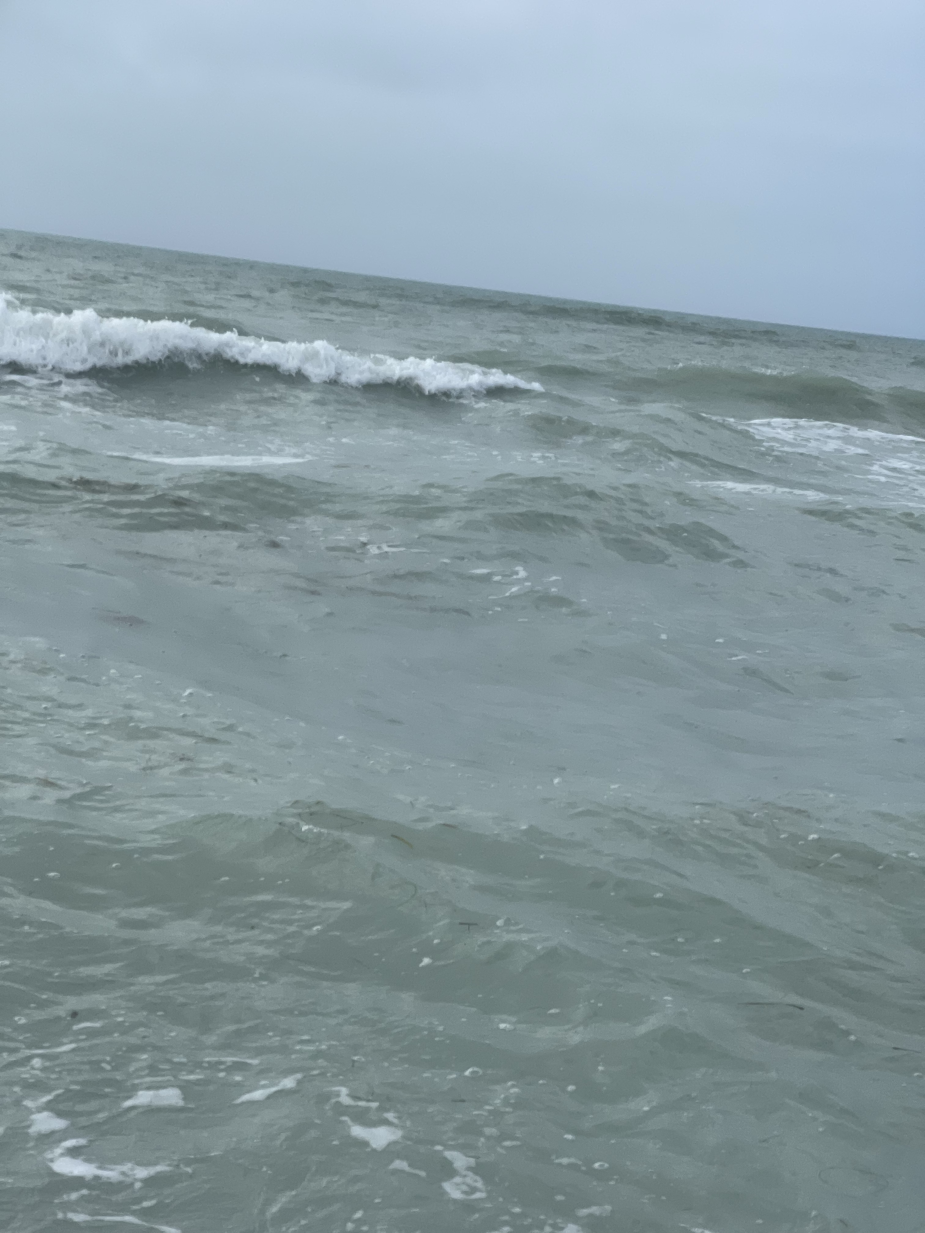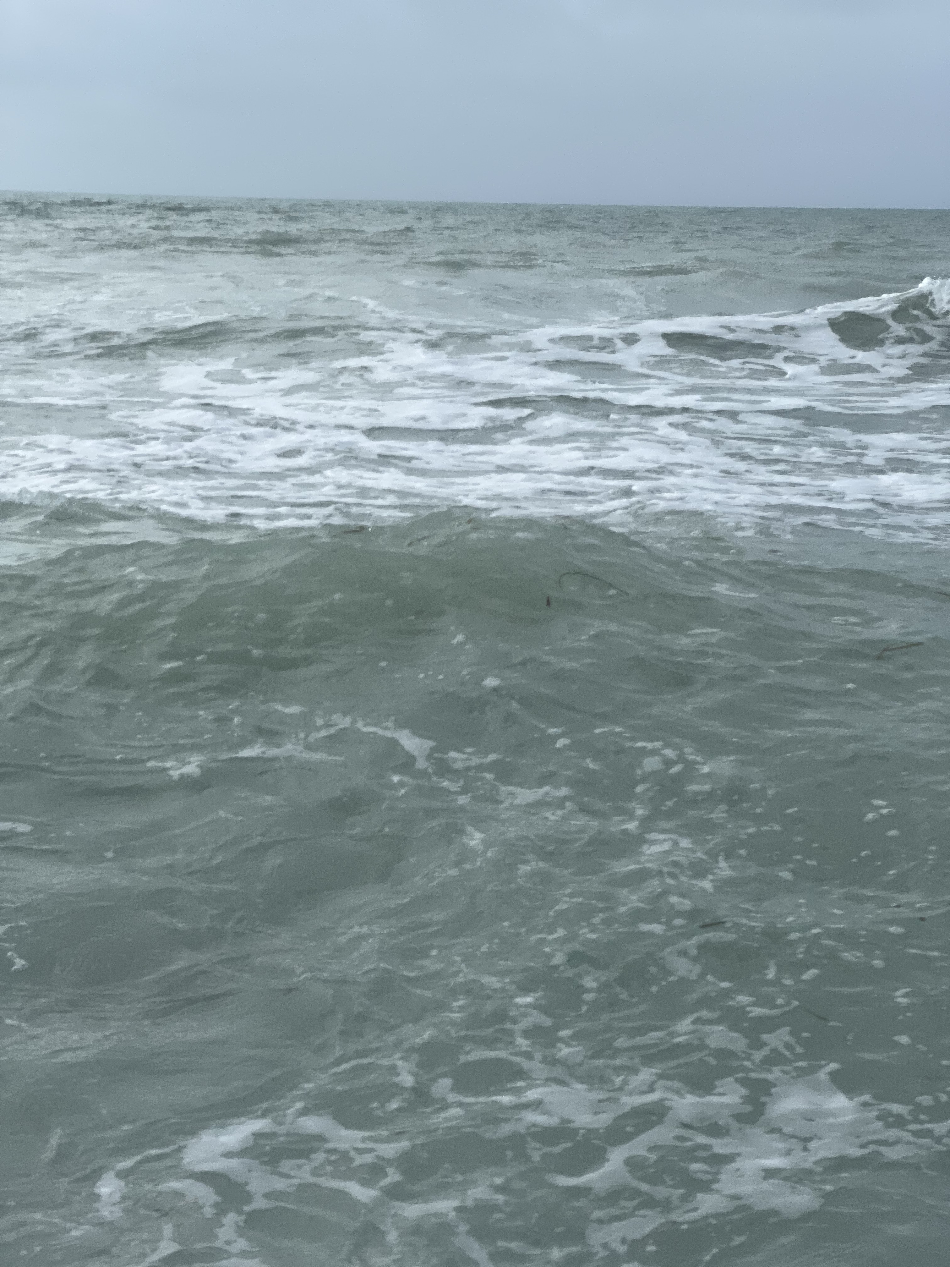 Got up early,and went to a restaurant that we heard about around the corner and down a canal. We waited on Barry and Andrea to drop their dinghy and off we ventured! We were unsure at first because it looked like it ended, but the canal turned right and we followed it. I could not believe what was back there! Beautiful houses, cute beach houses, docks with motorboats and beautiful scenery. As the canal got more narrow it maintained a deep path until we came to a little opening and saw a white picket fence and a place/wall to tie up at. It was the back of the restaurant with tables outside. We tied up walked the small sidewalk through the back door and were told it was a 10 minute wait for an outside table. Waiting outside we realized we were in a small mini mall area(very mini) with a craft shop(not open), a liquor store and several various shops. We were called to be seated and were given this great table on the end closest to the water. I saw kayaks tied together waiting on the group on shore to board them and explore away! It was very nice sitting there and very very peaceful. Great Breakfast would recommend this place to everyone who visits longboat key. The ride back was so nice seeing all the cool trees and houses. Got to speak to one of the home owners. He was very nice and getting his boat ready to take out. After breakfast we ventured back to the boat and loaded up for our trip to the beach and took the dinghy out to the little bay area, past the Shore restaurant and past the big house for sale around the corner (passing fellow sail boaters as we go) and under the very short bridge. Getting our dinghy stuck is very shallow water lol. Rocking it and backing up we got her unstuck and followed a very narrow path deep enough to get to a small beach area. SO many sea urchins and jellyfish around I had to watch my step when helping pull the dinghy onto the sandy area. Tying off to a mangrove limb I looked around and saw a lot of limbs lying around and grass growing up through the sand and realized that the little trail from that area lead right to the beach! We took our never used Tommy Bahama chairs along with Barry and Andrea and set them up on the beach right next to a cool set of huge rocks on the beach with the semi angry ocean pushing water up and over them creating little pools of water and shells in the washed out stone pockets of the rocks. The fog was so thick you could not see pass 30 yards and 50 yards it became blurry. It was a whiteout on the ocean.